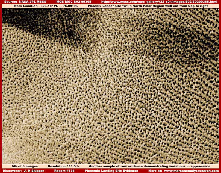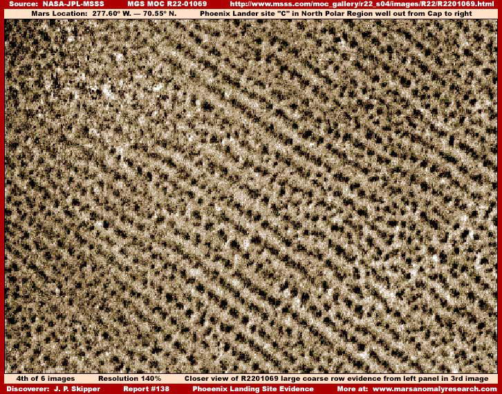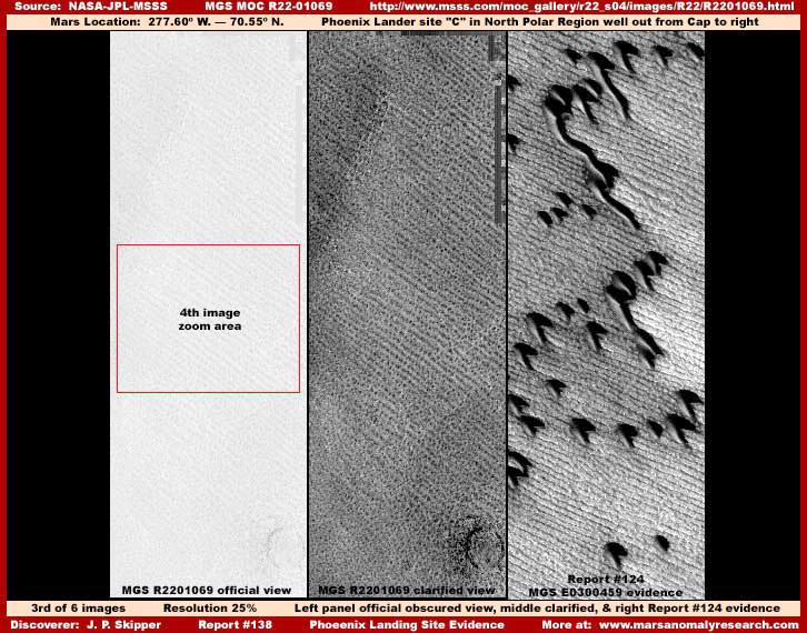 A fenti, harmadik felvételen különböző jellegű elemeket láthatunk. Mindegyikük ugyanabból a fotócsíkból való, annak egyik szélétől a másikig, azonban méretében lekicsinyítve, azért, hogy egymás mellé helyezhessük őket. a két bal oldali elem az MGS MOC R22-01069 jelű, keskeny látószögű fotócsíkból való, a „C” jelű területről, a Phoenix egyik kijelölt leszállási helyének térségéből. E két elem közül a bal oldali a hivatalosan kiadott, erősen zavaros látványt mutatja, míg kettejük közül a jobb oldali a Skipper által tisztított változatot, ez pedig már erősen emlékeztet biológiai élet-alkotta takaróra, a fotócsík egyik szélétől a másikig terjedően. Fontos tudni, a Phoenix számára kijelölt valamennyi terület a négy közül, tehát „A”-tól „D”-ig, meglehetősen zavaros, egy bizonyos szintig, ami már messze túl van azon, amit az MGS MOC felvételei esetén megszokhattunk a keskeny-látószögű fotók esetén. Továbbá, ez az összezavarási beavatkozás kiterjed a fotók környezetét ábrázoló nagylátószögű fotócsíkokra is. Ez az összezavarás társul a rendkívül rossz felbontási paraméterekkel, a távolság jelentős megnövelésével, minek következtében az egyedi objektumok alaposan összemosódnak, ezért a képalkotás eredménye teljes egészében felhasználhatatlan a felszínre vonatkozó valóság kiderítése kapcsán. A szemfényvesztés eredményeként az jön le, hogy viszonylag sima, a leszállásra alkalmas területet láthatunk. A megtévesztés részeként ritkábban alkalmazzák (merthogy kevésbé hatékony) a fehér fedőréteg felvitelét, ennek láthatjuk jó példáját a bal oldali képrészleten. A mi számunkra viszont jó, ha ezt teszik, ez derül ki a fentiekből, hiszen részben leküzdhető ez a fajta hamisítási technika, minek köszönhetően némileg több részlet válik felismerhetővé – Skippernek köszönhetően a középső képrészleten. Természetesen továbbra sem figyelhetünk meg egyedi objektumokat, ám jobban szemügyre vehetjük a párhuzamos vonalak sorát, mint a felszín alapmintázatát. Következtetést is le tudunk vonni: ez a mintázat jóval nagyobb területre terjed ki, és kellően számottevő ahhoz, hogy a lerontott felbontáson és a távolsággal manipuláló hamisítási technikán is átüssön. A harmadik képrészlet, a jobb oldalon, egy 2007-es beszámolóból való, címe: „Biológiai élet a Mars Északi Sarkvidékén”, maga a részlet pedig az MGS E03-00459 jelű keskeny látószögű fotócsíkból való, az összehasonlítás kedvéért. Az ok, ami miatt elhelyeztük itt az, hogy igen hasznos lenne, ha mindenki elolvasná az említett beszámolót és megismerné alaposabban a részleteket, a párhuzamos vonalakba rendeződő, a hivatalos álláspont szerinti „dűnesorok” mibenlétéről. A hivatkozott E03-00459 jelzésű fotón látható helyszín nem szerepel a Phoenix lehetséges leszállási területei között, nagyjából félúton helyezkedik el a bal oldalon található, „D” feliratú térség és a jégsapka között; így csupán azt szeretnénk érzékeltetni, milyen tekintélyes méreteket ölt az Északi Sarkvidék térségében a párhuzamos mintázatot magán viselő megjelenési forma. Ez a beszámoló egyfajta kiegészítőként is szolgál az említetthez, így bárki számára világosabb lehet a „dűnékre” vonatkozó hivatalos álláspont tarthatatlansága. Mélyebb bepillantást nyerhet bárki, hogy a „dűnéknek” titulált objektumok a legkevésbé sem azok. Hanem valami lényegében és egészében más dolgok, élő dolgok, még ha számunkra ismeretlen formák is.