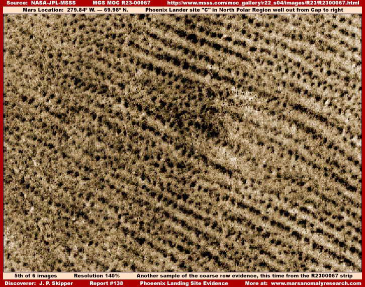 A fenti, ötödik felvétel ugyancsak a Phoenix számára kiválasztott „C” leszállási területről való, azonban egy egészen más, ezúttal az R23-00067 jelű keskeny látószögű fotócsíkból való. Csak azért illesztettük ide, hogy további példával szolgáljunk a szóban forgó párhuzamos sorokba rendeződő mintázat elterjedtségére, arra, hogy véletlenül sem korlátozódik egyetlen fotócsíkra. Elnézést a homályos megjelenésért, de minden egyes fotócsíkot ilyen módon hamisítanak. Szerencsések vagyunk, ha találunk olyan részleteket olykor, melyek mentesek ettől, s ezáltal kissé mélyebbre tekinthetünk a valóság mibenlétébe.