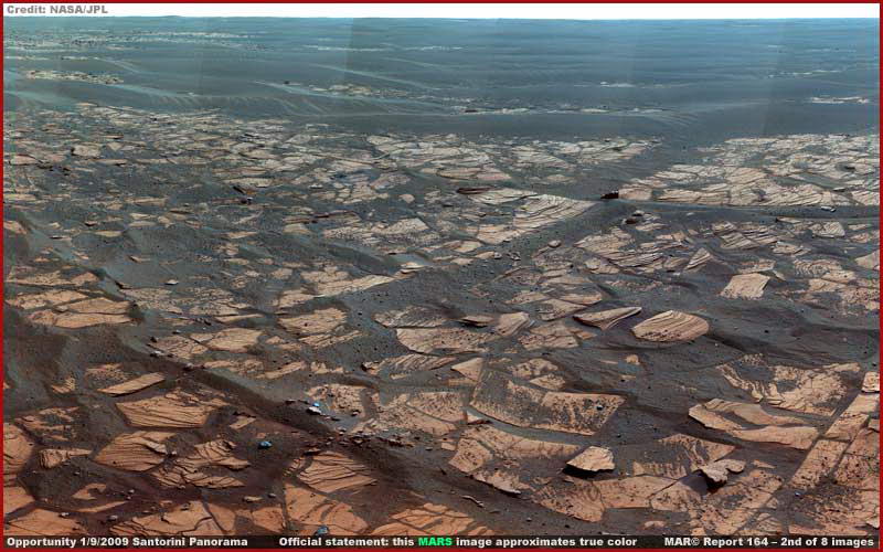 Ez a beszámoló nem teljes mértékben a Marson található figyelemre méltó képződményekről, objektumokról szól, hanem igyekszik további bepillantást adni a képhamisítási megoldásokba, legalább alapszinten. Színes képekkel kezdjük, aztán átváltunk fekete-fehérekre, összevetjük azokat a színesekkel, majd megmutatjuk mennyire könnyű meghamisítani egy felvételt digitális technika alkalmazásával. A fenti, első és második, felvétel csak két alappélda a számunkra kiadott hivatalos marsfelvételek közül, állítólag a valódi színeket látjuk. Mindkét fotót az Opportunity marsjáró kamerája készítette, több darabból összeállított mozaikok, egy-egy évvel ezelőtt. Az első igen erős narancssárga színt visel magán, a legjobban az ég színén látható, a második ellenben erősen kékes, egyaránt jól kivehető ez az árnyalat az égen és a felszínen is a háttérben. Fontos megjegyezni, a felvételeken semmiféle változtatás nem történt, ugyanebben a formában jelentek meg a hivatalos forrásokban. A fenti hivatkozások - az egyes fotók alatt - elvisznek a képek hivatalos honlapjára, ahol tekintélyes mennyiségű leírást is találhatunk mindkettő mellett. Mindkét csatolt szövegben az szerepel, hogy a Mars hozzávetőlegesen valós színeit látjuk. Mindenkinek el kellene tűnődnie azon, vajon miként lenne ez igaz, pláne, ha tekintetbe vesszük a nagyon erős, egymástól lényegében különböző, a fotók minden részét teljes egészében betöltő színréteget. Kétség sem férhet hozzá, a „valós szín” fogalmat hivatalos szinten meglehetősen lazán kezelik… Természetesen ez az eljárás egyaránt igaz a Spirit és az Opportunity marsjárók képeire is. Azok, akik figyelemmel kísérték az itt közzétett munkákat, illetve saját kutatást végeztek, pontosan tudják, mi az, amit a széles nyilvánosság számára juttatnak, mint „nyers” képeket, melyek minden esetben fekete-fehérek, soha sem színesek. A legtöbb esetben, amikor ezeket a „nyers” képeket egyesítik mozaik elemekként egy nagyobb felvétellé, akkor már megjelennek a színek, ám nem minden alkalommal. Jellemzőnek tekinthető ez az eljárás a nyilvánosságra hozott felvételek esetében ugyanúgy, mint a két fenti kép alkalmával is. Úgy tűnik tehát, a dolog tendenciózus, igyekeznek eladni valós színű képeknek a lényegében hamis színes összeállítást. Ha így van, s talán elég sokan lehetnek, akik ezzel még nincsenek tisztában, miként esetleg azzal sem, hogy a marsjárók két panoráma kamerával dolgoznak, mindkettő természetesen tökéletes színösszeállítású fotók elkészítésére alkalmas. Egyaránt 8 színszűrőt tartalmaznak, 6 teljes mértékben lefedi a látható színképtartományt, pedig csupán három is elegendő lenne – piros, zöld és kék – az emberi szem számára hiteles színek visszaadására, az általunk leginkább megszokott látvány szolgáltatására. Az emberi szem/agy képes azonnal feldolgozni a színeket, mihelyt meglátja. Miként azt gondolhatjuk, a marsjárók esetében a dolog nem így működik. A helyes színeket nagyon egyszerű visszakapni, mindösszesen annyit kell tenni, hogy az alap - piros, zöld és kék – színszűrőkkel külön-külön leképezzük a tájat, majd ezeket a képeket később egyesítjük, megfelelő számítógépes programmal, már meg is kapjuk a valós színeket. Azaz, amennyiben hat színszűrőt alkalmaznak a látható tartományra, akkor még sokkal kifinomultabb és színhelyesebb a kép. Legalábbis kellene… Tény, nem minden egyes ember érzékeli pontosan ugyanúgy a színeket, és eltérés van a számítógép monitorokban is, mégis, a „megközelítően” színesnek meghatározott felvételek bizony hamis színesek. Az alábbi hivatkozásokat érdemes felkeresni a marsjárók panoráma kameráinak pontosabb megismerése érdekében.