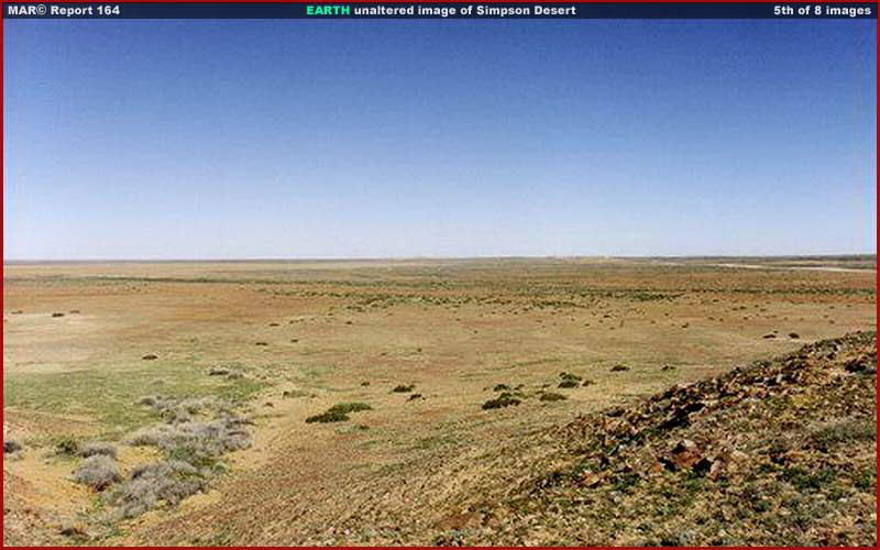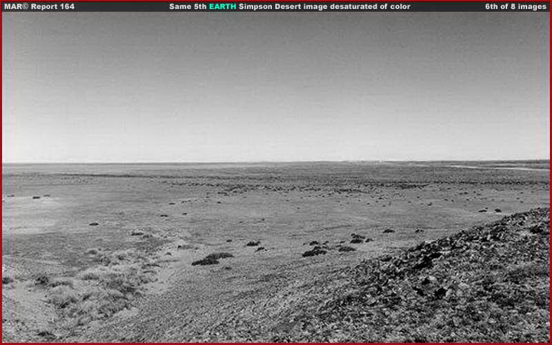 A fenti, ötödik és hatodik felvétel egyaránt a Simpson sivatagban készült. A különbség csupán annyi, hogy míg az 5. felvétel az eredeti színeket tartalmazza, a 6. képről ezeket Skipper kivonta, s maradt a fekete-fehér árnyalat. Ezen kívül semmiféle más változtatást nem eszközölt. Könnyű belátni, semmiféle olyan nyomot sem észlelhetünk a képen, ami bármiképpen is utalna biológiai életre (teszem azt: magas fák, nagy bokrok, stb.) és ebben a tekintetben tökéletesen megfelel a nyilvánosságra hozott, a marsjárók által bemutatott kopasz tájakhoz. Mégis, ezen az élet számára szélsőséges földi helyszínen mennyire szuggesztív és bizonyító erejű e tekintetben a színes felvétel, ahol a valós árnyalatokat láthatjuk, miközben valamennyi életre utaló nyom eltűnik a fekete-fehér képről. Ha még jobban tömörítenénk a fekete-fehér változatot (nem tettük), és adnánk némi maszatolást hozzá, főleg az alacsony bokrok térségében, a hatás tökéletes lenne, és a világon senki sem tudná megmondani, hogy a helyszín valójában nem a mars! Amit érzékeltetni szeretnénk az a következő: amennyiben elvesszük egy felvételről a színeket, az általa hordozott képi információ mértéke drasztikusan csökken. Egy fotót megfosztani a színeitől csak egy gyors kattintás és máris kész. Vagyis rendkívül egyszerű és semmiféle erőfeszítésbe nem kerül. Ezek után már nem nehéz megérteni, vajon miért csakis és kizárólag fekete-fehér felvételeket hoznak számunkra nyilvánosságra. Óvatos kutató számára természetesen azonnal gyanút ébreszt a dolog, holmi költségtakarékosságról szóló hablatyolás, a nyilvánosságra hozott felvételek minősége kapcsán pedig hidegen hagyja, mert egész egyszerűen nem igaz, a fekete-fehér felvételeket illetően. (Természetesen nem a nyomdatechnikai megoldásokra gondolunk.)
