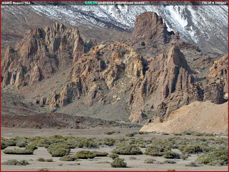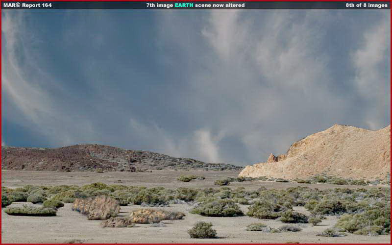 Ezzel el is érkeztünk az utolsó, a hetedik és a nyolcadik felvételhez. A hetedik felvételen teljes színeiben pompázó földi tájat láthatunk, Skipper semmiféle változtatást nem hajtott végre rajta. A következő, nyolcadik felvételt továbbra is színesben láthatjuk, ám magasságát Skipper lecsökkentette, és egyéb változtatásokat is bevetett. Ne felejtsük el, nem volt szándékában marsi megjelenést kölcsönözni a tájnak, a részletgazdagságot sem akarta megváltoztatni. Csupán bemutatni szeretné, mennyire könnyű egy tájkép teljes látványvilágát megváltoztatni, csökkenteni/megsemmisíteni az általa hordozott információt, még akár egy nagyméretű színes felvétel esetében is, anélkül, hogy jelentősen kisebbítenénk a méretét, kivonnánk a színeket és csak a fekete-fehér árnyalatokat hagynánk vissza, lerombolnánk a felbontást, összemaszatolnánk, vagy más egyéb, előszeretettel használt képhamisítást eljárást alkalmaznánk. Amit elsőre is azonnal látni lehet az az, hogy Skipper teljes egészében eltüntette a háttér hegyeit, hamis égbolttal és felhőkkel helyettesítette. Ha valaki utána számol, ez az egyszerű beavatkozás-féle megsemmisítette az eredeti képi információ 65-70%-át, és hamis információkkal helyettesítette azokat. Gondoljuk csak meg. Mi van, ha pontosan ez történik a Mars esetében is, ahol a marsjárók magas épületeket látnak a háttérben, azokat egészen egyszerűen kicserélik sziklás hegyekre. Egyből másként fest a horizont, nem igaz? Ez a legnyilvánvalóbb megoldások egyike, de természetesen még nagy felbontáson végzik el, és a beidézett példából azt is láthatjuk, hogy számos dolog egyszerűen eltűnik az előtérből, annak is különösen a bal oldaláról, a nyolcadik felvételen. Menjünk vissza a 7. felvételhez, hasonlítsuk össze a 8-kal és máris meglátjuk. Skipper a beavatkozást nagyjázva végezte, és mégis, egy igen alapos képvizsgálat is csak nehezen tudná kimutatni a beavatkozás tényét. Természetesen ne felejtkezzünk meg arról, hogy a nyilvánosságra hozatal esetén nincs lehetőségünk az előtte és az utána következő állapot megtekintésére, a képet elemzőkben tehát fel sem merül a kérdés ilyen típusú hamisítások megléte iránt. Látható, hogy Skipper a növényzet egyes csoportjain is változtatott, eltüntetve őket, csupasz sziklákat hagyva hátra. Éppen ugyanazt tette, mint amit a marsfotókon alkalmaznak előszeretettel. Azokon is sziklákat láthatunk, de ki tudja mi volt ott korábban? Ha alaposabban megvizsgáljuk a fotókat, ezeket a beavatkozásokat is szinte lehetetlen kimutatni, kitűnően megfelel tehát a biológiai életformák nyomainak megsemmisítésére. Tökéletesen alkalmas a félrevezetésre is, ugyanis innentől kezdve azon lehet polemizálni, hogy miféle „sziklákat” láthatunk, ahelyett hogy a miféle „bokrokat” témát vizsgálnánk. Némi további erőfeszítés árán, minden egyes bokorral elvégezhetnénk ugyanezt, és továbbra is amatőr szintű munkánál tartunk, miáltal tökéletesen valósághű sziklamezőt állítanánk elő. Ez utóbbi beavatkozás is igen durva, átlagos elemzőnek fel sem tűnne, még egy szakképzettnek is nehezen, akkor mit gondolhatunk a profi számítógépes programok segítségével végzett képhamisítási beavatkozásokról? Ha grafikus szakképzettsége lenne Skippernek, sokkal többet is kihozhatott volna ebből az átlagos felvételből, például a műholdas fotók esetében alkalmazott tisztítási eljárások alkalmazásával, ám nem grafikus, ilyen jellegű manipulálási eljárást nem vetett be. Skipper tehát meglehetősen amatőrnek tartja magát ilyen beavatkozások végrehajtásában, a saját technikai hátterével, akkor vajon mire lehetnek képesek a professzionális, Mesterséges Intelligenciával (MI) rendelkező szuperszámítógépek, a maguk hatalmas sebességével és grafikai eszköztárával hivatásos programozók keze alatt? Tisztában kell lennünk vele, egyetlen egy ember sem képes ilyen tömegű felvételt megmásítani. Egész egyszerűen túl sok kép van, s az egyes felvételeken nagyon sok figyelemre méltó a részlet. Folyamatosan kezelni ezeket, és megtisztítani a fotókat a nagyközönség számára nem kívánatos információktól, ráadásul meghatározott időkereten belül, sok ember számára nagyon sok ideig tartana. Az is elképzelhetetlen, hogy igen nagy számban találjanak hozzáértő és megbízható embert aki hallgat és befogja a száját pusztán lojalitási megfontolásból. Ez nem megy. Elképzelhetetlen sebességű, MI által vezérelt szuperszámítógépek képesek csak ekkora feladattal megbirkózni, a saját programjaik működtetése révén tanulni is tudnak, ezáltal még hatékonyabbakká válnak az általuk alkalmazott eljárások kivitelezésében, és mindösszesen csak néhány ember felügyeletét igénylik. Először is kell egy helyszín, aztán minden térképészeti részletet előállít a grafikus számítógépes program. Talán túlságosan technikai jellegű a megfogalmazás, ám igen hasonlatos az eljárás egy közönséges másológéphez, mely minden egyes részletével együtt beolvassa a dokumentumot. Ezt követően a MI döntéseket hoz, mi maradjon és mi tűnjön el, mi legyen eltakarva, felhasználva ehhez a megfelelő számítógépes rutineljárásokat, elkészül a tudóstársadalom és a nyilvánosság számára is eljuttatott „feldolgozott” kép, az előre meghatározott kívánalmak szerint. Ugye senki számára nem fér kétség ahhoz, hogy egy MI számítógép képes tanulni? Történelmi folyamatát tekintve, a képek meghamisításának technikája egyre tökéletesebb, teljesen valósághű felvételeket láthatunk. Kétségtelen, az MI számítógépeket kezelő, a titkos hatalom kötelékébe tartozó szakemberek ugyancs