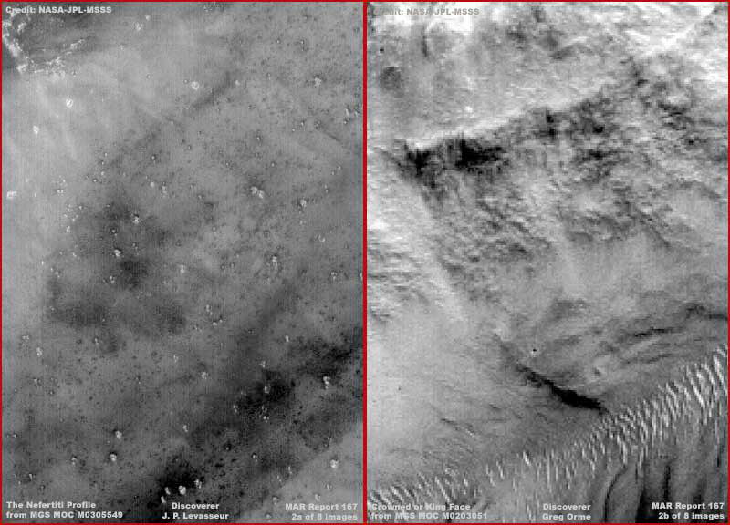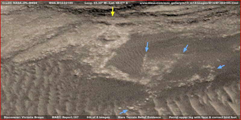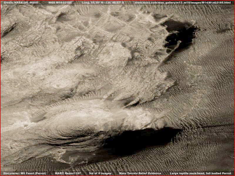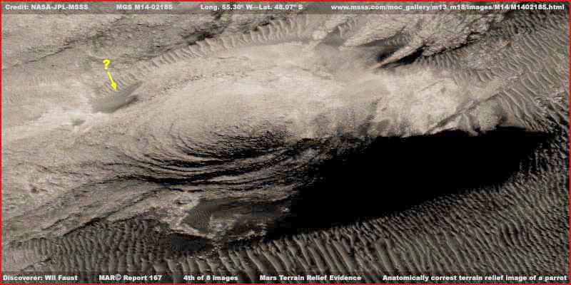A fenti első és második osztott felvétel csupán emlékeztetőül szolgál néhány különleges marsi, relief-jellegű formára, melyeket számos más ismert mellett fedeztek fel az elmúlt évek során. Sokan láthatták már ezeket más internetes oldalakon korábban. Ha mégsem így lenne, a fenti hivatkozások elvezetnek azokra az oldalakra, ahol jobb felbontáson vizsgálhatjuk meg őket, és értekezéseket is találhatunk mellettük. Valamennyi alapos vizsgálatot igényelne, s mivel ellentmondásosak, mindenkinek önmagának kell eldöntenie, vajon jelentős információtartalommal bír-e számára vagy sem. Csak példaként mutatjuk be ezeket, hiszen jó néhány található ezekből a relief-jellegű formákból a korábbi Viking és a sokkal újabb MGS felvételeken. Ami már kevésbé ismert a nyilvánosság számára az a Papagájföld, Wil Faust fedezte fel és az angol nyelvű oldalakon „Parrotopia” hivatkozás alatt találhatunk rá. Nem vált olyan híressé, mint a többiek. Talán azért, mert Will Faust nem volt jelen akkoriban az interneten, amikor a felfedezést tette. Továbbá, nem sokkal a felfedezését követően meghalt, kicsúszott a dolog a figyelem középpontjából ővele együtt. Az is közrejátszhatott, hogy ilyenféle felfedezést tenni meglehetősen valószínűtlen dolog, teljesen hihetetlennek ítélték és ezért bizonnyal hamisítványnak. Ám nem hamisítvány, az eredeti felvétel megtalálható az MGS MOC M14-02185 katalógus szám alatt, először ez jelent meg, majd később, 2005.08.22-i dátummal a MOC2-1191 számú tudományos adat. Skipper már régóta tisztában volt ezzel a felfedezéssel, ám nem vette eleinte túlságosan komolyan, akkoriban túlságosan különösnek tűnt számára, és nyomás alatt is volt. Azután, nagyjából egy évvel ezelőtt, közelebbről is megvizsgálta, és úgy találta, sokkal több van a dologban, mint ahogy azt első ránézésben észreveszi az ember. Szándékában volt külön beszámolót szentelni neki korábban, azért, mert további objektumok, ugyanezen a helyszínen, elkerülték Faust és mások figyelmét, ám félretette, és szinte el is feledkezett róla. Később egy elemző, Victoria Brown, aki egyébként szereti a papagájokat, neki is jó néhány van, mostanában ismét felhívta az alakzatra Skipper figyelmét. Az ő lelkesedése vezetett a beszámoló ezen részének megírásához, ahogy az az alábbiakban olvasható.