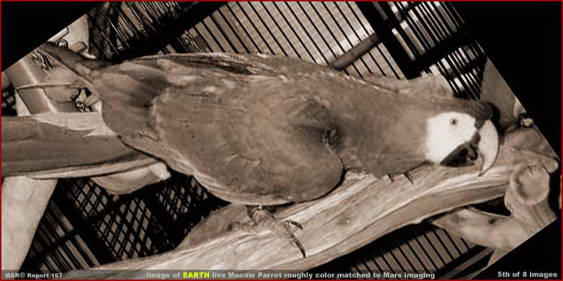 Ha valaki számára esetleg nem lenne ismerős a makaó papagáj, annak profil nézete, megtekintheti egyik példányát a fenti, ötödik felvételen, az egyik földi makaó papagáj példányt mutatja. Miként erről bárki meggyőződhet, a testtartásukban fellelhető minimális különbség kivételével a két forma azonosságának mértéke drámai. A földi papagájról készült fotó eredetileg színes volt, ám kivettük a színeket, hogy a marsi papagájjal az összehasonlíthatóság teljesebb lehessen. A két papagáj megfeleltetése így könnyebb, hiszen a földi példány ragyogó színeket visel, és azonnal magával ragadja a tekintetet, kevéssé tud figyelni az összképre. Egy észrevehető különbség, hogy a marsi papagáj jobb szárnya közelebb van a testéhez és szorosabban zárul hozzá, emiatt a jobb lábának egy része szabadon marad, miközben a földi papagáj lábának felső részét eltakarja a madár jellemzően nyitott jobb szárnya. További különbség, hogy a földi papagáj jobb lábán a jobb szélső ujj a látható három közül egyértelműen hátrafelé mutat mintegy hátsó ujj, vagy karom. A földi papagájok egy része olyan mint ez. Különbség még, hogy a marsi papagáj felső csőre kissé testesebb, mint a földi makaó papagáj felső csőre. Az összehasonlítást lehetne még folytatni jellemző eltéréseket keresve.