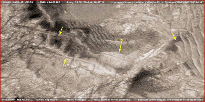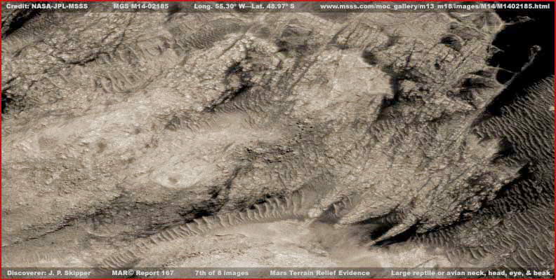 Lehetséges, hogy amikor ezt a bizonyos geometrikus hálózatot nézzük, lényegében egy régóta elhanyagolt régészeti feltárási területet látunk, egy jóval ősibb területen. A feltárás laza hálózati rendszer szerint folyt, s eközben néhány lehetséges ősi romot és/vagy csatornarendszert ástak ki, melyek akkoriban voltak használatosak, amikor a vízszint még sokkal magasabb volt e helyszín alacsonyabban fekvő részein. Ennek a területnek a legjobban kivehető részét a fenti, nyolcadik felvétel mutatja be. Amit fontos megérteni e helyszín kapcsán az, hogy minden, ami itt van, nagyon régi és régóta magára hagyatott, ám valószínűleg nem egy időben. A külső megjelenés egyre rosszabb és rosszabb, ahogy a korokban megyünk hátrafelé, köszönhetően az eróziónak és a növényzetnek. Figyeljük meg, hogy az alacsonyabban fekvő részeket a Skipper által „gerincformáknak” nevezett képződmények töltik ki. Ezek az alakzatok valamilyen, számunkra ismeretlen életformát képviselnek és a sekély víz állandó jelenlétét igénylik. Az alacsonyabban fekvő részek, ahol a gerincformák a legjellemzőbbek, a leginkább szóba jöhető területek, ahol ősi vízfolyásokat találhatunk, itt fordult elő legnagyobb mennyiségben víz az ősi időkben. Ahogy az alacsonyabb helyeket kitöltötte ezen életforma jelenléte, kihasználva az állandó víz jelenlétét, igyekezett a magasabb, szárazabb részeket is elfoglalni, ahol ugyancsak megtalálhatók, de szemmel láthatóan rosszabb állapotban, hol megjelennek, hol eltűnnek szem elöl. Például, nézzük meg a jobb szélét a fenti, nyolcadik felvételnek. Keressük meg az igen tekintélyes méretű, négyszögletes elemet, sárga nyíl mutat rá, szinte kínálja mesterséges eredetét, habár a gerincformák részben eltakarják. Hasonlóképpen, a középső és a bal oldali rész, figyeljük meg, mennyire szuggesztív a négyszögletes alapok csoportja, az esetleges csővezetékekkel és az idős, romos falakkal, sárga nyilak jelzik. Lehetséges, hogy az ősi időkben bányászati tevékenység folyt itt, ezen a területen, a művészeti alkotás megformálása céljából, a kiemelkedő felszíni formák kapcsán, ez ehhez szükséges teljes kiszolgáló háttér kiépítése mellett, hogy aztán sokkal később, miután a területet elhanyagolták, mások érkeztek és elkezdték a helyszín régészeti feltárását, hogy aztán ők is magára hagyják azt. Azt is meg kell jegyezni, hogy amikor ez a művészeti alkotás a legjobb állapotában volt, túlságosan kiemelkedett és nagyon is méretes volt ahhoz, hogy bármilyen felszíni pontról jól át lehetett volna tekinteni. Mindez fokozottan igaz a repülő ragadozó figurájára. Ez pedig azt jelenti, hogy csak nagy távolságból, a levegőből lehetett átlátni, méghozzá az ősi időkben. Ebből az a következtetés adódik, hogy valaki már kellően intelligens volt és technológiailag kellőképpen fejlett, hogy képes legyen feljutni a légkörbe és megfigyelni a szóban forgó ősi alkotásokat a Mars felszínén. Egy dolog biztos, habár mindez nagyon gyengén látható manapság, legalábbis a számunkra kiadott szutyok minőségű felvételeken, a teljes egészében megfigyelhető papagáj figura túlságosan sok pontos anatómiai részlettel szolgál a Földön élő papagájfajokkal, ezt pedig már messze nem lehet véletlennek tekinteni. Ezek a tények mindenképpen el kell, hogy gondolkoztassanak bennünket. A repülő ragadozó jelenléte ugyanezen a helyszínen még inkább mélyíti ezt az ügyet.