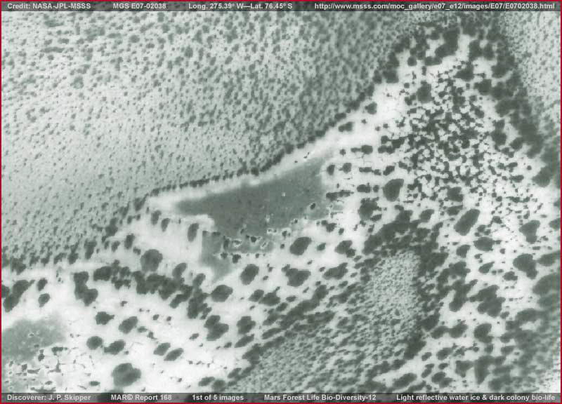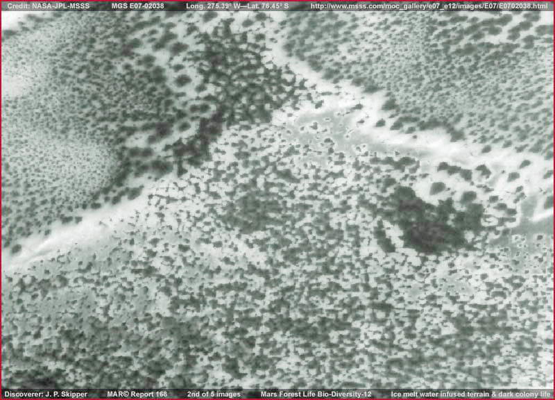 A fenti, negyedik és ötödik felvételekkel folyamatosan haladunk lefelé a fotócsíkon annak alja felé, további részleteket bemutatva a felszínen jelen lévő biológiai életből. Vegyük észre, ezeken a felvételeken az életforma jóval kifejlettebb és nagyobb sűrűségben található. Azonban sokkal lazább szerkezetben fordul elő, felépítése hasonlatos egy bokros vidékhez, ahol ágas-bogas képződmények találhatók, ám ne feledkezzünk el, telepes életformáról van szó, méghozzá nem teljesen kifejlett állapotában. Teljesen kifejlett formájában sokkal folyamatosabb réteget képez, hasonlatosan földi gombatelepekhez, miként az említettekre jó példákat láthatunk a fentebb felsorolt beszámolókban. Azt mondhatnánk, hogy ez a fajta felszín igen hasonlatos egy földi, kiszáradás alatt álló, de mégsem teljesen száraz mocsárhoz. Akár elfogadja valaki a nedves talajra vonatkozó elképzelést, akár nem, egy dolog kétségtelen tény, semmiféleképpen nem tekinthetjük ezt a csomós szerkezetű képződményt természetes sziklák véletlenszerű elrendeződésének, netán közönséges talajnak, már a puszta megjelenéséből is következik, semmi másról nem lehet itt szó, mint biológiai életről. Nincs túl nagy jelentősége itt, mégis megemlítjük, ezen marsi telepes életforma teljesen kifejlett állapotában hézagmentesen befedi a felszínt, igyekszik a napfény minden egyes cseppjét hasznosítani, miközben szívós harcot folytat szomszédai kiszorítására. Soha nem keverednek el egymással, jól láthatóan megkülönböztethető mezőket alkotnak. Összetéveszthetetlenek. Amikor részben hó takarja, a látható felszíni részletek egy része elveszik, és csak a keskeny elválasztó-csatornák maradnak jól kivehetők, még hangsúlyosabban a töredezett felszín benyomását keltve. Így aztán csak ezek a nagyobb méretű formák adnak a tudósoknak elgondolkozni valót, vajon milyen hatalmas geológiai erők hozták létre azokat, töredezték fel a talajt, ráadásul ilyen egységes mintázatban? Amit fontos megérteni az az, hogy a víz jelenléte a Déli Sarkvidék térségében sokkal számottevőbb, mint az Északi Sarki területen. Valójában, néhány mélyföldi terület a Déli Sarkvidéken a jégsapkából kiinduló rendszeres áradások elszenvedője, a melegebb periódusok időszakában, az olvadás miatt megtelő víztározók túlfolyása eredményeként. Ez azt jelenti, hogy a biológiai élet változatossága is nagyobb a Déli Sarkvidék térségében, mint az Északi Sarkvidék esetében, hiszen jól ki tudják használni a kedvezőbb feltételeket. A Déli Sarkvidék számos részén, a mélyebb vidékeken sokkal állandóbb jelleggel alakul ki folyamatosan nedves talajviszony, akár az egész évet felölelve, ami kedvez a kisebb méretű biológiai életformák takarója kialakulásának, mely minden más életformát elnyom, s e kisebb életforma hajlamos erősebben visszaverni a fényt, mintsem sötét fényelnyelő külsőt mutatni. Amikor a felbontást lerontják, hogy leplezzék a képhamisítási beavatkozásokat, éppen ez az a kisebb méretű egyedekből felépülő, mindent eltakaró életforma az, melynek látványa a legnagyobb mértékben sérül. A látvány teljesen összezavarodik a gyenge felbontás miatt, a napfény erős visszaverődése miatt pedig úgy fest, mintha csupasz felszínt látnánk. Az elemzés alatt álló fotócsík felső része is pontosan ilyen. Nem mutatjuk itt be, mert az egyetlen dolog, amit láthatunk rajta az az erős tükröződés, meglehetősen kiterjedt vidékeken, amiatt kevés, vagy teljesen hiányoznak is az egyedi részletek. Ennek ellentéte a biológiai életre utaló, eddig bemutatott nyomok, nagyobb, sötétebb foltok formájában, azt sejtetvén, különálló egyedekről van szó, és szemmel láthatóan könnyebben felismerhetők. Mi a Földön hajlamosak vagyunk azt hinni, ha egy sűrű erdőséggel találkozunk, az fákból és bokrokból áll. Habár vannak hagyományos megjelenésű fás-bokros erdők is a Marson, azok is igen sűrűek, ám sokkal inkább képviselnek zúzmó, illetve gomba alapú, telepes lényekből álló életet, hatalmas területeket elfoglalva, vastag takarót alkotva a felszínen, ahol a számukra legkedvezőbb, nyirkos körülményekkel találkoznak. Gyakori életformának számítanak a Marson, még akkor is, ha a földi szemnek szokatlanok, és nem könnyű számunkra a kinézetük alapján azonosítani. A szél szállítja a szaporodáshoz szükséges spórákat, nagy területekre kiterjedően, ennek eredményeként sötét foltokat láthatunk mindenfelé, különböző állapotokban, a kicsiktől, melyek a fennmaradásukért küzdenek, a nagy területeket elfoglaló, burjánzó, nagy és sűrű telepeikig. Akkor érzik magukat a legjobban, amikor a nyirkosság állandóan jelen van a talajban, ezt követi az a helyzet, amikor a felszíni vízjég vékony, és az olvadási időszakokban cseppfolyóssá válik. További adottságuknak köszönhetően képesek fennmaradni és túlélni a Déli Sark vidékén, magán a jégsapkán is, sötét foltokat létrehozva, minek következtében a napsütés jobban elnyelődik és megolvasztja a jég felszínét. Skipper ismét visszatért ennek az életformának a bemutatására, hiszen különös és kevésbé nyilvánvaló földi szemünk számára, ezért könnyű félretenni, mivel nem érthető. A Mars megismeréséhez azonban nélkülözhetetlen az általa hordozott biológiai élet természetének megértése, közte a különbségekének, melyek annyira eltérő fejlődési irányba vitték a két bolygót.