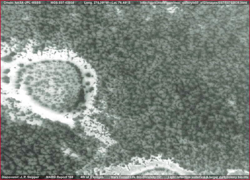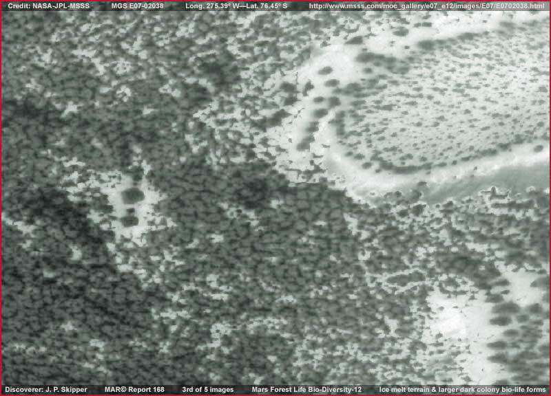 A fenti, harmadik felvétel helyszíne kissé lejjebb található a fotócsíkon az első és a második képhez viszonyítva. A középső része bal oldalán már elkezdődik az érettebb és nagyobb méretű biológiai életformák megjelenése, „csomósodást” tapasztalhatunk. Abból a távolságból ahonnan a helyszínt látjuk, a vizuális benyomás alapján egyedi fák lombozatait sejthetjük, ám ez az életforma nem fa-jellegű. Továbbá, ezen életforma, valamint különböző variációi meglehetősen idősek és különlegességszámba mennek a bolygón. Az itt látható változat alkalmazkodott a Déli Sarkvidék mélyföldi feltételeihez, és a képeken megfigyelhető formát mutatja. 2001. júliusában tette közzé Skipper az itt láthatóakhoz nagyon hasonló, ám magasföldi meredek lejtőkhöz alkalmazkodott fajtájukról szóló beszámolóját „Hatalmasra növő gombák a Déli Sarki régióban” - címmel. A jelen tanulmánnyal megegyező című, „A marsi erdei élet biodiverzitása” – beszámoló ugyancsak nagyon hasonlatos életformát mutat be, továbbá a „Biológiai élet a Mars Déli Pólusánál” – című írás ajánlható még, ahol az életforma sekély repedésvölgyben jelenik meg, magán a Déli Jégsapkán. Ez az életforma rendkívül szívós, és dacol a kemény feltételekkel, ám jelentős mennyiségű nedvességet igényel fennmaradásához.