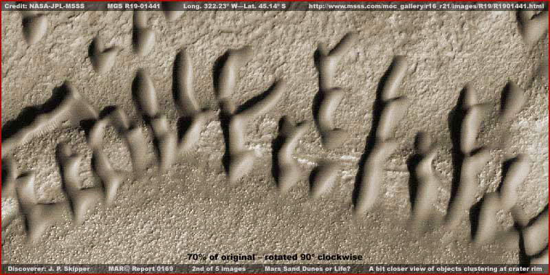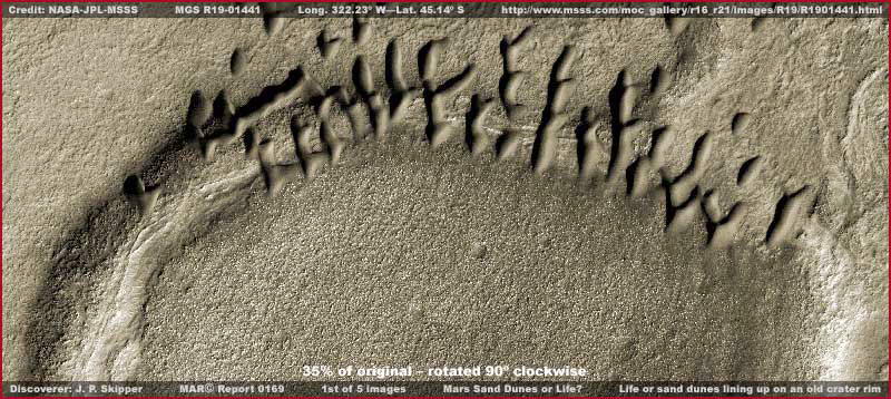 Például, a beszámoló első felvétele kapcsán, a fotócsíkot lecsökkentettük 35%-ára, az eredeti nagyságához képest és 90 fokkal elforgattuk az óra járása szerint, hogy megkapjuk ezt a széles látószögű kontext képet, melyen szerepel egy ősi kráterperem, valamint a „dűnék”, összegyűlvén az említett kráterperemen. A felvétel a fotócsíkot az egyik szélétől a másikig ábrázolja. Mivel ezzel az elforgatott tájolással kezdtük a beszámolót, megmaradunk ennél továbbra is. Figyeljük meg, az objektumok milyen szabályosan sorakoznak fel a kráterperemen, nem hatolnak be a kráter belsejébe. A hivatalos álláspont szerint „dűnékről” van szó, a képet az MSSS honlapján találjuk, itt: http://www.msss.com/mars_images/moc/2004/11/08/ Azonban, fontos megjegyezni, az itt beidézett képet nem a fenti hivatkozásról vettük, sőt, úgy tűnik, a beidézett oldalon a képződményeket vízszintesen tükrözve láthatjuk, az egyenes állású gif képhez képest, melyet viszont itt találhatunk az MSSS oldalán: http://www.msss.com/moc_gallery/r16_r21/images/R19/R1901441.html