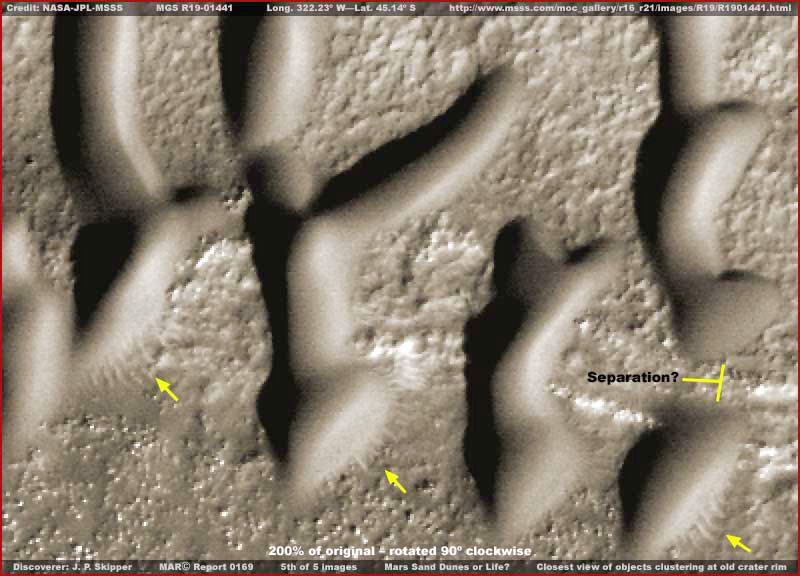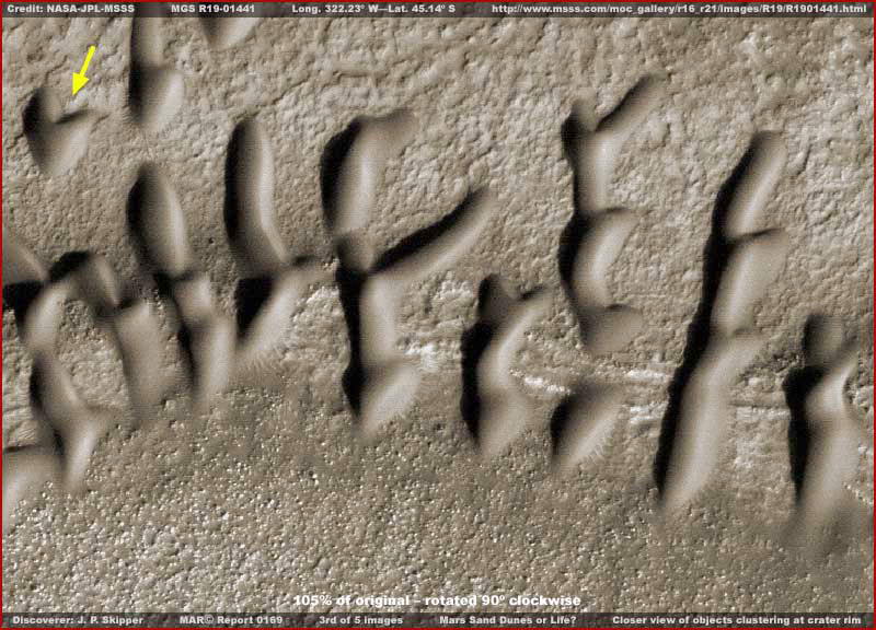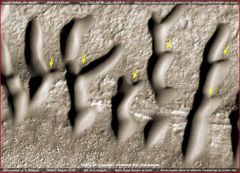 A fenti, harmadik képen, kissé közelebbi a látvány. Figyeljük meg, mennyire jól behatárolt mindegyik forma, és mennyire hasonlatos egymáshoz a mintázatuk. A szóban forgó objektumok nem úgy tűnnek, de nem is úgy viselkednek, mint a szél által formált homokdűnék a Földön. Nem a szél formálta őket? – mondhatni. Ha nem, akkor vajon milyen már természetes erő alakíthatta a természetes homokos anyagot ilyen sima és egyforma megjelenésű formákká, nem hagyván semmi nyomot maga után, honnan származik az anyag a felszínen? Ezen kívül, vessünk egy pillantást a felvétel bal felső sarkára, a sárga nyíllal jelzett objektumra. Az eleje „V”-t formál, míg a „hátsó” része konkáv. A jelzett forma általánosnak tekinthető, melyet számos úgynevezett „dűne” magára ölt, szerte a szárazföldön, s valamennyien közösek abban, hogy egymástól bizonyos nagyságú tér választja el őket. Skipper nagy számban látta ezeket a formákat szerte a Mars nyitott térségeiben, kráterek belsejében nem fordulnak elő, s általában valamennyien egy irányba mutatnak. Számtalan alkalommal sötét sávokat láthatunk a területükön, olykor nagyon sötétek és részletmentesek, máskor ragyogó fényesek és sokkal több napfényt vernek vissza, kemény felszínűnek látszanak, teljesen hasonlatosan ahhoz, ahogy ott megjelennek. Skipper elmélete szerint valamennyi ilyen jellegű objektum valamiféle szerves életforma, valószínűleg valamiféle telepes jellegű élet. Arra gyanakszik, néhány megjelenésük képes elmozdulni, ezért tűnik inkább telepes jellegű életformának, mely bizonyos mozgásképességgel rendelkezik a felszínen. Másrészről, az is tény, igen ritkán látható bármiféle nyom, ami az elmozdulás után visszamaradt útvonalnak lenne betudható. Továbbá, a legtöbbször síkvidéken fordulnak elő ilyetén nyomok, a sziklás, egyenetlen felszín elmossa azokat. Ugyancsak igen ritkán fordulnak elő olyan helyeken, ahol másfajta marsi életformák is megtalálhatók.