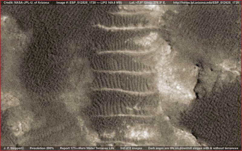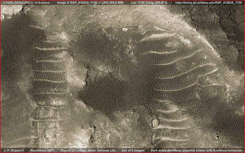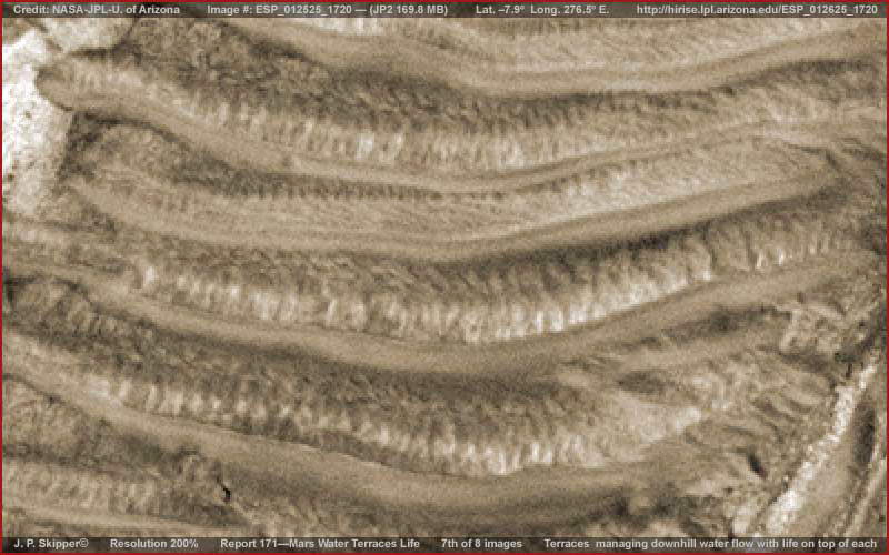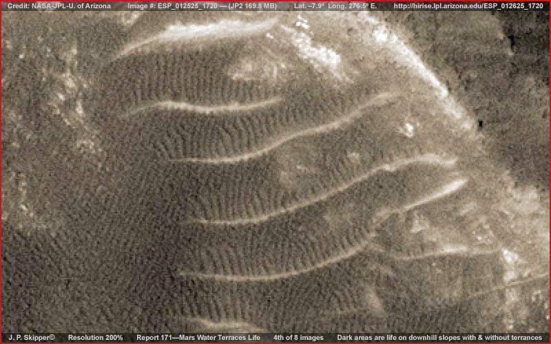 A fenti, első kép, csak egy részlete a teljes felvételnek, ám szélesebb látószöge miatt, általános rálátást tesz lehetővé a helyszínre, megfigyelhetjük, miről is van szó. A fentebb látható sötét területek különböző változatait mutatják a „gerincforma-jellegű” életnek, amivel már többször találkozhattunk korábbi beszámolókban. Vegyük észre, némelyikük a természetes felszíni területeket is elfoglalja, vízszintes sávjai úgy sorakoznak, akár a taplógombák csoportjai egy korhadt farönkön. Más példányaik egyszerűen csak elfoglalnak egy-egy foltját a szárazföldnek, lényegesebb kiemelkedésük nélkül. Hadd nyújtsunk némi, a megértéshez feltétlen szükséges háttér-információt, mi is folyik itt. E terület az Ius Kazma területén található, nagy, meredek-falú kanyonról van szó, a Valles Marineris, a Naprendszer legnagyobb repedésvölgyének déli oldalán, melyet „a Mars nagy hasadékaként” is ismerünk. A Valles Marineris mélysége eléri a 8-10 kilométert, szemben a földi Grand Kanyon 1.6 km-es mélységével. Más szavakkal, a Valles Marineris 5-6-szorta mélyebb a Grand Kanyonnál. Meglehetősen mélyen vág a felszínbe tehát, s jogosan várhatjuk el falai meredekségét. Ha valaki a fenti képet szemléli, akkor az északi irányt felfelé találja, dél ennek következtében a kép alja, s egyben az Ius Kazma iránya felé mutat. A tájolás következetes valamennyi beszámolóban, így ebben is. Ezt fontos megjegyezni, miként azzal is tisztában lenni, hogy ezeken a felvételeken, habár látszólag vízszintes vidékeket látunk, a helyzet nem ez, ugyanis igen meredek térségekre tekinthetünk alá, ennek következtében durva, sziklás felszínt várnánk. Miként arról Skipper a korábbi beszámolóiban is írt, a gerincforma jellegű élet elsősorban sekély vízben burjánzik, és a olyan jellegű marsi élet, mely ilyen körülményeket igényel. Együttműködő típusú formák, párhuzamos sorokba rendeződnek a víz áramlásával egy irányban. Tehát annak ellenére, hogy a víz igen sekély, s ebből a távolságból, ahonnan a műhold képeket alkot, nem látható, biztosak lehetünk benne, hogy jelen van, s a gerincformák tájolódásával párhuzamosan áramlik. Intelligenciájának szintje ismeretlen tényező. Figyeljük meg a sötétebb gerincformákat és a sorok fel/le irányultságát a világosabb színű, egymástól azonos távolságra lévő gerincformák között. Kétségtelenül teraszokat látunk, céljuk pedig nem más, mint a víz visszatartása, hiszen igencsak fontos szerepe van itt a meredek lejtőkön, s ezen képződmények nélkül vízesések alakulnának ki. Mivel a teraszok közötti távolság viszonylag csekély, figyeljük meg, a sötét színű gerincformák a szokott irányban orientálódnak, a víz folyásával párhuzamosan. Figyeljük meg azonban, hogy azokon a területeken, ahol a talaj lejtése nem annyira meredek, a sötétebb gerincformák teraszképző egységessége felbomlik, sűrű tömeggé állnak össze, kifejezett irányítottság nélkül, a víz visszatartásának itt kisebb a jelentősége - hihetnénk. Éppen ellenkezőleg. Ha valaki alaposabban szemügyre veszi a fenti, és az alant következő erősebben nagyított felvételeket, láthatja, a víz visszatartására továbbra is igény van, ám ezt másként oldódik meg, az alapvetően irányított teraszos gerincforma szerkezetek helyett itt inkább labirintusos jellegű útvesztőket láthatunk. Természetesen ez a megoldás is alkalmas a víz visszatartására. Jelen beszámolónak az a célja, hogy bemutassa, bármi is hozza létre e víztől függő életet, képes fejlődni, különböző megoldásokkal áll elő, alkalmazkodik a Kazma meredek lejtői adta körülményekhez. Azonban, e felvételekkel foglalkozó planetáris geológusok kétség kívül ősi vízeróziós nyomokat látnak majd a képeken, a valaha nagyon régen a meredek Kazma falain lezúduló víz vájta árkokat, s ennek következtében láthatóvá váltak a földtani rétegek, ahogy a lágyabb anyagokat kimosta a víz. Kézenfekvőnek tűnik. Nem igaz? Ha tényleg így van, akkor egyet javasolhatunk, még közelebbről kell megnézni a szóban forgó formákat, s utána mindenki eldöntheti mit is higgyen.