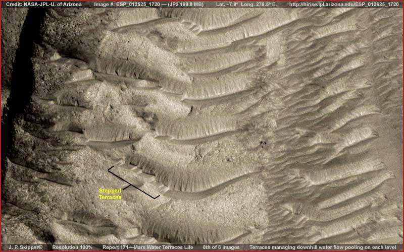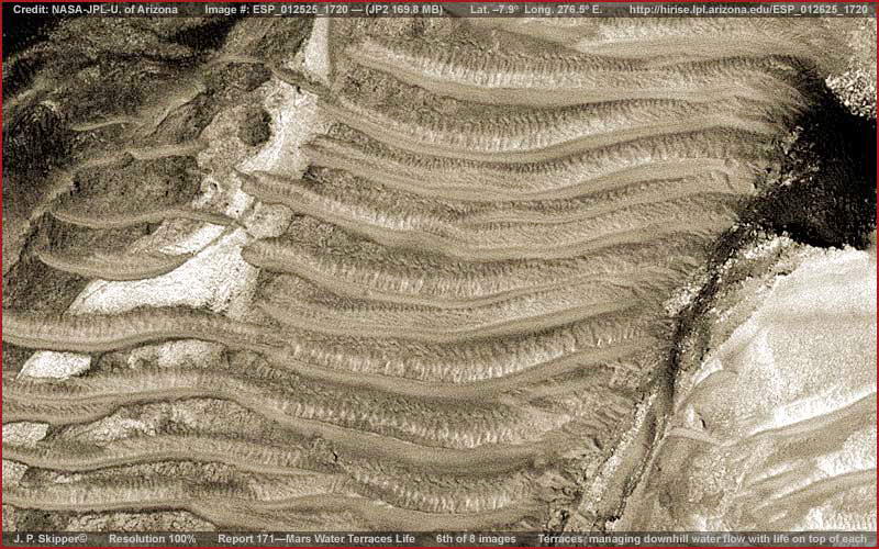 125. Marsi víz és teraszos élet Az itt bemutatásra kerülő képrészleteket az MRO HiRIse ESP_012625_1720 jelzésű, jp2-es felvételéből vettük. A hivatkozott jp2-es file mérete 169.8 MB, mégis, nagyobb felbontáson a felszíni alakzatok életlenné, szemcséssé válnak. Skipper a lehető legtöbbet elkövette, amit csak el tudott. Ahogy haladunk e beszámoló olvasásában felmerülhet a kérdés, miért jelentkeznek problémák a felbontással. Ám a kivehető dolgok mégis elégnek bizonyulnak a megértéshez, hogy ténylegesen meglássuk, mi is folyik itt valójában, és miért érdekes ez a helyszín.