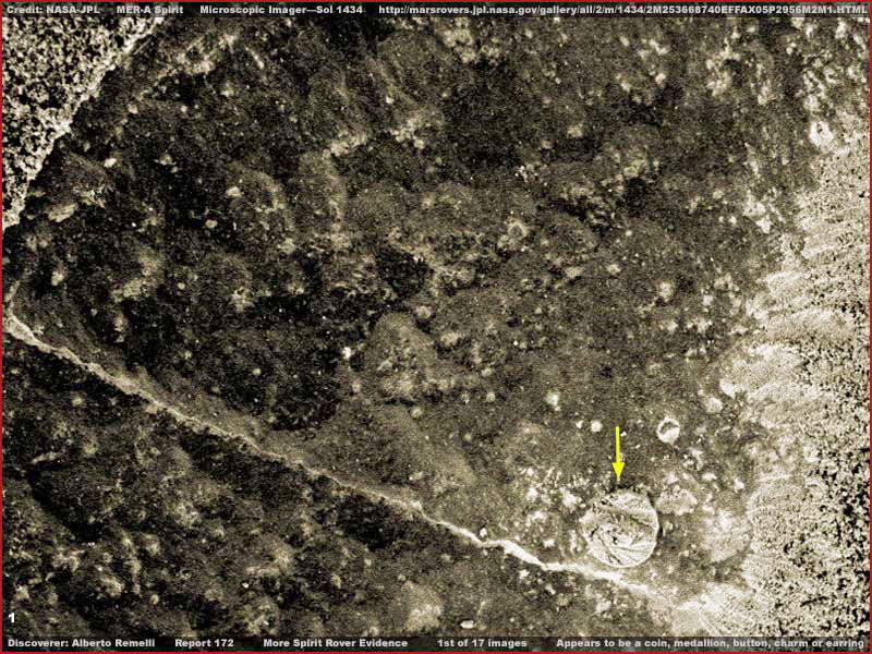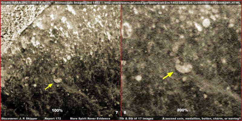 A fenti, 4. és az 5. felvételen, igen régi és kicsiny érméket láthatunk, míg a 6. képen ugyancsak igen régen készült, gombokat, természetesen földiek, kiemelkedő díszítések és az érméket illetően jellemző a perem nélküliség, s mindegyikükre a mesterséges jelleg. A sokféle minta felhasználásának célja annak bemutatása volt, hogy az érmékre jellemző a kiemelkedő díszítés, a szabálytalan forma és a perem nélküliség. Azt is jól láthatjuk rajtuk, hogy nem mindegyiket tervezték egy-egy adott személy ábrázolására, habár az érméken a portrék megjelenítése a messze legelterjedtebb, a sejtésünk pedig az, hogy a legtöbb megfigyelő a marsi érmén ugyancsak egy arcképet hajlamos felismerni. Ezeket a dolgokat is meg kell fontolni. A tárgy szemmel láthatóan szabadon hever az alatta lévő sekély, hepehupás üreg egyenetlen felszínén. Kiszabadult eredeti geológiai környezetéből mostanra, az eredeti állapot azonban bizonyára nem ez volt. Kétség nem férhet hozzá, a tárgy megfordult a sekély bemélyedésben ahogy a RAT elérte és a RAT keféi is. Feltételezve a RAT óramutató járása szerinti forgását, logikus, hogy az érme elvált az őt körülvevő anyagtól és az üreg jobb oldala felé fordult, odapöccenve az üreget kettéosztó vékony vonalhoz. A RAT ezen a részen kissé magasabban volt, így kevésbé került érintkezésbe az érmével, lehetővé téve számára, hogy a helyén maradjon, habár a RAT fúróeszköze kismértékű károsodást okozott felszínében. Ugyancsak logikus feltételezni, hogy az érmét magában foglaló eredeti geológiai környezet valószínűleg a bal oldalt foglal helyet, ahonnan a RAT kipattintotta, ahogy mélyebbre és mélyebbre vágott. Nézzük meg ezek ismeretében közelebbről is a képet, az üreg bal felét, továbbá nézzük meg, látunk-e vajon valami érdekeset itt.
