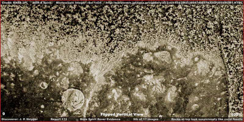 A fenti, 17. felvétel, azt az állapotot mutatja be, amilyen a RAT fúróberendezésének nyoma a kezdeti szakaszban kinézett, s ezt a képet kifejezetten e beszámoló okán illesztettük ide. Könnyű észrevenni, hogy annak ellenére, hogy a fúrás nem olyan mély és nem teljesen befejezett, mint Sol 1355-kor, a fúrás következtében keletkezett törmelék nem egységesen por állapotú, hanem kisebb kavicsok is találhatók benne, azt mutatvány, hogy a szerkezet igen egyenletes nyomást kifejtve dolgozott. Azonban, a fúróberendezés működésére felhozott példa bemutatja, hogy a RAT nyomása nem azonos a két oldalon, a gyűrű benyomata egyik felöl élesen, még a másikon alig látszik. Továbbá, a kérdéses fúrási terület széle mentesnek tűnik portól és törmeléktől. Más szavakkal, minél mélyebb a fúrásnyom, annál kevesebb szabálytalansággal találkozhatunk. Ismételjük, ezek a szabálytalanságok felvetik a kérdést, vajon a fúrásnyom szélesebb környezetét ábrázoló panoráma képen látható felszín pontosan ugyanaz lenne, mint a Mikroszkopikus Képalkotó felvételén található? Skipper arra gyanakszik, hogy nem, de nehéz ebben a kérdésben döntő bizonyítékkal szolgálni. Talán nem, ám az lehetséges, hogy a marsjáró elmozdította teleszkópos karját a nagyobb nyomás kifejtése érdekében, s emiatt lett a fenti lyuk mélyebb, miután végzett a munkájával. Ugyancsak lehetséges, hogy azok, akik működtetik a RAT eszközt és a teleszkópos kart, kellően finoman tudják hangolni, hogy csak a RAT nagyobb keféje érje el a felszínt, s söprögessen körbe az adott területen, szélesebb felszínt feltárva a fúrás ideális pontjának kiválasztása végett, s egyben nagyobb mennyiségű port letakarítva a kamera látószögén kívülre. Gondolkozzunk csak tovább ezen a korallnak látszó sziklán. Ha Ön a titkos műveletek irányítója lenne, és a marsjáró eljutna egy vízfelülethez, mely korallokat tartalmaz a régi időkből, a régi partvonalon, nyilvánvalóan visszavonulót fújna, nem mutatná a helyszínt tágabb környezetben, és valamit előszedne, hogy a valós látványt elrejtse. Hasonlatosan, ha rábukkanna egy hosszú idővel ezelőtt kiszáradt tetemre, és közelében egy zsebre, tele fényes tárgyakkal, nyilvánvaló, hogy megragadná a marsrover botkormányát odamenne vele és körbeásná. A Mikroszkopikus képalkotó nagyon közeli felvétele nem képes mutatni semmiféle elfogadhatatlan információt 10 cm-nél távolabbról, mint a lyuk széle, a Panoráma Kamera azonban igen, és ezeket a dolgokat kezelni is kell. Gondoljuk csak meg. Igen, elfogadom. Skipper nehezen fogad el rátukmált dolgokat, különösen ha gyanú ébred benne, hogy valaki megpróbálja átverni. Kérem, senki ne írjon Skippernek és ne keresse, hogy rámutasson, egy csomó mesterségesnek tűnő tárgy van a fúrásnyom üregében. Erről Skipper is meg van győződve, ám csak a legnyilvánvalóbb és legerősebb tárgyat vette górcső alá, azt, amelyet a legtöbb Olvasó képes hasonlóképpen felismerni és értelmezni. A többi kevésbé meggyőző és egyéni értelmezés kérdése.
