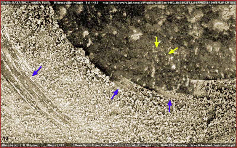 A fenti, tizedik felvételen, figyeljük meg a fúró által keltett kopásnyomokat, kék nyilakkal jelölve a széli területen. Ezek a nyomok természetesen megerősíteni látszanak, hogy valójában a RAT fúrásával állunk szemben. Az egyetlen probléma az, hogy a Mikroszkopikus Képalkotó szinte mindig túl közel van a felülethez, ezért nehéz átfogó képet kapni, a Panoráma Kamera képe viszont erősen tömörített, rossz felbontás mellett, még a marsjáró közvetlen szomszédságában is, a fotóknak emiatt tisztáknak kellene lennie. De nem azok, s ez a tény már önmagában is gyanakvásra ad okot. Továbbá, figyeljük meg azt a tárgyat, amelyre a sárga nyilak mutatnak, a kivájt üreg alján. Teljesen úgy néz ki, mintha egy parányi gyöngyökből álló láncot látnánk, nem igaz? Lehetséges lenne, hogy a bemutatott korong kapcsolódik valamilyen formában a gyöngysorhoz, netán valaki, a távoli múltban viselte ezt? Meglehetősen szuggesztív látvány, valamennyi következményével együtt, igaz?