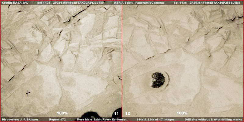 Amint az látható a fenti, 11. és 12. osztott felvételen, a bal oldali rész a kérdéses területen található sziklát mutatja, semmiféle fúrásnyom még nem látható rajta Sol 1408-kor, míg a jobb oldali rész ugyanezt a területet ábrázolja, Sol 1436-kor, valami 28 nappal később, a RAT fúróberendezésének nyomával a mélyedés alsó részén, jól láthatóan. Figyeljük meg a mélyedést kettéosztó, határozottan világos színű vonalat, és valamint a korong jelentősen eltérő fényvisszaverő-képességét a mélyedés bal oldalán (a kép jelentős kivilágosítása szükséges!), megerősítvén, hogy valóban erről a helyszínről van szó. Nincs itt lehetőség minden egyes fotó teljes részletességű és nagyítású bemutatására, ezért javasoljuk, hogy legalább a jobb oldali képrészletre vonatkozó hivatkozást mindenki keresse fel, szélesebb és átfogóbb képet lehet általa nyerni, az eredeti forrásból. Még a marsjárónak is látható egy részlete a képmező alján, a JPL felirattal. Ne felejtsük el, hogy a fúró nyoma megközelítőleg 5 cm átmérőjű. A marsrájót viszonyítási pontként használva, nem tűnik a sötét színű nyom a megadott értéknél bizonnyal jóval nagyobbnak? Számomra igen.