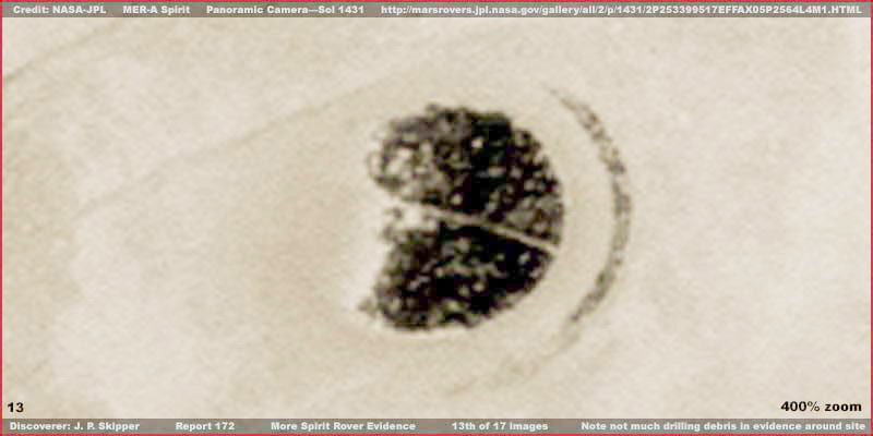 A fenti, 13. felvétel, 400%-kos nagyítás mellett mutatja be a fúrás nyomát a kérdéses területről, a marsjáró Panoráma Kamerája segítségével. Figyeljük meg, mennyire halovány és homályos a fúrás körül lévő sziklafelszín, habár a kamera egészen kis távolságból örökítette azt meg. Mivel a felbontás szegényes és a kép elmosódott, nehéz megmondani, ám úgy tűnik, semmiféle, a fúrás következtében keletkezett por nem rakódott le, és töredékek sem maradtak a fúráshely körül. Skipper gyanúsnak találta ezt a momentumot, ám nem sikerült teljes körűen bizonyítania, hogy a fúrás környezet nem tartozik a fúráshoz magához. Fontos tudni, hogy mindösszesen egy méterrel odébb, további két fúrásnyom található, és nem szabad őket összekeverni az itt bemutatott helyszínnel. Nem mutatják az itt látható megkövesedett korall geológiát. Ez a körülmény vezetett oda, hogy Skipperben feléledjen a gyanú, az itt bemutatott távolabbi felvétel talán nem is valós? E gyanú megkönnyíti annak felvetését és megfontolását, netán a valódi fúráshely vízpart szélén található, ahol akár még élő korall is előfordulhat és a fölötte található sziklák képét illesztették be a valódi fúráshely fölé? Vessünk egy pillantást a következő képekre, hogy tisztában legyünk a RAT eszközzel és a fúróberendezéssel, valamint egy tipikus fúrási nyommal. A RAT műszert az USA-beli Honeybee Robotics fejlesztette és működteti.