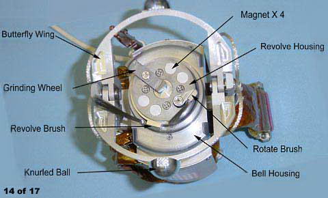 A fenti, 14. felvétel, a RAT eszköz üzleti célból készült összeállítást. Szenteljünk különös figyelmet a vágó/őrlő keréknek és a kis kefének mely együtt forog az őrlőkerékkel, a tervezés szerint ugyanis kisöpri a horzsalékot a fúrt lyuk belsejéből. Nézzük meg a hosszabb kefét, mely egy külső házban helyezkedik el, hogy elsöpörje a port és a felaprózott anyagot a fúrási lyuk körül. Vegyük észre, mind a belső, mind a külső kefe az óra járásával megegyező irányú forgást támogat, amennyiben a készülék a talaj felé mutat.