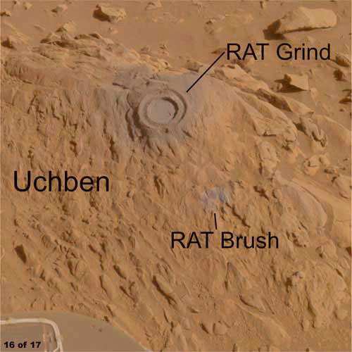 A fenti, 16. felvétel, kétféle fúrásnyomot mutat be a Marson, egy másik, az előzőhöz nem kapcsolódó helyszínen. A felső a RAT teljes mértéhű használatáról tanúskodik, amint lyukat fúr a talajba. Figyeljük meg a tisztán látható, felhalmozott por- és törmelékkupacot, a külső gyűrű jól látható benyomatát a por- és törmelékmaradványba. Vessünk egy pillantást a jobbra lefelé eső pontra, ahol csak a RAT keféjét használták a por félresöprésére. Miként az jól látható, a RAT eszközt felhasználva, igen óvatos tevékenységeket is végre lehet hajtani. A két példa bemutatja a RAT fúróberendezés két alapvető használati módját.