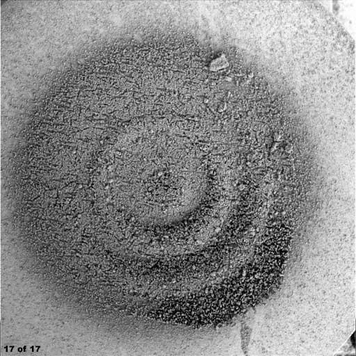 A fenti, 15. felvétel, tipikus sziklafúrás-nyomot mutat be, mely ez esetben mészkőbe mélyed és földi laboratóriumban készült. Figyeljük meg milyen sok por és törmelék keletkezett e jellemzőnek tekinthető fúrás kapcsán. Nézzük meg, hogy a külső fémgyűrű határától milyen távolságra söpri ki a külső kefe a port és törmeléket, teljesen feltornyozza a külső fémgyűrűn kívül.