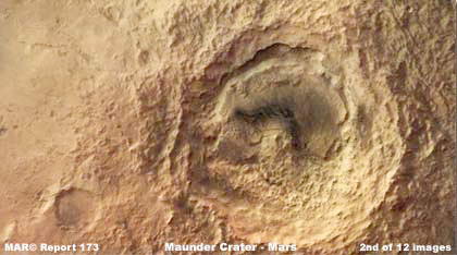A fenti két felvétel a Mars tipikus becsapódásos krátereit mutatja, valamint közvetlen környezetüket. Mindkettő elfogadható példa ebből a szempontból, hogy jól képviseli a durva, sziklás környezetet, a talajgeológiát a környező felszínen és magukban a kráterekben, melyek úgy tűnnek, jelentős hatásnak vannak kitéve a biológiai növényi élet és felszíni víz tekintetében. Különösen a fenti, második felvételen látható ez, annak is a jobbján, figyeljük meg a sok-sok sziklát, és a fény- árnyék hatásokat, miként jelennek meg a durva geológiai alakzatok. A példák tehát bemutatják a becsapódásos kráterek legfőbb tulajdonságait. Így fest tehát a valódi kráter-topográfia, amikor nem rontja a látványt a felvételek hamisítására. (Bár, a 2. felvételen a központi csúcs körüli sötét maszatolás eléggé szembeötlő…) Durva és nyers, mert katasztrofális események történtek a bemutatott helyeken, feltépvén a mélyebben fekvő geológiai rétegeket, szétszórva a kirobbantott kőzeteket a közelben. Azonban évekkel ezelőtt, amikor Skipper először kezdett foglalkozni a jó öreg Viking szondák 1970-es évekből származó adataival, az egyik legelső dolog volt az, amit észrevett, az volt, hogy a marsi kráterek belseje és a kráterfalak külső lejtői igen gyakran képezik jellegtelen, kíméletlenül felhordott hamis rétegek más-más típusait, melyek kizárják az eredeti nyers és durva, geológia felszín részleteit, azok jellemző árnyékhatásait, ehelyett üres, részletmentes területeket mutatnak.