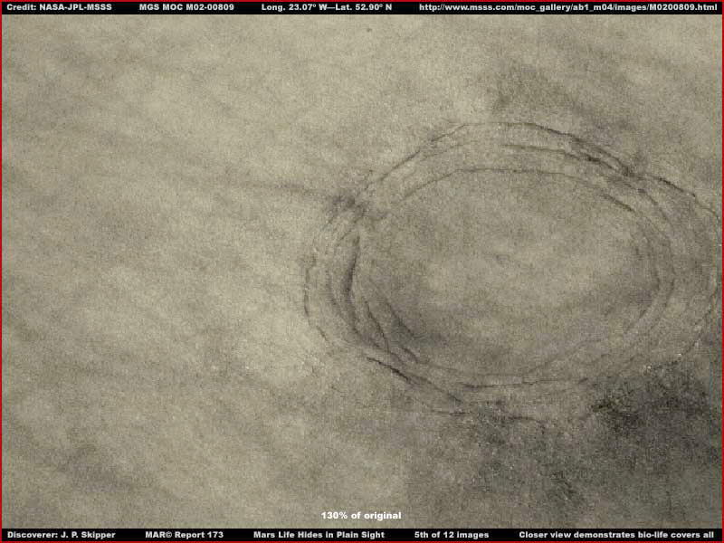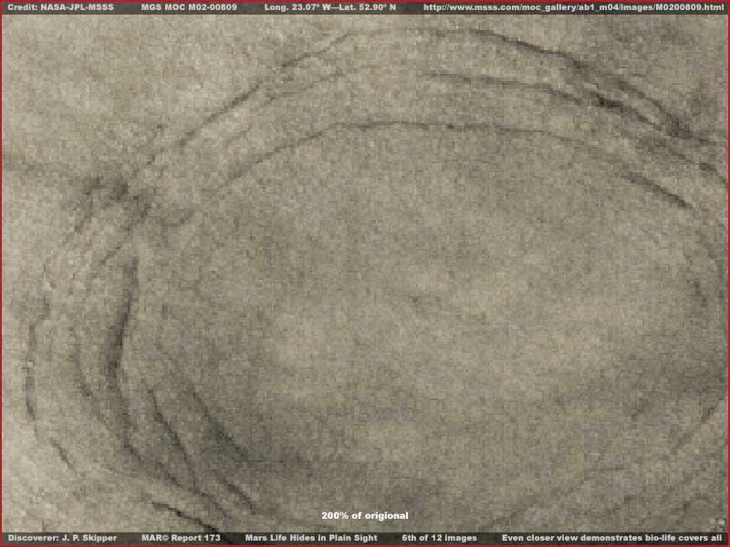 A fenti, 4. felvétel, sekély krátert mutat, redőzött kráterfallal és belső lejtőkkel, valamint a környező területet, egész tekintélyes kiterjedésben a krátertől. Igazából a fotócsík egyik végétől a másikig, jelentősen tömörített, vele természetesen minden, amit ábrázol. Továbbá, ott van a számos, igen jellemző, kusza sötét sáv, a felszín sima külseje. Figyeljük meg azt is, milyen lágyak és hengeres kinézetűek a redők a kráterben és a széli területein. Figyeljük meg az egységes színt - eltekintve a Skipper által hozzáadott színezéstől -, valamint a sávokat. Fontos kihangsúlyozni, hiányzanak az éles fény-árnyék hatások, ellentétben a 2. felvételen látható Maunder kráterrel. Jelentős különbségeket figyelhetünk meg, mert jelentős különbségek vannak. Skipper álláspontja szerint, amit látunk, nem más, mint folyamatos erdőség, növényszőnyegként belepi az egész felszínt, keresztezvén a krátert, betakarva teljes területét. Példát láthatunk a biológiai életre, ám a beavatkozásoknak köszönhetően éppen a felbontás határán található, ennek köszönhetően meglehetősen hatékonyan rejt el a tekintetünk elöl minden részletet. Az egyetlen oka annak, hogy egyáltalán felismerjük, krátert láthatunk a felvételen, a méretes mélyedés, s a hozzá tartozó kráterfalak. Túlságosan mély az aljzata ahhoz, hogy teljes egészében elrejtse szemünk elöl az összefüggő takaró. Az igazság az, hogy semmiféle geológiai képződményt, sziklát vagy talajt, sem láthatunk a képen, a legcsekélyebb mértékben sem, pusztán a tekintélyes kráter redői törik meg a folyamatos szőnyeget, mintegy kimerednek abból, ahogy a kabátgomb a szövetből. Azonban, ha alaposan megnézzük a dolgot, akkor is könnyű félreértelmezni a helyszínt, geológiai felszínnek értelmezve. Éppen ilyesmire gondolt Skipper amikor a „Síkságon rejtőző marsi élet” címet adta jelen beszámolójának. A következő két kép közelebbi látványt kínál, kicsit talán segít a lerontott felbontás ellensúlyozásában.
