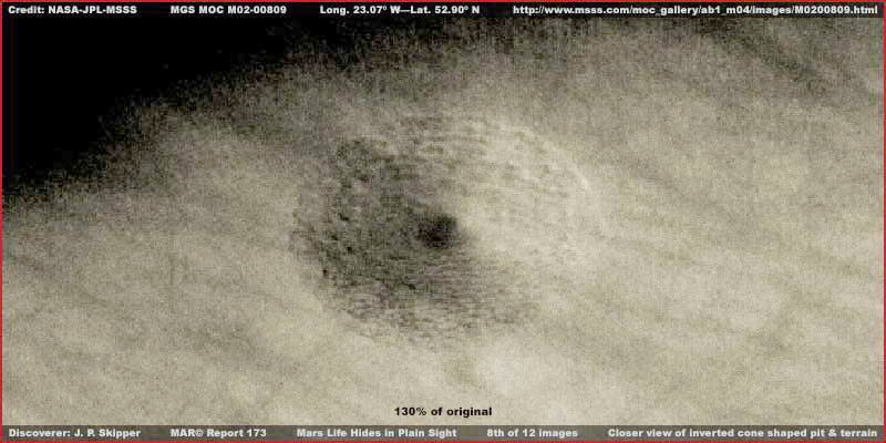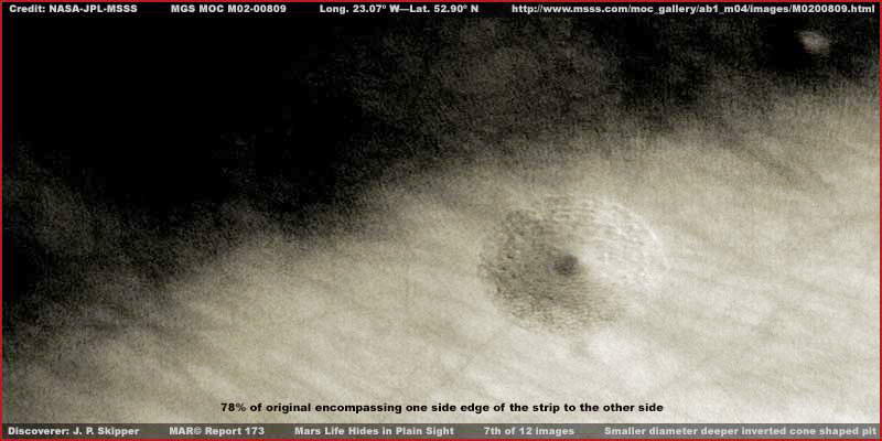 A fenti, 7. és 8. felvétel egy nagyobb mélyedést ábrázol, kissé lejjebb az előző helyszínhez képest, ugyanazon a fotócsíkon, egy távolabbi és egy valamivel közelebbi rálátással. Nem mellékeltük a 200%-os nagyítást, mert e helyszín kisebb és még rosszabbul viseli a nagyítást. Figyeljük meg a teljesen szokatlan kúpos formát a mélyedés alján. Amennyiben becsapódásos kráter, abban az esetben igencsak lágy és szivacsos anyagból kell felépülnie, netán sekély víz lepte be, amikor az ütközés bekövetkezett. Másrészről, esetleg omlásos formával van dolgunk, talán ez magyarázza meg a rendkívül szabályos megjelenést. Ám nem tudunk teljes bizonyossággal választ adni a felvetett kérdésekre a puszta látvány alapján. Miért? Mert a térséget, benne a mélyedést is, elfedi valamiféle mintázat szőnyege, emiatt nem láthatunk sziklákat és természetes geológiai eredetű talajt a legkisebb mértékben sem, sem a mélyedésben, sem közvetlen környezetében. Amennyiben természetes geológiát látnánk, meg kellene tudnunk figyelni a mélyedésből hiányzó és kilökődött anyagot. Szétrepült a kráter környékére, netán belesüppedt a föld alá, s e folyamat eredményeként jött létre a mélyedés, netán mindkét folyamatnak része volt benne? A helyzet az, hogy valami sűrűn befedi a felszínt, gátolja látásunkat a felszín közvetlen megfigyelhetőségében, a valódi geológiai alakzatok megpillantásában. A logikus következtetés az, hogy ami a szabad rálátást gátolja az egyfajta, agresszívan terjeszkedő növénytakaró, mely minden egyes tenyérnyi helyet elfoglal, a kráter gyűrűjét és a belső területeket is. Ha valaki alaposabban megnézi a két mélyedést ezen a fotócsíkon, akkor észreveheti, hogy a mélyedések enyhén hosszúkásak, sejtetvén elnyúlt formájukat, és ez így is van. Néhányan azt is felvethetik, hogy Skipper megfordította a felvételt, s ennek következtében jött létre ez a zavaró hatás. Fontos tudni, hogy a jelen M02-00809 jelű fotócsík az MGS MOC küldetés adatai közül a korábbiak közül való. A korábbi adatok között az egyenes állású fotócsíkon, melyeket a legtöbb kutató használ, egyszerűen azért, mert hogy egyenesek és könnyebb őket görgetni, már hivatalos szinten meg lettek fordítva. Ez is egy azok közül. Miként arról korábban beszámoltunk, ez a már hivatalos szinten végrehajtott képfordítás csak egyike és elenyésző része a számos, sokoldalúan alkalmazott zavaró taktikának, melyeket rendre bevetnek a képek nyilvánosságra hozatala előtt. Szerencsére, ebben a bizonyos esetben, rendelkezésünkre áll a széles látószögű kontext felvétel, M02-00810-es sorszámmal, alább mellékeljük, hogy bizonyítani tudjuk a már hivatalos szinten végrehajtott képfordítás tényét.