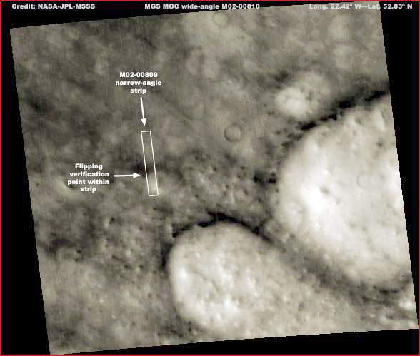 Ha valaki felkeresi a hivatalos MSSS oldalt a fenti hivatkozáson, látni fogja az M02-00809 jelű keskeny látószögű képet bal oldalt, és a széles látószögű M02-00810 számú felvételt az M02-00809 fotócsíkkal rajta, fehér körvonallal ellátva. A hivatkozási oldalon található első két link bal oldalt a szinuszos (szög alatti) jpeg és gif fotócsíkokat tartalmazza. Ha valaki megnyitja őket, azt fogja tapasztalni, hogy irányítottságuk megegyezik a széles látószögű felvétel területén körvonalakkal jelzett fotócsíkkal, ám a lista harmadik tagja, az egyenes állású gif totócsík már fordított. Fontos tisztában lenni azzal, hogy igen gyakran alkalmazzák a bemutatott eljárást az MGS MOC korábbi felvétel kapcsán. Amit Skipper tett mindösszesen annyi, hogy megfordította a fotócsíkot mind vízszintesen, mind függőlegesen, így újra megegyezik tájolása lista első két helyén található hivatkozásokéval, és a széles látószögű fotó tájolásával. Azaz, visszaállítva a fotócsík eredeti tájolását, nem valószínű, hogy pusztán emiatt torzulások léptek volna fel csak emiatt, éppenséggel, a hivatalos szinten keletkezett torzulások egy részét sikerült helyreállítani a helyes tájolás ismételt beállításával. Ezek az MGS MOC felvételek feltételezhetően számos ellenőrzésen esnek át hónapok alatt, mielőtt leközlik őket. Azonban, sok-sok ezer felvételt áttanulmányozva Skipper gyakran találkozott ezzel a problémával, amikor csak így volt, mindig igyekezett korrigálni. Akkor mit is mondjunk el az úgynevezett tudományos igényű ellenőrzésről? Akárhogy is, a probléma itt az, hogy a legtöbb tudós és akadémikus aki kutatásokat végez ezen képek felhasználásával, elhiszi és meg van róla győződve, hogy csak üres területeket lát, miként azt általánosságban bemutattuk a 4. és 8. felvételen a távoli fotók esetében. Ezeken az üres területeken következetesen nem látnak semmit, amire kiképezték őket, ezért nem is várhatjuk el tőlük, hogy alaposabban is megvizsgálják azokat. Tovább kell lépniük. A gond ott kezdődik, hogy ha az átlagos Olvasó nem láthat kellően hiteles alap-adatokat, ezek hiányában ugye megfelelő kérdéseket sem tud feltenni, és csak azt látja, amit valaki más akar Tőle, hogy lásson, tervszerűen, úgy pedig elég nehéz tisztába jönni azzal, mi is folyik a Marson valójában. Így van ez. Képzelje el mindenki, hogy egy nagyjából üres terület egy pontján áll, sehol egy fa, füves pusztaság az egész ameddig csak ellátni a nappal ellentétes irányban. Lenézvén a földre, azt tapasztaljuk, hogy a saját árnyékunk mellett egy további, ám hatalmas árnyék látható, teljesen egyértelműen egy fa körvonalát adva. Nem láthatjuk a fát a hátunk mögött, ám szemmel látható árnyéka bizonyítékul szolgál ott létére, és amiatt el is fogadhatjuk valóságosnak. A következtetés tökéletesen logikus, kézenfekvő. Azonban ha hátrafordulunk és semmiféle fát nem látunk, akkor elkezdjük némileg kísértetiesnek értékelni a helyzetet. Másrészről az is megtörténhetett, hogy titokban hipnózis alanya volt és azt a szuggesztiót kapta, hogy amint ott áll, egy fa árnyékát érzékelje, ami természetesen nincs ott, és amikor megfordul, ne is tűnjön fel a hiánya, miként az utasításra sem szabad emlékeznie. Mi lenne ekkor a várható reakciója? A hagyományos oktatási rendszer hasonló eredménnyel járhat ilyen helyzetekben, s határ esetben a gondolkozás mindkét irányba elmozdulhat. Ha valaki törekvő tudósként ilyen oktatási rendszerben nől fel, sok-sok hasznos ismeretet kap, mely jó segítséggel szolgál számára a választott életpályán, az egyenrangúak között. Azonban, anélkül, hogy ezt az illető felfogná, olyan ismereteket is kap, melyek az elvárt irányba viszik gondolkozását, ismereteket, melyeknek semmi közük sincs a valósághoz. Például, valakinek az a gondolata támad (tegyük fel), hogy a Mars bolygó lényegében mentes a felszíni víztől és az élet minden formájától. Az elfogadott tudományos adatok kiértékelése nyomán a légkörre vonatkozóan, annak összetételét 95.32%-os arányban halálos széndioxidban adják meg, a felszíni hőmérsékletet pedig akár a -140 Celsius alá is szállhat a sarkvidékeken. Ezek az adatok egyértelműen jelzik, hogy a marsi környezet az élet általunk ismert formáira halálos veszélyt jelent. Nyilvánvalóan és kikerülhetetlenül ezek a feltételek és a hozzá fűzött magyarázatok, kiegészítve a vizuális tudományos adatokkal, melyek lényegük miatt megbízhatóak kell, hogy legyenek, tehát megkérdőjelezhetetlenek. Tegyük mindehhez hozzá a tipikus emberi viselkedés alapján ugye nagy bennünk a hajlandóság engedni a csoportnyomásnak és nem pedig szembemenni közmegegyezéssel, vagyis a csordaszellemmel. Azaz ezért maradnak megkérdőjelezetlenül dolgok, marad a dobozban való gondolkozás, így nem lógunk ki a sorból, nem érhet minket vád, pláne, hogy a vizuális tudományos adatokat „képzett” és „szakértő” tudósok kommentálták, s mik vagyunk mi hozzájuk képest. Nem igaz? Látható bármi hiba is a felvázolt képben? Amikor egy idegen világ saját, különleges fejlődési útját vizsgáljuk, nem léteznek semmiféle „szakértők” itt a Földön, mindenki csak résztvevő, kutató, érdeklődő. Mindösszesen a földi típusú feltételeket ismerjük, s ez a tudásanyag található a dobozban. Továbbá, erre a bizonyos doboztartalomra olykor igen erős hatást gyakorol más valaki manipulációs szándéka, aki bizonyos dolgokat titokban akar tartani, sokkal inkább, mint megosztani azokat a nagyközönséggel. Ennek eredménye az, hogy a közvetlenül a szemünk előtt heverő bizonyítékokat „hozzá kell igazítani” szemléletünkhöz, a