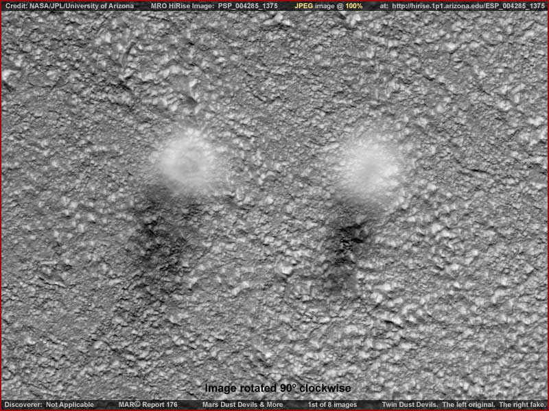 A fenti, első képen, két egymás melletti objektumot láthatunk a marsi tájban. Ezeket a képződményeket a hivatalos források minden esetben porördögként azonosítják, természetesen ezzel is rákényszerítve a hivatalos mantrát a megfigyelőre, miszerint a Mars száraz és szükségképpen halott világ. Néhányuk nagy valószínűséggel tényleg porördög, a földön is ismert jelenség. Azonban, habár porördögök nagy számban alakulnak ki számos területén, azért azt ne felejtsük el, hogy a Földet 72%-ban víz borítja, szükségképpen vizes bolygóvá téve azt, vagyis közel sem száraz égitestről van szó. Ne felejtsük el tehát, hogy a porördögök léte a Marson, ahogy a Földön is, még egyáltalán nem jelentik azt, hogy száraz, poros égitestekről lenne szó általánosságban. Néhányat ezen objektumok közül marsi porördögnek címkéznek, habár lehetnek vízkitörések, gejzírek is, merthogy igencsak hasonlatosak egymáshoz. Ám ez utóbbi feltételezés megengedése rögtön magával hozza a következtetést: a Mars felszínén valóban jelen van folyékony víz, ha másként nem is, legalábbis gejzírek formájában. Ennek beismerése természetesen egyáltalán nem kívánatos a titkos hatalom számára. kétségtelenül ez lehetett az oka annak, hogy amikor az 1970-es években a Viking felvtelein a NASA saját tudósa, Dr. Leonard J. Martin, a Lovell Obszervatórium munkatársa Flagstaffban, Arizóna államban, elismert és a fő áramlat tagjai között jelentős hírnévvel rendelkező bolygókutató tudós, hivatalosan is bejelentette a NASA által birtokolt felvételek alapján a marsi folyékony víz jelenlétét, nagyon gyorsan eltávolították a tudományos életből, a NASA-tól és a JPL-től is. Lásd a következő beszámolót 2003-ból: „Folyékony víz a Marson – első felfedezés.” Másrészről, egy bolygón, ahol a feltételezések szerint rendkívül száraz a felszín, sok-sok porördög jelenlétét várjuk el manapság. Hogy kellőképen meggyőzőek legyenek, folyamatosan és újra és újra porördögök jelenlétével etetnek bennünket, mint fentebb is. Továbbá, minden egyes, a marsi felszínen található sötét sávot, és tényleg igen sok van belőlük, azonnal beazonosítanak, mint a porördögök nyomait, melyek olykor tényleg ott is vannak. A tudósok pedig nagy egyetértést mutatnak a hírekben megjelent állásfoglalásokkal. Az egyetlen gond, hogy ezeknek a légörvényeknek elég erőseknek kellene lenniük ahhoz, hogy kellően nagy porördögöket hozzanak létre, melyek még a távoli műholdfotókon is látszanak, a meghatározás szerint pedig a mozgásuk során létre kell tudni hozniuk a megfigyelt sötét sávokat, ezekből pedig igen nagy számú van a Marson. Nagyon de nagyon kevés bizonyíték van arra nézvést, ahol működés közben láthatunk porördögöket, ahogy a fenti felvételen például. Figyeljük meg a Nap fényének igen erős visszaverődését, amint az a fenti felvételen jól látható, azért, hogy elgondolkozzunk rajta, vajon közönséges, a talajról felkapott por képes-e ilyen fényvisszaverődést kelteni, hiszen a levegő maga átlátszó. Ez ugye azt jelenti, hogy talajt igencsak felbolygatta a porördög elhaladtában, s nagy tömegű port kellett felkapnia, hiszen jelentős árnyékhatást is kivehetünk. Mozgása közben, folyamatos porkiszóródással kellene számolnunk. Nos, semmiféle porkiszóródást és haladási nyomot nem láthatunk ebben az esetben, akkor nem lehetne a jelenséget sokkal inkább vízgejzírként azonosítani, mint porördögként? A válasz olykor, de nem szükségképpen, más esetekben is az, mint most. Amennyiben a képfelbontás kellően elfogadható, a vízfeltörés talajból való kifakadásának helyén, és közvetlen szomszédságában vízfelhalmozódás történik, s ettől a bázisponttól a felcsapó vizet a szél akár el is sodorhatja valamilyen irányban. A felhalmozódó víz sötét sávot hagy maga után, illetve, néhány esetben, még erősebb fényvisszaverő tulajdonságú foltot, s ezeket bizony látnunk kellene az MRO HiRISE tekintélyes méretű jp2 felvételein, melyek ugye elméletileg kellő részletességgel rendelkeznek. Záró gondolatként megjegyezzük, hogy ha nem láthatunk sötét sávokat vagy másként megzavart felszíni réteget, és víz jelenlétét sem tudjuk kimutatni a gejzír tövénél, akkor mire véljük mindezt? Ez esetben lényegében visszatérünk a fent bemutatott, egyik szélétől másikig terjedő fotócsík-részlethez, a rajta látható két, hivatalosan porördögként beazonosított képződményhez. A „porördög” kifejezés inkább egyes számú, mint többes. Nos, mindez azért történt, mert Skipper hozta létre a jobb oldalit. Könnyű dolga volt. A fotó tehát a leghatározottabban hamis... Csak néhány percig tartott mindez számára a PhotoShop programmal, létrehozni az alakzatot, mindösszesen sötét és világos színű maszatolást használt még, utánozván a bal oldali eredetit, mindezek mellett ilyesmit még soha nem csinált korábban és még csak nem is képzett a látható képződmények előállításában. A jobb oldali forma élete első számú hamisítási kísérlete, ha pedig megfigyeljük a bal oldali eredetit, a hamisítvány igen jónak mondható. Nézzünk szembe a tényekkel, ha nem jeleztük volna, hogy a kép hamisított, talán néhány szakértő vette volna csak észre a turpisságot, vagy még azok sem. Legfeljebb elcsodálkoztak volna rajta, hogy két légörvény, ennyire közel egymáshoz, vajon miként jöhetett létre, ugyanabban az időben. Ennyi és nem több. Azonban, a legvalószínűbb felvetés jelen MRO fotócsík kapcsán az, hogy mindkét képződmény hamis. A jobb oldali, egyértelműen Skipper munkája, ám a bal oldali, hivatalosan „porördögnek” nevezett alakzat majdnem teljes bizonyos