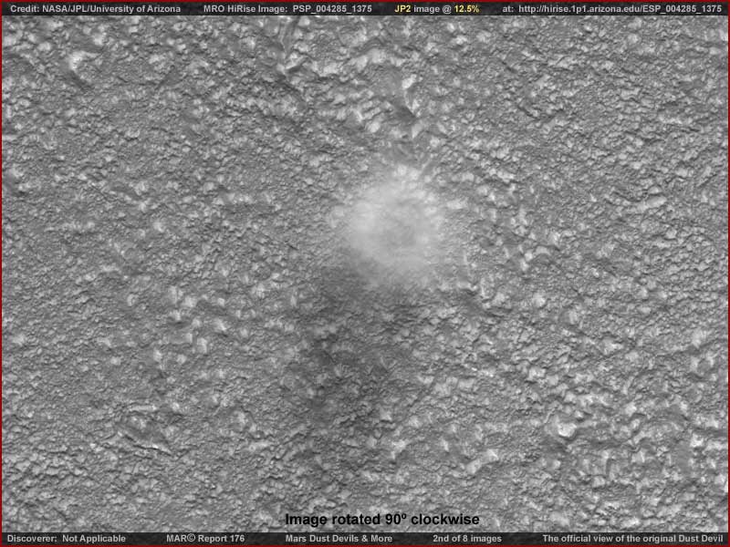 A fenti, második felvétel, a jp2 eredeti változat, a porördögről. A képződmény itt kissé nagyobb, ám mindösszesen 12.5%-is nagyításon mutatjuk be a jp2 eredeti méretéhez képest, összehasonlítás végett az első felvétellel, ám természetesen Skipper bármiféle beavatkozása nélkül. Bármiféle változtatás nélkül illesztettük ide a jp2-es változatát a képnek, hogy megmutassuk a felszínt a hivatalosan „porördögnek” kategorizált képződmény körül, ám jelentősen lekicsinyítve, hiszen a jp2-es felvételek túlságosan nagyok ahhoz, hogy teljes méretükben mellékelhetők lennének ide. Nincs annyi helyünk a szokásos beszámoló-keretek között. Ám az mindenféleképpen jól látható, hogy a képződmény körül a felszínen semmiféle nyom nem látszik. Nincs sem felkavarodott, sem nedves felszín. Az egyetlen sötét terület a helyszínen az a feltételezhetően szórt árnyék, a képződmény ugyancsak diffúz természete mellett. Ha valaki felveti, hogy az árnyék a sötét sáv, illetve a vízkifolyás, ez esetben hol van a képződmény árnyéka, annak a képződménynek, mely kellően nagy, magas és erős, hogy távoli műholdas felvételeken is feltűnjön? Hiszen nem néhány száz méter magasról készült műholdas felvételről van szó, hanem műholdas fotóról, több százszor nagyobb távolságról készülvén, mint a hagyományos légi felvételek. Néhányan megkérdőjelezhetik Skipper hozzáállását a képhamisítás tekintetében. Mások viszont felvethetik, hogy ha ő képes egy tökéletesen valós kinézetű hamisítvány létrehozására, akkor mi mindent követhet el a többi felvétellel, amit kihelyez a honlapjára? Nos, pontosan az ilyen gyanúsítások kivédésére adja meg minden esetben az adott felvétel hivatalosan elérhető változatát, az ellenőrizhető és elérhető hivatalos adatok között. Ezért is tartják távol tőle magukat a hivatásos „leleplezők”, nem mernek konfrontálódni a honlapjával. Pontosan tudják, hogy a hivatalos honlapokra történő utalás már eleve kifogja a vitorlájukból a szelet. Ez felvet egy újabb témát. Amennyiben a fenti, jp2-es felvétel helyszíne nem hordoz kellő bizonyosságot, akkor érdemes letölteni a 960 MB terjedelmű nagyméretű jp2-es felvételt a fenti hivatkozásról és az alant következőt, és alaposan megvizsgálni a porördögök látogatta vidékek tulajdonságait, immár 100%-os felbontáson. Semmi nyomát nem láthatjuk továbbra sem a felszín felkavarodásának vagy víz jelenlétének még a legalaposabb vizsgálatot követően sem. Mindez azért van, mert az eredeti felvételt alávetették a maszatolásos technika alkalmazásának, tehát nem valós. Azonban, jellemző mintaként szolgál arra, mit találunk közeli vizsgálat alkalmával, ezért vessünk is egy pillantást az alábbi fotóra.