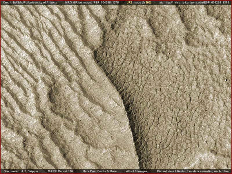 A fenti, negyedik felvétel jp2-es változat, 50%-os kicsinyítéssel. Némi tisztításnak vetette alá Skipper és egy kis színt is adott hozzá, hogy a lehetséges valamennyi részletet kihozza. Két, határozottan elkülönülő tájrészletet láthatunk, éles határvonal választja el őket egymástól. A bal oldali, párhuzamos, azonos irányítottságú képződmények természetes részeinek tűnnek a tájnak, míg a jobb oldali rész újabbnak tűnik, s mintha elfoglalta volna azt a részt, ahol megfigyelhető. A valós életben, a két különböző megjelenésű terület bizonyára más színben jelenik meg, az itt látható mesterséges színezés bizonyára nem valós. A színekben megmutatkozó különbség még jobban látszik, amikor szerves anyaggal találkozunk, szemben a természetes sziklákkal, vagy talajjal. Ez az egyik legfontosabb oka annak, hogy szinte sohasem láthatunk valós színeket, holott a kamerák képesek valós színes felvételeket készíteni, mégis a legtöbb kiadott felvétel fekete-fehér, vagy hamis színes, azaz hamis-színes. Ezek közül túlságosan sok tűnik furcsának, a természetes felszín pedig minden esetben geológiai eredetű sziklákat és talajt takar. Ha jelen esetben is erről van szó, akkor miként magyarázható? Rendben, valószínűleg mindenki a könnyebbik megoldással szeretné kezdeni, ezért először vegyük szemügyre a bal oldali, párhuzamos képződményeket. Első ránézésre erodált felszíni alakzatoknak tűnnek, lejtős területen alakultak ki. Azonban, ha így van, akkor figyeljük meg közelebbről az eróziós csatornákat. Nem árnyékos részeket látunk, mint eróziós kopás által kivágott kanyonok esetében, ellenkezőleg, valamilyen puha anyag tölti ki a repedéseket, pontosan ugyanaz a fajta növekmény, mint amilyent a „porördögök” alatt megfigyelhetünk. Figyeljük meg a világosabb színű felszíni foltok milyen egységes, ismétlődő mintát követnek. Az ismétlődő jelleg sokkal inkább az élet jellemvonása, mintsem eróziós jellegű geológiáé. Ami a jobb oldali, feltöredezett képződményt illeti, erősen emlékeztet egy hajdanán nedves, ám utána teljesen kiszáradt mocsaras vidékre, netán tófenékre. Ám, nézzük meg közelebbről. Vegyük észre, miként hajlik alá ez a mintázat a két vidéket elválasztó határvonal térségében és tűnik el az árnyékban. Ezen a rövid, lejtős szakaszon nem tekinthető geológiai képződménynek, sokkal inkább hordozza valamiféle gombatelep jellegzetességeit, letakarván az itt nem látható, valódi geológiai felszínt. A főbb tulajdonságokat tekintve elmondhatjuk, hogy mind a bal- mind a jobb oldali mező inkább hajlamos elnyelni a fényt, mint visszaverni azt, habár a napfény itt igen erős. A csupasz sziklák és a talaj geológia normálisan sokkal több fényt verne vissza. Habár a kérdés bonyolult, ám vannak jelei annak, hogy valószínűleg nem geológiai eredetű csupasz sziklákat és talajt látunk itt. Figyeljük meg az árnyékok szinte teljes hiányát is. Ami ugyancsak kulcstényező.