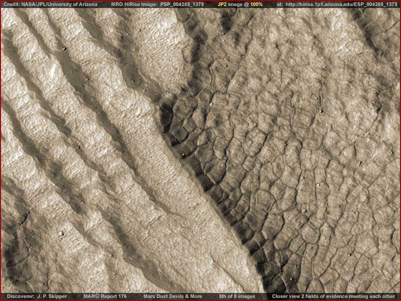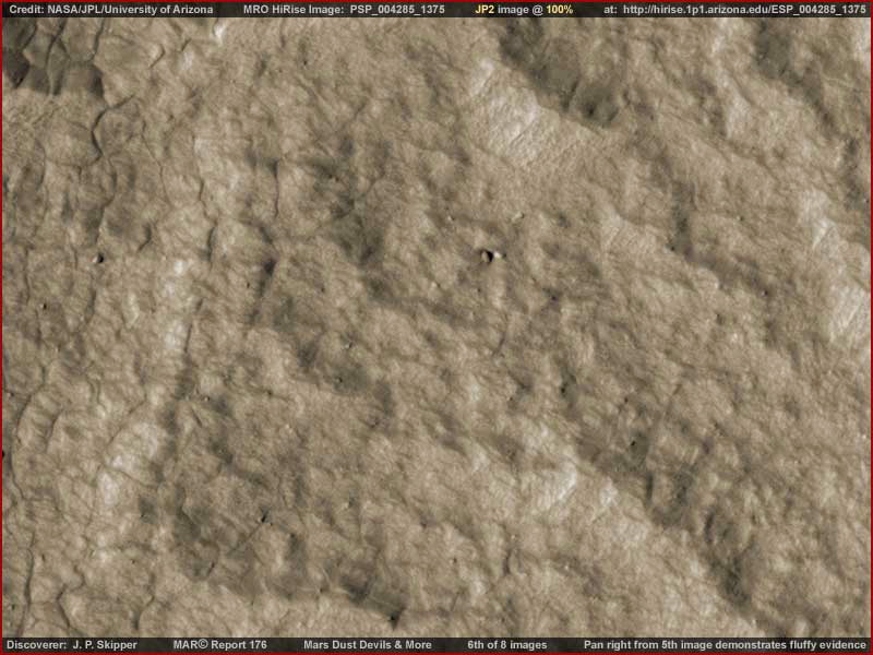A fenti, ötödik felvétel közelebbi rálátást tesz lehetővé a 4. felvétel párhuzamos irányítottságú képződményeit tartalmazó bal oldalára, s egyben a feltöredezett jobb oldalára is. Ismét felhívjuk a figyelmet, a bal oldalon a párhuzamos irányítottságú alakzatok nem sötét árnyékok, hanem valami mások, puha, ágas-bogas növekménnyel vannak ugyanis kitöltve. Ugyanazt a sötét színű, ágas-bogas képződményt látjuk, mint a harmadik felvételen, a porördögök alatt, ám ott jelentősen elmaszatolva. Ugyancsak vegyük észre a felszín egységes barázdáltságát a párhuzamos képződmények között. Az ismétlődő mintázatok nagy valószínűséggel kötődhetnek inkább folyamatosan jelen lévő élethez, mint élettelen geológiához.