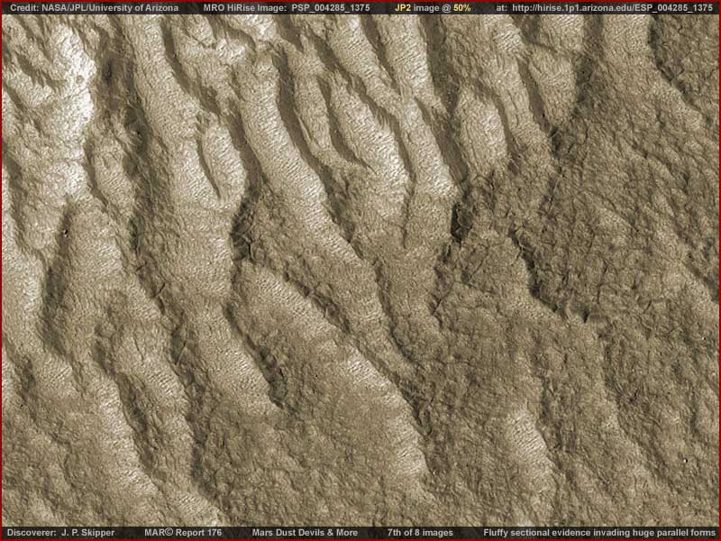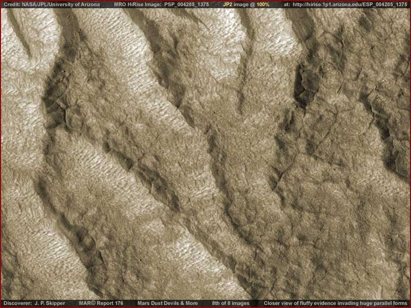 A fenti, 7. és 8. felvétel a jp2-es fotócsík másik területéről való, ezúttal a bal alsó részéről. A 7. felvétel esetén szélesebb, kontext látványt kapunk, míg a 8. kép a 7. felvétel egyik részletének közelebbi vizsgálatát teszi lehetővé. Megismételjük: ugyanazt a típusú képződményt láthatjuk, ugyanabban az inváziós állapotban, ám ezúttal a fotócsík egy másik részéről. A 4. és az 5. felvétellel együtt erre a bizonyos második helyszínre esett a választás, hiszen ismételten egy átmeneti területet láthatunk egyik féle képződményből a másikba. E fölött a pont fölött a párhuzamos alakzatok a jellemzőbbek, míg alatta a feltöredezett formák. Továbbá, ha valaki nagyon közelről megnézi, felismerheti az ágas-bogas formákat, s azon szándékukat, miszerint szorosabb, feltöredezett formák létrehozására törekszenek, de egészen pontosan nem kivehetően, nem lehetünk teljesen biztosak benne, hogy teljesen ugyanazok lennének. Skipper által tett újabb felfedezés a következő: annak ellenére hogy a párhuzamos alakzatok továbbra is a feltöredezett formák által invázió alatt vannak, a kanyonokban jól kivehetjük őket, a párhuzamos formák e pont fölött mégis láthatóan hatékonyabbnak tűnnek, és szabadabbnak a feltöredezett formák megszállása alól, pláne azokon a részeken, ahol a lejtő meredekebbé válik. Minél fentebb haladunk az itt bemutatott lejtőkön, annál több párhuzamos alakzattal találkozhatunk a feltöredezett formák inváziójával szemben. Figyeljük meg, látszólag a feltöredezett alakzat ezen a területen indítja elsődleges támadását a párhuzamos formák mezője ellen, ehhez első lépésként elfoglalja a kanyonokat, felfelé halad a mentükön és ezt követően csap ki oldalra. Ebből a képből arra gondolhatunk, hogy a párhuzamos formák között völgyek találhatók, ezeket foglalják el és töltik ki a feltöredezett formák előőrsei. Ez a viselkedés viszont arra is utal, hogy ezeken a lejtőkön némi víz is jelen lehet és a feltöredezett alakzat kihasználva e körülmény nyújtotta előnyöket indulhat a nagyobb, párhuzamos képződmények meghódítására. Ebből az következik a továbbiakban, hogy a feltöredezett forma jobban érvényesül az alacsonyabb területeken, ahol pára, ha valahol egyáltalán ott megtalálható, nagyobb mennyiségben lehet jelen és ezáltal könnyebben is kinyerhető. A jp2-es felvétel alapos vizsgálata megerősíti, hogy valóban ez a helyzet a feltöredezett képződménnyel, valóban hangsúlyosabb a jelenléte arrafelé. Azonban, amikor csak a feltöredezett képződmény túlsúlyba kerül, úgy tűnik, a párhuzamos formák tetejét foglalja el, s ez pedig arra utal, hogy a párhuzamos formák voltak ott korábban, és azok voltak a dominánsak. A tény az, hogy a párhuzamos alakzatoknak is hangsúlyos jelenlétével találkozunk a mélyebb földeken, elfedvén őket a feltöredezett formák, ahogy a lejtőkön is, ez pedig arra utal, hogy valamilyen életformával van dolgunk, a Marson is különlegesség számba megy, és szó sincs erodált geológiai felszínről. Azért említjük ezt, mert könnyű lehet bárki számára összekeverni a párhuzamos alakzatokat ha csak egy gyors pillantást vet rájuk, az erodált képződmények is erősen hasonlatosak, de éppen ezért van szükség az alapos vizsgálatra. Ha tehát figyelmesebben megnézzük a háttérként szolgáló, a „porördögök” alatti területet, mind nyilvánvalóbbá válik, hogy maga felszín egyáltalán nem olyan, hogy laza, poros anyagával táplálná ezeket a bizonyos légköri képződményeket, melyek olyan jelentős méreteket öltenek, hogy még a távoli műholdas képeken is látszanak, a lerontott felbontás és az elmaszatolt látvány ellenére, azaz, a méretük eléri a nagy tornádókét. Mindezek ellenére, a talajon semmiféle zavar nyomát nem látjuk, pedig egy ilyen méretű és erejű légköri képződmény nem haladhat végig sehol nyomtalanul. A legtöbb kutató számára a hivatalosan erőltetett „porördög”, mint jelen esetben is, félrevezetésként szolgál, figyelem-elterelésként, hogy ne nézzük meg a kép hátterét. A leggyanakvóbb kutatók számára piros zászlóként szolgál a helyszín, hogy nézze meg közelebbről a nyilvánvaló dolgokat, s aztán a felvétel többi részét is, a lehető legnagyobb alapossággal és tárgyilagossággal. Nos, ez a különbség a közmegegyezéssel alapuló világlátás és a tudományos kutatómunka között. Az előbbi érdekében elég „egyetértően bólogatni”, míg az utóbbi bizony kemény munka, a dobozon kívül gondolkozni pedig kifejezett erőfeszítést igénylő tevékenység. Mindenkinek önmaga kell eldöntenie, melyik utat választja, a felelőtlen és nyugalmas bólogatást, vagy a felelősségteljes kutatást a valóság nyomában.