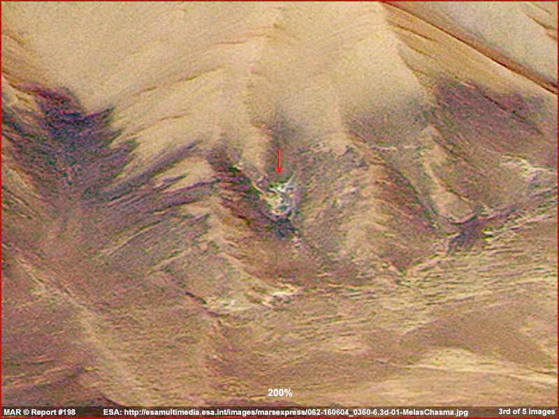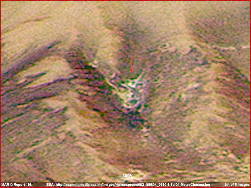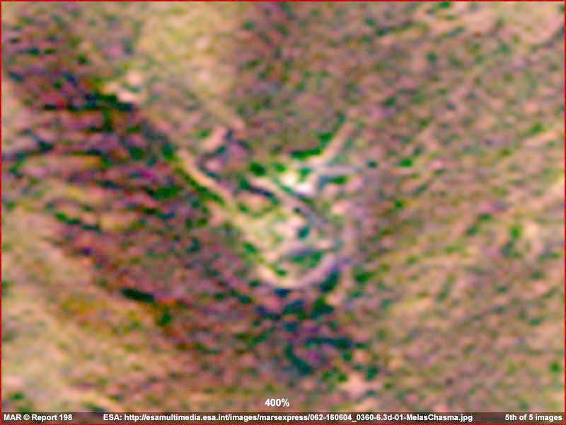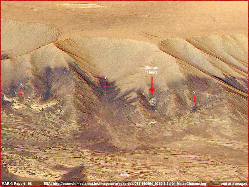 Eléggé megragadó, nem igaz? Mi a nyavaja ez itt piros szemekkel, odafészkelve egy völgy aljára, két hegygerinc közé? Úgy fest, mint egy szörnypofa valaki képzeletéből vagy rémálmából. Igazából nagyban hasonlít az elképzelésekre, a Csillagok Háborúja sorozat Sith lovagjának megjelenésére. Figyeljük meg az arcon a jeleket, illetőleg szimbólumokat. Nos, egyáltalán nem fest úgy, mintha egy ilyen alakkal szeretnénk találkozni az éjszaka közepén. Skipper figyelmét erre a képződményre M.S. Namba hívta fel, véleményét kérve. Emlékezzünk vissza, Skipper semmiféle változtatást nem eszközölt a képen, a képződmény jelenlétét ellenőrizte az ESA nagyfelbontású felvételei között, az alábbi cím alatt található meg: „Perspective View of Melas Chasma” (A Melasz Kazma távlati képe). Található egy további felvétel is az ESA Multimédia Galériájában, ám kissé eltérő szögből készült. Azon a felvételen az objektum nem annyira hangsúlyos, mint ezen a képen, habár a helyszín ugyanez. Azonban a „távlati kép” felvételt közvetlenül leellenőrizhetjük az ESA Mars tudományos adatai között. A kérdés tehát adott, annak ellenére, hogy valamit tényleg láthatunk a hivatalos felvételeken, a képződmény valóban ott van-e a felszínen? Attól, hogy valami megjelenik a hivatalos adatok között, még nem jelenti azt, hogy valóságos dologról van szó. Ebben az esetben, a felvétel számos képhamisítási alkalmazás jelét hordozza. Például, a hegyhát, mely a magasabb szintű fennsíkról az alacsonyabb felé tart, pontosan a szóban forgó objektum fölött, maszatolásos beavatkozás nyomát mutatja, valószínűleg sűrűn burjánzó növényzetet akartak ily módon eltüntetni, megzavarni a látványt. Ha így van, akkor rendkívül kicsi az esély arra, hogy aki ezt a beavatkozást végrehajtotta, kihagyta volna ezt a kiugró képződményt és símán továbblépett volna rajta. Pontosan ugyanígy, a völgy, ahol ez a képződmény van, két hegygerinc között, Skipper számára úgy tűnik, szintén képhamisítási eljárásnak esett áldozatul, elfedvén és elrejtvén mindent közvetlenül az objektum térségében. Ha így van, akkor ennek a beavatkozásnak köze van ahhoz, hogy ez a látvány egyáltalán létrejöhessen, magába zárván ezt a képződményt. Természetesen mindez azt jelenti, hogy valaki szándékosan kívánja velünk láttatni ezt az objektumot. Nemcsak ez a cél, hiszen egy olyan alak megjelenése, mely démoni külsővel rendelkezik, vagy a gonosz Sith Lordéval, nyilvánvalóan szembeötlő és erős negatív érzelmeket kelt a legtöbb megfigyelőben, akkor logikus a következtetés, hogy aki az egész beavatkozást végrehajtotta, éppen ezt a kellemetlen érzést igyekezett kiváltani. Így lehet az érzelmekre is befolyást gyakorolni a puszta fizikai beavatkozás mellett. Amikor ilyen szintű manipuláció történik, akkor nagy óvatosságra van szükség, komoly gyakorlati tapasztalatra, hogy ne kerüljünk a látvány hatása alá. Ha például valós alakzatot látunk a felszínen, akkor valószínűleg egy több elemből álló művészeti alkotás részéről van szó, valamilyen téma megjelenítéséről. Valaki megsemmisíthette a gyűjtemény további elemeit, jóval ártatlanabb látványt sugallva számunkra, eltávolítván az objektumot környezeti összefüggéseiből, meghagyván ott valamit, és ezáltal is elterelve gondolkodásunkat és figyelmünket. Ha így van. akkor ismét meg kívánnak vezetni bennünket, hiszen a titkos hatalomban senkinek nem lehet önmagában célja az élet nyomainak (növényzetnek vagy civilizációsnak) az elrejtése, miközben ilyen teljesen nyilvánvaló objektumot hagy maga után. Arra gondolhatunk, hogy valaki, a képhamisítások nyomán megpróbál minket manipulálni, nyitottabb gondolkodásúakat, a Marssal kapcsolatos sokkal negatívabb érzések keltésében, illetve, az idegenekkel kapcsolatban általában. Mivel a népesség többsége nem gondolkozó alkat, a vizuális megjelenés kellően hatékony a kezelésükre, s ha egy démonfejjel találkoznak, a keltett negatív érzések még inkább eltávolítják őket a gondolkozástól és a kutatástól. Mindkét reakció erősen kívánatos számukra, hiszen visszautasítást vált ki. Két legyet ütnek egy csapásra a Sith fej stratégia felhasználásával, hogy úgy mondjuk. Ez a módja annak, miként lehet felhasználni a bolygókutatás tudományát egyes nemzetek önös céljaira. Nemcsak a valós dolgok látványának megtapasztalásától fosztanak meg bennünket, hanem a folyamatos manipulációkkal az érzelmeinket is az általuk elvárt formára hangolják, alig foglalkozva a társadalom jóléti állapotának előre vitelével. Bármiből a tényleges valóságból, azon kutatási eredmények közül, melyeket a lakosság finanszíroz, tehát azokból az igazságmorzsákból, melyek valóságosságát ellenőrizhetjük is, csak akkor részesülhetünk, ha hibáznak a hamisítási és/vagy félrevezető eljárások alkalmazása során. Skipper álláspontja az, hogy a megfigyelhető képződmény megalkotása szándékos manipuláció része, és egyetlen dolgot támaszt alá, hogy létezik a képhamisítás, már a tudományos adatok szintjén is.