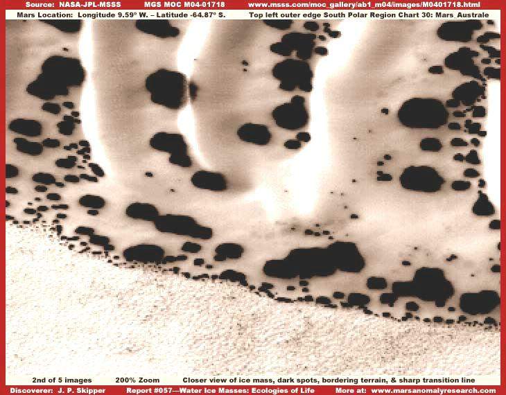 A fent látható negyedik képrészletet egy újabb fotócsíkból vettük, archívumszáma, M04-03317, igen jól reprezentálja ezeket a fajta nyomokat, fokozott figyelmet érdemelnek a jellemző sötét foltok, piros nyilak mutatnak rájuk a kép felső részén; maga jégpajzs pedig, amelyen megtalálhatók, az eddig bemutatottaknál sokkal nagyobb. Szenteljünk alapos figyelmet a sötét színű, ám átlátszó foltoknak, még sötétebb folttal központi részüknél, a mélyükön, aztán hasonlítsuk össze a jóval sötétebb és masszívabb megjelenésű foltokkal jelen beszámoló első három felvételén, ahol nem látható ez az átlátszósági tulajdonság, ahogy a középponti sötétebb folt sem. Lényegében ugyanazt a dolgot látjuk, ám fejlődési ciklusának különböző állapotában. A sötétes, átlátszó, latyakos-jellegű foltok - a fenti képen -, korábbi fejlődési állapotukban mutatják a sötét, az első és második felvételen látható, sokkal masszívabbnak mutatkozó foltokat. A fenti képen, bal oldalra a sötét, latyakos színű foltoktól, észak és dél felé húzódóan világos sáv látható, újfent példa az olvadó víz által erodált felszínre; a fagyott rész határát piros nyilak jelzik. A sötét foltok a széles és lejtős sáv alján, mélyebben helyezkednek el, mint jobb oldali társaik. Figyeljük meg, milyen egységesek a nyíllal jelzett sötét foltok mind színben, mind méretben. Miközben az európai tudósok arra gyanakszanak ezek a foltok egyszerű mikroorganizmusok tevékenysége nyomán jönnek létre, véleményünk szerint valóban életnyomokkal állunk szemben, azonban sokkal összetettebb életciklusok formájában, mint ahogy ők gondolják. A piros nyilakkal jelzett, világosabb színű foltok kisebb, tápláló tavacskákként szolgálnak, ezeket pedig a szerves életük első fázisában lévő élőlények hozzák létre, sokkal inkább, mintsem egyszerűen csak beszínezik az egyébként kristálytiszta vizet. Hadd adjunk minderre magyarázatot, és magára a folyamatra, ami véleményünk szerint itt végbemegy, kapcsolódva a vízjégtömegekhez, ezután pedig az olvasó meg fogja látni, miként tér el álláspontunk az európai kutatókétól és következtetéseiben hogyan megy jóval messzebb annál. Vegyük észre, hogy valamennyi kis tavacska, álljon akár egyedül, vagy kellően nagyra szétterülve összekapcsolódva szomszédaival, alapszínénél jóval sötétebb foltot tartalmaz, nagyjából központi részénél. E jelenség rendkívül jellemző ezekre a kis tavacskákra. Úgy hisszük, amit látunk, egyfajta élőlény, életciklusának kezdeti fázisában, és azt gyanítjuk, ez az életforma rendkívül alkalmazkodó, nagyobb kolóniákat alkotó szervezet. A fejlődés későbbi állapotaiban ez az élőlény egyfajta gomba-kinézettel rendelkezik, igen hasonlatos a korallok által a víz alatt kiépített rendszerekre, amennyiben a tengervízre felülről tekintünk. A fenti felszíni és vízből kinyúló életforma nagyszámú spóra révén burjánzik, mindenekelőtt a környéken, ahová a szél hordja el őket. Ebből kifolyólag szilvamag-szerű formák jelennek meg közvetlenül a sötét foltok környékén, olykor észre is vehetők a MOC felvételein. Sajnos itt és most nincs rá lehetőség mindezt alátámasztó fotórészleteket felsorakoztatnunk. Természetesen a víz kulcsfontosságú az élet fennmaradáshoz itt, amikor pedig az életképes spórák elérik a talajt, és elegendő víz áll rendelkezésre a közelben, akár a felszín alatt, akár mint jégpajzs formájában, elkezdenek növekedni a talaj felszíne alatt, egy folyékony vízzel kitöltött üregben, melyet a kolónia magja köré hoznak létre. Amint a sötét színű kolóniák szaporodásnak indulnak, növekednek és szétterjednek, talán elegendő hőt képesek összegyűjteni ahhoz, hogy kedvező körülményeket teremtsenek további víztömegek elolvadásához, az üreget kitöltő életformák így növekedésnek indulhatnak, sőt, az üreg méretét is képesek jelentősen tágítani a felszín alatt, mind nagyobb és nagyobb mennyiségű „tápláló levest” összehozni környezetükben saját fennmaradásuk biztosítására. A napfény természetesen szintén igen fontos e folyamathoz, az élőlények fejlődésének megindulásához, akár közvetlenül a felszínen, akár kicsivel mélyebben, közvetlenül a felszín alatt, amennyiben a jégtömeg elegendő tisztaságú ahhoz, hogy kellő mennyiségű fényt átengedjen. Ez a földalatti, vagy jégalatti, tápláló levest tartalmazó üreg folyamatosan növekedik, sőt, méretesre tágulva, az üreg elérheti azt a nagyságot, ahol már a teteje beszakad, létrehozván a most már határozottan kivehető, vízzel töltött, sötét színű felszíni bemélyedést, pontosan olyant, melyet a fenti negyedik fotón is láthatunk tömegesen, piros nyilakkal megjelölve. Ha valaki közelről megnézi a fenti, negyedik felvételt, láthatja, hogy minden egyes sötét színű, folyadékkal kitöltött bemélyedésben megtalálható a maga még sötétebb központi foltja, talán az eredetileg kialakult üreg látható még továbbra is ebben a formában. Továbbá, ha valaki még ennél is közelebbről néz meg néhány sötét foltot, ismét csak a központi területeken a harmadik felvételen, pontosan ugyanezeket a még sötétebb formákat figyelheti meg a központi részeiken, csak valamivel nagyobb távolságból és amiatt kevésbé jól láthatóan. Amikor ez a folyamat talajon megy végbe, kellő mennyiségű táplálóanyag forrással, és egyéb, kedvező környezeti feltételek mellett, a szervezetek folyamatos fejlődésének biztosítására, a kolónia fokozatosan túlnövekszik a kezdeti üregéből és átalakul ebből a folyékony, táplálékleves fejlődési állapotból egy jobbára felszíni, azonban továbbra i