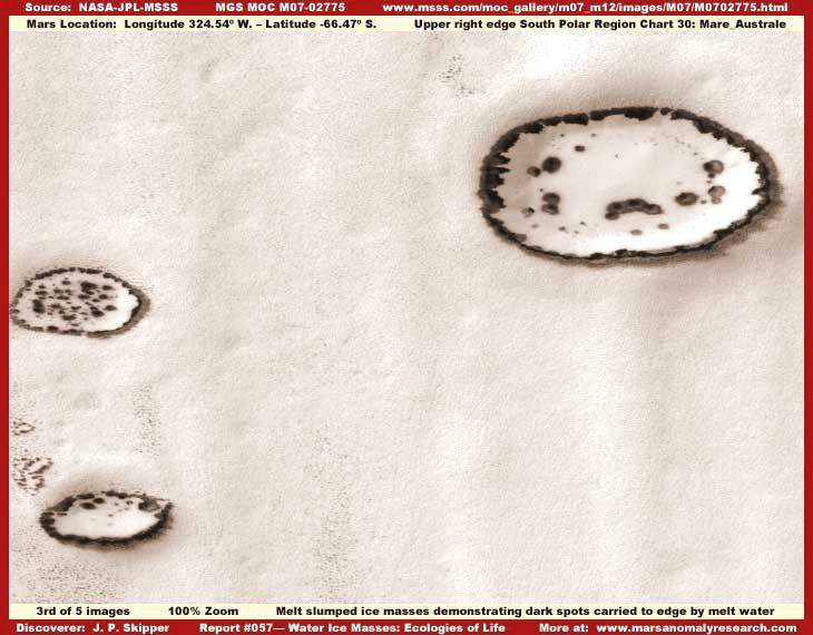 A sorozat harmadik felvétele egy másik, az M07-02774 archívumszámú fotócsíkból való, újabb jellemző jégpajzs látható rajta, más helyszínről, azonban azonos típusú göröngyös felszínen elhelyezkedve, többé-kevésbé sík vidéken, kissé nagyobb távolságból, ami miatt a felszín kevésbé látszik göröngyösnek. Ezek a fagyott vízjégtömegek a harmadik felvételen,jól láthatóan sokkal erősebb olvadási fázison mentek át, mint az az M04-0718-as archívumszámú fotócsíkból származó első két felvételen megfigyelhető. Ennek az erősebb olvadási tényezőnek köszönhetően valamennyi itt látható jégpajzsra jellemző, hogy szinte kör alakúak, megroggyantak, simák és laposak, alacsonyabb központi területtel és szélesebb, laposabb széli részekkel. Rendkívül fontos, ezért kérjük feltétlen vessen egy alapos pillantást arra, miként mosták le az alacsonyabban fekvő részekre, a jégpajzs kiemelkedő területéről, kellő erővel rendelkező, olvadékvizek a sötét foltok valamennyijét, összegyűjtvén őket a mélyebb részeken, miközben jelentősen lecsökkent a központi rész magassága, a sötét foltok pedig a mélyebb részeken olyan sűrűségűre tömörültek, hogy folyamatos, sötét gyűrűt formáznak a jégpajzs külső peremén. Mindez szemmel látható a felvétel alapján. Mindez azt bizonyítja, és ez rendkívül fontos, hogy ezek a jégtömegek – legalábbis időközönként – a szilárd állapotból a folyékony halmazállapotra váltanak, a felszínükön mindenképpen. Arra is bizonyíték – ez is rendkívül fontos -, hogy a sötét foltokat ezek az olvadékvizek magukkal viszik lefolyásuk mentén, ez viszont annak igazolása, hogy a foltok közvetlenül a felszínhez, vagy ahhoz közeli rétegekhez kötődnek elsődlegesen, nem nyúlnak le mélyebb rétegeibe a jégpajzsnak és nem is onnan származnak. Ez a felfedezés viszont komoly görcsöket okoz mindazoknak, akik azt próbálják állítani, pusztán valamiféle természetes eredetű geológiai kémiai működésről lenne szó, valamiféle anyagról, reakcióról, ami a felszíni rétegekből leszivárog a mélyebb rétegekbe. Továbbá, nagyon közelről vizsgáljuk meg és alapos figyelmet szenteljünk a jégpáncélok jobb oldali alsó részén a sötét foltok rendszerének; ezeken a területeken ugyanis mintegy lecsúsznak a jégpajzs és a természetes felszín elválasztó vonaláról, a jégpajzs külső, foltokkal sűrűn befedett részéről, a fenti, harmadik felvételen. Mindez nedvességgel erősen átitatott környezetre vall, ezen a keskeny sávon legalábbis bizonyosan, a környező terület és a jégpajzs közvetlen szomszédságában, a demarkációs vonal mentén; ez alátámasztja a folyékony víz határozottabb jelenlétét a szélhez közel eső területen. Habár jellemzően mindegyik jégpajzs ugyanazon oldalán figyelhető meg ez a fajta fokozott nedvesedés, mindez lehet véletlen egybeesés is, a szélső, nagyjából gyűrű alakú területeken csoportosuló foltok külső szélét tekintetbe véve; az is lehet, egyfajta árnyékot látunk, mivel a jégpajzs szintje alacsonyabban van, mint a környező felszíné, ez igaz a központi területre is, láthatólag az is alacsonyabban van, mint a szomszédos részek. Ezek a nyomok igen jellemzőek a vízjég átalakulására, megfigyelhető, legalább időlegesen folyékony állapotban van és lefolyik a jégpajzsok kiemelkedő központi részeiről, majd tovább a jégpajzs szélei felé, s viszi magával a sötét foltokat. Mindez a folyamat addig tart, amíg a teljes jégpajzs fel nem szívódik.