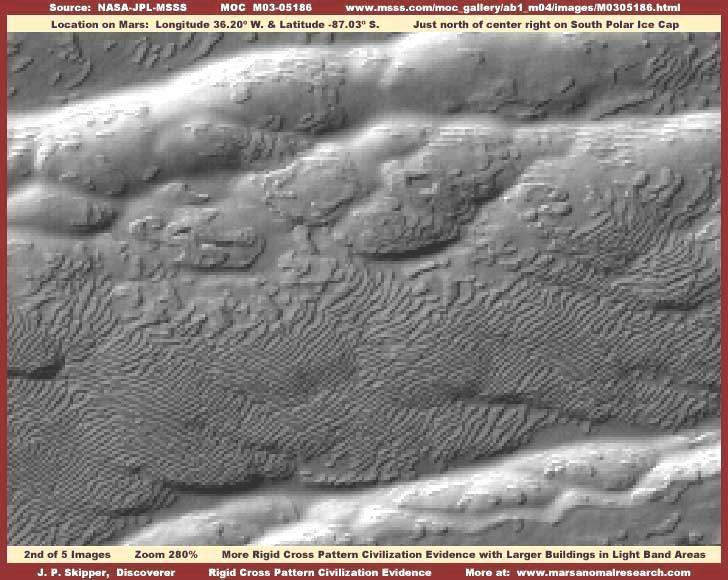 A fenti kép az M03-05186 archívumszámú fotócsíkból való, és javasoljuk igen közelről való szemrevételezését, így inkább előtűnnek a részletek, és az olvasó megláthatja, hogy a sötét területen minden egyes kicsiny objektum négyszögletes alakú, emellett egységes, mind méretben, mind magasságban, összehasonlításképpen a szomszédaikkal; ilyen objektumok ezrei építik fel szoros, tömött sorokban az itt látható teljes területet. Még fontosabb az a precizitás, miként egymás mellett elhelyezkednek, tökéletes pontosságú, minden egyes objektum kifogás nélkül illeszkedik a sorokba, megfelelő szögben, pontosan úgy, mint a sírkövek a katonai temetőben. Bárki számára egyértelműnek kell lennie, bármilyen fényviszonyokat is veszünk figyelembe, ilyen formák semmiféleképpen sem jöhetnek létre, sem szabályosságukban, sem hideg precizitásukban; határozottan kijelenthetjük, semmiféle természetes geológiai vonást nem viselnek magukon, sokkal inkább elgondolást, tervezést, mesterséges tevékenységet, és intelligens élet nyomait. Azonban ez még nem minden, vessünk még egy közeli pillantást a világos színű részekre az első kép felső részén. Itt már nagyobb épületszerkezeteket is ki lehet venni, jórészt köddel beborítva, valamint a felbontással manipuláló képhamisítási alkalmazásokat. Mindezek ellenére mégis láthatjuk az épületek tetejét és meglehetősen jól alátámasztható így, mit is látunk itt. A területre nagy távolságból látunk rá, mégis a dolog egyértelműnek tűnik, valamiféle civilizációs központtal állunk itt szemben, kisebb és nagyobb épületszerkezetek megjelenésével. Szerencsére az automatikus képhamisító program kihagyta a nagytömegű és aránylag kis méretű keresztsorokban elhelyezkedő struktúrákat a közvetlen képhamisítási technika alkalmazása alól, kétségtelenül azért, mert túl apróknak tűntek számára, a program paraméterei nem tették lehetővé felismerésüket, bizonnyal abból a meggondolásból indultak ki, hogy a felbontás lerontása önmagában elegendő ilyen objektumok eltüntetéséhez. Az embertől eltérően, az automatizált számítógépes program nem láthatja előre, az igen kis objektumok esetében főleg (természetesen sokkal jobb felbontáson, amit nem osztanak meg velünk), hogy azok egyedi objektumok és habár túl aprók, hogy részleteket felismerhessünk belőlük, azonban komplett rendszert alkotnak, még ekkora távolságból is jól kivehetően, de immár nem a program, hanem a kutató számára áll összes a keresztsoros elrendezés szabályos mintázata, ami egyértelműen civilizációs nyomot sejtet, akármilyen félét is. Még a felbontás lerontása sem volt elég, felismerhetjük a képhamisítási eljárás során felvitt foltokat, néhány esetben a dolog egyértelmű.