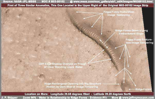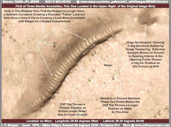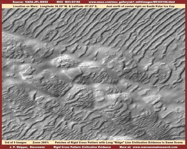 A sorozat itt látható első felvételén egy igencsak önmagáért beszélő „rendellenességgel” találkozhatunk, az MGS MOC M04-00291 hivatalos archívumszámú fotócsíkból kivett részleten, igazából ez tekinthető annak a felvételnek, mely John Skippert a mars-anomáliák kutatására serkentette. Talán vannak, akik emlékeznek rá, ez a felvétel Richard Hoagland honlapján jelent meg először, mindössze néhány nappal később, mint ahogy a MOC hetekkel azelőtt készített felvételei közül néhány a nagyközönség számára is elérhetővé vált. Számos egyéb, érdeklődésre kevéssé számot tartó kép közé volt eltemetve, ahol néhány olvasó rábukkant, anélkül, hogy különösen mélyre kellett volna ásnia érte. Teljességgel érthetetlen, ilyen jelentős „rendellenesség”, miként kezelhető ennyire nemtörődöm módon. Miért? Azért, mert már első ránézésre is egyértelmű, nem természetes geológiai alakzattal állunk szemben, ellenkezőleg, kiáltó jelentőségű életnyomokkal, azon a Marson, mely a hivatalos verzió szerint csontkeményre fagyott, száraz és poros, halott világ, olyan halott, amilyen csak lehet. A kép tisztítását követően egyértelműbben kivehetők a rövid, párhuzamos bordák sora, itt is, ahogy sokfelé, szerte a Marson, oly módon, ahogy semmiféle - a földi geológiai formákat ismerve -, természetes geológia képződmény nem szokott viselkedni. Ha nincs párhuzamba állítható természetes geológiai forma, ami akár csak távolról hasonlítana erre, akkor az egyetlen logikus következtetés ezekre a rendellenes formákra, hogy azok bizony valamiféle életnyomok. A következő kérdés ezután, hogy miféle életnyomok, milyen célból hozták létre ezeket a formákat, nemcsak mint szokatlan alakzatokat a felvételeken, hanem olyanokat, melyekre félrevezető magyarázattal szolgáltak a hivatalos szervek. Miután Skipper megpróbálta Hoaglandot és társaságát rávenni, hogy ennek a hihetetlen bizonyítéknak adjanak nagyobb nyilvánosságot, mint amekkorát a honlapja nyújt, felhasználva média-összeköttetéseiket, különös módon nem történt semmi ez ügyben, Skippernek elege lett, és a saját kezébe vette a dolgokat, e-mailek sorozatát küldte el a médiának, hogy a megfelelő nyilvánosságot megteremtse. Nyilvánvaló, ha a NASA fordult volna e különös felfedezéssel a médiához, mint jelentős felismeréssel, ez esetben minden jelentősebb média kötelességtudóan ismételgette volna a végtelenségig, és bőségesen adta volna a jelentéseket, mire a hihetetlen felfedezésre válaszként, azonnal megjelent volna a fő áramlat tudós-serege, akik azonnal tagadtak volna mindent, és védekező álláspontra helyezkedve tudatták volna, hogy a bejelentés nem hivatalos NASA vagy JPL forrásokból származott. Természetesen mindez semmiféle különbséggel nem bír, hiszen a hivatalos adatok alapján bárki könnyen meggyőződhet a felfedezés hitelességéről, ehhez már elég egy egészen egyszerű internetes böngésző, és néhány perc ráfordítás. Egészen szánalmas az a helyzet, amikor a média számít elsődleges hírforrásnak és nem maga a nyilvánvaló bizonyíték. Skipper természetesen pontosan ezt várta, azonban folytatta a nyomásgyakorlást médián keresztül, a világ más részein is, ennek következtében lassú változás kezdődött. Végül 2000. júniusában a kutatási anyagait figyelemreméltónak találták, és meg is jelentették a http://www.sightings.com (manapság http://www.rense.com) oldalon és néhány más helyen is az USA-ban, ennek köszönhetően jelentős érdeklődés támadt a téma iránt, és ez folytatódott is, más médiumok is felfigyeltek rá. Nyilvánvaló, hogy ez a behatárolt nyilvánosságra hozatal, a korábbi kényelmes hozzáállást, miszerint igyekezett Skipper a színfalak mögött maradni, megváltozott, közvetlen részvétellé. Ettől a pillanattól kezdve számos felfedezést tett a Marssal kapcsolatban, talán többet mint bárki más, akiről csak tud, természetesen mindazokat kivéve, akik a titkokat birtokolják, a nyilvánosság elöl elzárt megállapodásokat kötik, és akik karrier-megfontolásokból nem beszélnek. Akkoriban teljesen kezdő volt a pályán és a számítógépes ismeretei is erősen korlátozottak voltak, grafikus programokhoz pedig egyáltalán nem értett. Igazából soha sem használt grafikus számítógép-programokat, még a legegyszerűbbeket sem. Valójában biztosítási ügynökként dolgozott, több évtizedes tapasztalattal, ezt a hivatásos objektív tapasztalatrendszert hozta át, mint hátteret, a kutatómunkája etikájába. Valamint ennek köszönhetően nincsenek előítéletei vagy elvárásai, melyek hatással lennének az objektivitására, ez pedig nagyon fontos ebben a munkában. Évekkel ezelőtt megtanulta miként gyűjtsön adatokat, lépésről-lépésre és hogyan illessze össze a darabokat. Nem törekedett arra, hogy a hiányzó részeket saját előre kitalált gondolataival töltse ki. Még egy adalék, ez a fajta érdeklődése már évtizedek óta fennáll, és eközben folyamatosan figyelemmel kíséri az űrkutatást is, egyben újfent megerősítést kap arról, hogy a hivatalos jelentések a téma kapcsán bizony nem a teljes igazságot tartalmazzák. Talán mindez az eddigi életpályájából adódott, abból, milyen módszeresen gyűjtötte az információt és nem alkalmazott előfeltevéseket. Továbbá, különösen igaz ez, amikor valaki el akart vele fogadtatni valamiféle koncepciót, azt sugallván, hogy nincs szükség alaposabb vizsgálódásra. Minél idősebb és tapasztaltabb lett az életben, annál könnyebben tudta „kezelni” az összegyűjtött információkat, gyorsabban látott át a helyzeten, így az igazság kevésbé szenvedett csorbát. A tapasztalatai szerint az űrkutatásban nagyon is so