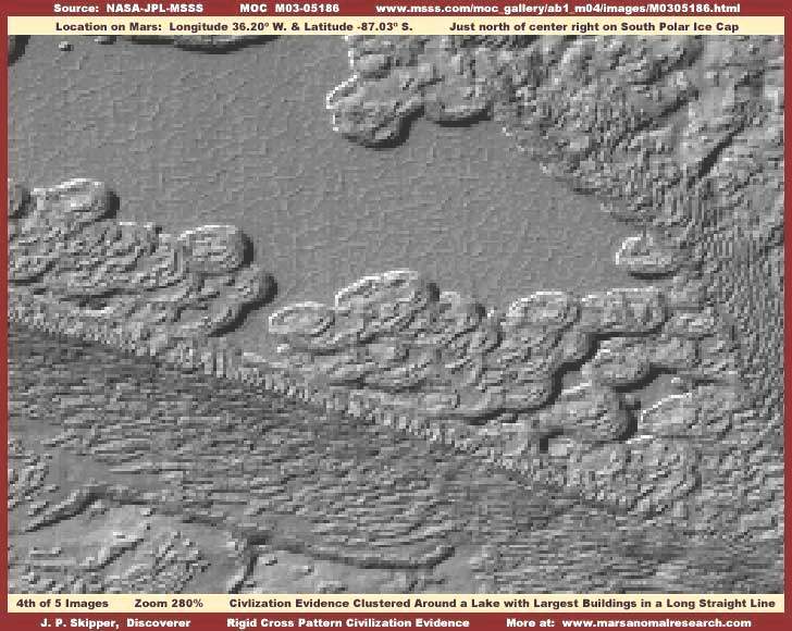 A fenti negyedik felvétel az első háromnál feljebb lévő részét ábrázolja a hivatkozott fotócsíknak. A felbontás nyilvánvalóan szegényes, az egyedi objektumok emiatt összekeverednek és egymásba mosódnak. Azonban alapvető formák és nagyobb kiterjedésű mintázatok továbbra is jelen vannak, esélyt adva számunkra, hogy megvizsgálhassuk és néhány ésszerű következtetést levonhassunk. Amit láthatunk az nem más, mint egy civilizációs nyom egy tó partján csoportosulva. A tó felszíne kevert mintázatot mutat, véleményünk szerint valószínűleg alacsony épületeket sorait láthatjuk, magában a tó által kitöltött mélyedésben, részben a sekély vízben állva, sajnálatos módon szándékos ködösítésnek/elmosásnak kitéve, ennek a nagyon finom képhamisítási eljárásnak, főleg az épületek térségében, és azon a felbontási szinten, amit a nagyközönség számára sohasem mutatnak be. Azután amikor a nagyon jó felbontású képet úgy módosítják, mintha nagyon nagy távolságról készült volna, miként az itt is látható, az egyedi objektumok megfigyelhetősége elveszik, többé már nem láthatók, azonban az épületek mintázata átüt a „tó” felszínét érintő hamisítási technikán, és továbbra is kivehető. Vegyük szemügyre a kép bal oldalától jobb felé húzódó hosszú egyenes vonalat a tó innenső oldalán, magasabb épületek alkotják, és azt is vegyük észre, a jelenség már nem figyelhető meg a tó jobb oldali részén hasonló módon. Mint más beszámolókban is olvasható, a hosszú egyenes sorokban építkező civilizáció leginkább a Déli Sarki területekre jellemző. De mit jelent ez? Arra gondolunk, az épületek tájolási iránya megegyezik a víz áramlási irányával, bizonyára valamilyen kapcsolatban lehet tehát ezzel, de szerepe lehet valamilyen társadalmi tényezőnek is. Sajnos a távolsággal való manipuláció szinte állandóan jelen van, ebből következően az igen rossz felbontás, ráadásul az egyedi objektumokat is hamisítják, mindezek együtthatásának eredményeként jön létre az a látvány, amit már mi is megnézhetünk, emiatt annak megbízhatóságát eleve megkérdőjelezhetjük, kivéve abban az esetekben, ha valami tisztán látható, mint például a kiterjedt mintázatok.