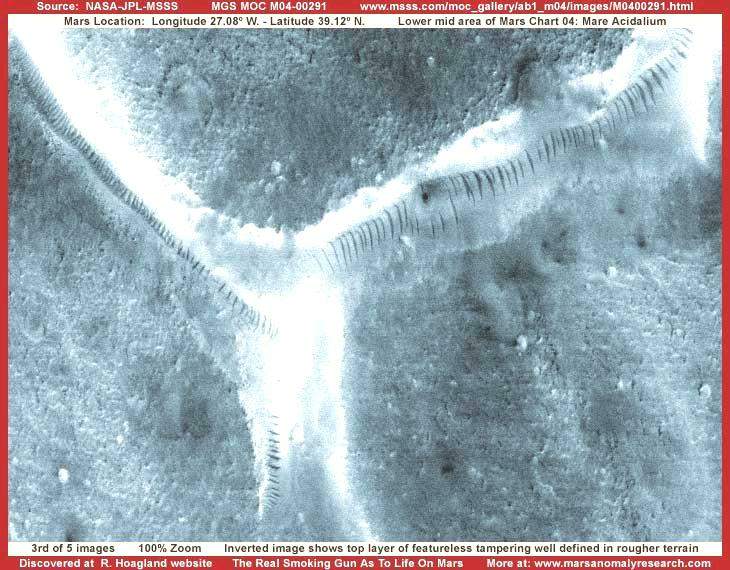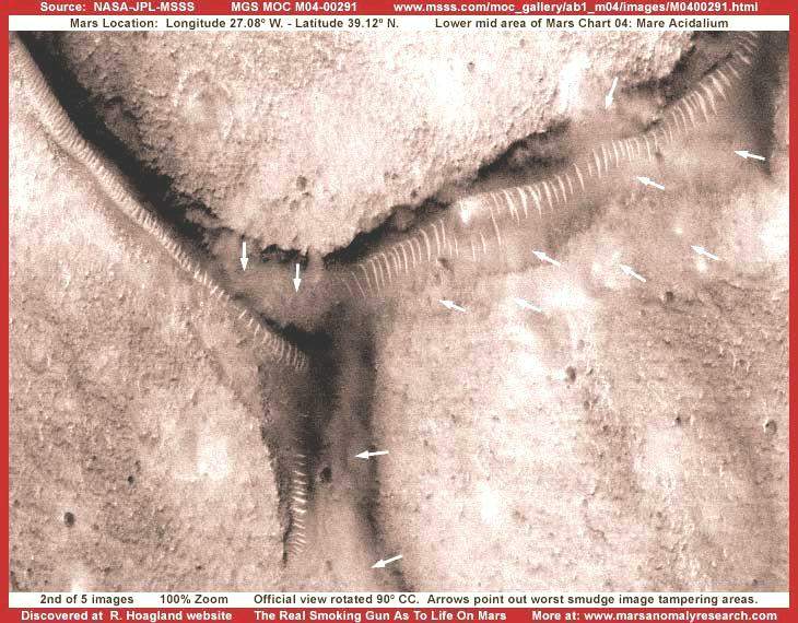 Miként az első negatív képen, a legbeszédesebb dolog ezen a negatív felvételen, amit minden megfigyelően észre kell vennie, a ködös, elmaszatolt, jellegtelen megjelenést adó képhamisítási alkalmazások sora; igen jelentős a felső részen és mindkét végén a bordavonalak által fémjelzett képződménynek. Komoly nehézségekbe ütközik mindezek felismerése a fekete-fehér felvételeken és nem könnyebb a színesen sem, a negatív felvételen azonban már jól kivehető a sokkal több részletet tartalmazó környező természetes vidék és a mesterségesen felhordott, részleteket nem tartalmazó képhamisítási eljárás között, közel a bordavonalakhoz. A bordavonalak egyenkénti szélessége, illetve a köztük elhelyezkedő térség, arról beszél, hogy a vízhez kapcsolódó élő organizmusok már nagyon hosszan tartó folyamat eredményeként hozták létre ezeket a formákat. Ezek a bordavonalak szélesek, ezért minden bizonnyal régiek. Ebből a nézőpontból tekintve, idős és állandósult ökológiai rendszerre tekintünk le ezen a helyszínen. Skipper első beszámolóiban az M04-00291 jelű felvételen látható alakzatokat „alagutaknak’ jegyzi, kijelentése: „Az igazi füstölgő fegyver: élet van a Marson” – természetesen megállja a helyét. A helyzet annyiban változott, hogy a bordavonalak nem valami hatalmas, csőszerű (féreg-jellegű) életre utalnak, hanem miriádnyi parányi, vízben élő organizmusra, melyek hosszú idő alatt ásványokat kiválasztva felépítik ezeket a bordákat, ahol csak sekély és áramló víz van jelen. A tény az, a kijelentés alapigazsága nem változott meg, élet van a Marson. Továbbá, bordavonalak megszámlálhatatlan mennyiségben fordulnak elő a Marson a MOC felvételein, beleértve olyan helyeket is, ahol jelenleg már nem található víz, kiszáradt vidékeken, ahol már csak fosszilis maradványok igazolják, ez az ősi életforma természetes a Marson. Ezen ősi formák túlélése ha fosszilis formában is, de azt támasztja alá, milyen szigorú és kemény feltételeknek, a természeti elemeknek és az időnek is, képesek voltak ellenállni.