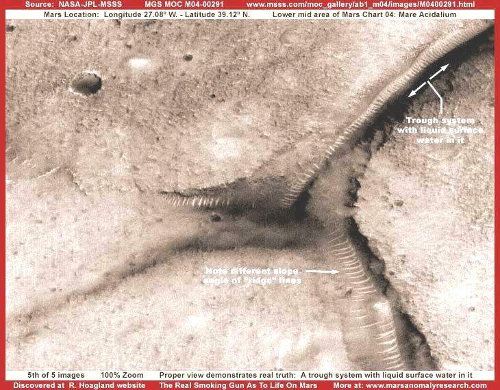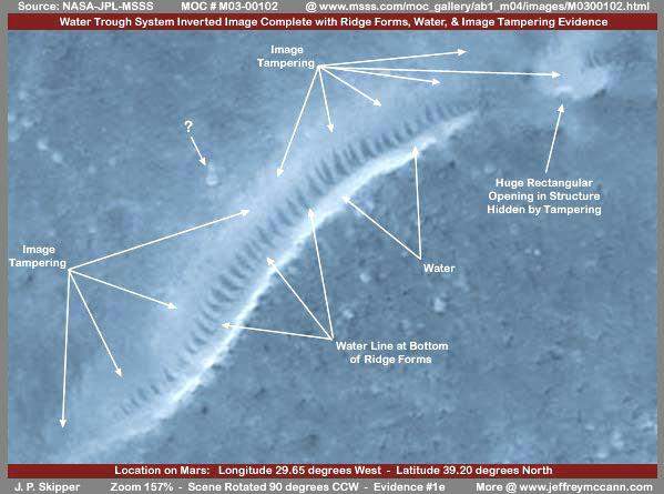El is jutottunk sorozatunk igencsak beszédes, utolsó felvételéhez. Ez az a bizonyos felszíni folyékony vízre vonatkozó bizonyíték, mely a korábbi beszámolókból kimaradt. Ez a felvétel a 100%-os hivatalos felbontásban látható itt, azonban mind vízszintesen, mind függőlegesen megfordítva az első és második felvételen is látható hivatalos JPG, illetve GIF (szinuszoid) felvételhez képest, a forrás pedig ugyancsak az MSSS információs adatbázisa. A harmadik felvétel közvetlen irányultsági GIF fotóból való. Szóval ez a technikai és hivatalos nézet is. Nem szabad erről elfeledkezni, ha az ember összehasonlít különböző felvételeket és azokat nem feltétlen találja egyezőnek. Ami itt látható, az nem más, mint egy hosszú csatorna-rendszer, a bal alsó résztől a jobb felső részig terjedően, a jobb felső negyedében a felvételnek jól látható a felszíni folyékony vízzel való kitöltöttsége is. ez csak egy része a teljes rendszernek, jelen fotón dupla nyilak jelzik a víz áramlásának leginkább szembetűnő szakaszát. A víz sötét ezen a részen, ám ha valaki kissé növeli a fényerőt és nagyobb nagyítást alkalmaz, meggyőződhet annak fényáteresztő-képességéről is, a bordák egyes helyeken ugyanis víz alá kerülnek, főleg a hamisított bal oldali partrészen, egészen pontosan a bal oldali nyíl fejénél. Meglehetősen szilárd bizonyíték a felszíni folyékony víz létezése mellett, nem söpörhető félre, egyben segítségül szolgál annak megértéséhez, mi folyik valójában ezen a területen. Figyeljük meg, a hosszú csatorna bal oldali partját ebből a nagyon nagy távolságból. Nagyon jellemző tulajdonsága ez a hosszú, keskeny csatorna-rendszereknek. Ahol csak felbukkannak ezek a hosszúkás bordavonalak, olykor kígyóformát öltve, akkor szinte biztosak lehetünk abban is, hogy sekély vízzel is találkozunk a térségben, mely ezekről a partfalakról folyik alá a csatorna-rendszer mélyére, egyben a bordavonalakhoz is köthető, így utalva a lejtők hosszára és hajlásszögére. Az alsó vonal, mely minden bordán látható ezen a lejtős területen a kulcs, ami megerősíti, hogy folyékony felszíni vizet látunk a Marson, akár látható a víz maga közvetlenül, akár nem. Igen sokat találhatunk ezekből a bordaformákból szerte a mars lejtőin, annak felismerése, hogy ezek a nyomok felszíni vizekhez köthetők, szükségeltetik a fentiek megértését. Nincs ok aggodalomra, ha nem is sikerül mindezt pontosan felismerni ezen a bizonyos helyszínen, további beszámolókban tömegével lehet olvasni folyékony víz felszíni jelenlétéről, a felvételek tömegének átnézésével a felismerési pontosság gyakorlata is növelhető. Másrészről, a hosszú sötét sáv a felvétel jobb oldali alsó részén, a csatorna-rendszer másik ágában, mely szintén ennek az egész összetett rendszernek a részét képezi, közvetlenül nem láthatóan utal víz, folyékony víz jelenlétére és nem is szabad összecserélni. Félreértés ne essék, teljes mértékben biztosak vagyunk benne, víz található ezen a helyen, azonban a sötétszínű képhamisítási beavatkozások elsődlegesen nyilvánvalóan a civilizációs nyomok eltüntetésére irányultak, egyúttal nem sikerült teljes mértékben eltüntetni a vízfolyásokra utaló nyomokat. Már kutatásaink legelején rájöttünk arra, hogy a Mars bolygó körül keringő műholdak felvételei – az eredetiek legalábbis – valamiféle titkos háttérhatalom kezében vannak, miközben a hivatalosan kiadott MGS MOC képeket oly módon manipulálják, hogy azokon a kutató megpróbáljon vizet találni, ezzel párhuzamosan, azokat a területeket, melyek nem köthetők szorosan sűrűn előforduló civilizációs nyomokhoz, csak kevéssé hamisították meg, vagy egyáltalán nem. Találtunk olyan vízzel fedett területeket, ahol a képhamisítás miatt szinte teljességgel lehetetlen volt felismerni az eredeti állapotokat, ám további hamisítási eljárásokkal éppen azon igyekeztek, hogy mintegy visszaállítsák a víz előfordulása gyanújának koncepcióját. Ugyancsak ezen a helyszínen emlékezzünk vissza az éles körvonalakkal rendelkező, határozott megjelenésű ívelt bordavonalakhoz, miként azok jól láthatók a második és a negyedik képen. A bordák meggörbült alakja ezeken a felvételeken azt a határozott benyomást keltik, miszerint ezek tovább folytatódnak, teljes körré, azaz alagúttá záródnak; miközben igazából illúzió áldozatai vagyunk, a víz tükröződése, illetőleg részbeni fényelnyelése kelti ezt a látványt. Vessünk egy pillantást az ötödik felvétel alsó nyilával jelzett helyre, a rendellenes formák szóban forgó tulajdonságát tükröző elemére mutat. tisztán látható, a bordák irányultságából és megjelenéséből arra következtethetünk, a lejtőre vonatkozó koncepcióval ellentétben, hogy itt bizony kerek formákat látunk. Valószínűleg egyik magyarázat sem állja meg a helyét teljes egészében, nem képviseli a teljes igazságot, merthogy az egész fotócsíkot, mielőtt nyilvánosságra hozták volna, a legjobb felbontású felvételt birtoklók, azon egy nyújtási eljárást alkalmaztak, majd lerontották a felbontást és nyilvánosságra hozták az itt látható eredményt. Ennek a nyújtásnak az eredménye tökéletesen jól látható az elliptikus alakúvá torzult krátereken, és kisebb gödrökön, bármerre és nézünk a fotócsíkon; ezeknek a formáknak viszont kerekeknek kellene lenniük. Szó sincs jelen esetben a lapos rálátási szögből adódó torzulásról! Ez a nyújtási eljárás jelentősen hatott a párhuzamos bordaformákra, kissé meggörbítve azokat, még ki is hangsúlyozza nem egyenes irányultságukat. Ez azonban csak újabb hamisítási megoldás. Fontos tisztában lenni azzal,