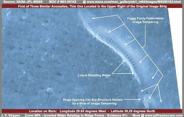 A fenti képen ugyanaz az „alagút” anomália látható, mint az első felvételen, itt azonban nyilak és címkék is láthatók, jelezvén a legfontosabb és legegyértelműbben látható részleteket, ezekből világosan kiderül, jelentésen eltér Hoagland kutatócsoportja és a NASA álláspontjától egyaránt. Nézzük meg alaposan a következő felvételt, mely az előzőnek a negatívja, és semmiben sem tér el attól, csak a nyilakban és a feliratokban. Nos, az előbb bemutatott két képen bárki észreveheti a ravasz elszínezéseket, pacákat, elmosódott foltokat , a részletek teljes elmosását, vagyis a képhamisítást, valamint azt, milyen jellegzetesen különböznek ezek a beavatkozások a szomszédos természetes felszín formáktól. A képhamisítások felismerése nélkülözhetetlen annak megértéséhez, mi folyik valójában a rendellenes „alagút” formák környékén, ahogy minden egyéb más ismeret is fontos a Marson. Ti kedves akadémikus tudósok, ha nem vagytok képesek felismerni ezen a felvételen a hamisítás jeleit, és/vagy nem vagytok képesek megérteni létezését, akkor őszintén sajnálunk benneteket. Ez esetben ugyanis lemaradtok korunk legszenzációsabb felfedezéséről, arról, hogy mi folyik valójában a Marson, és meghagyjátok, nekünk amatőröknek, hogy minderre rájöjjünk. Tényleg ez az amit akartok; és miként akartok majd erről beszámolni az utókornak? Amit itt látunk, az nem pontosan egy völgy, sokkal inkább valamiféle vízzel töltött csatorna, vagy vízelvezető rendszer, esetlegesen mesterségesen kialakítva, egy hosszú kanyon adottságaihoz igazodva. Az eredeti tervek szerint a bal oldala valamivel magasabb lehetett, minek következtében a jobb oldala alacsonyabb. Víz folyik végig az aljzaton, a felszínnél mélyebben fekvő részeken, jobbról-balra. A csatorna, vagy vízfolyás belevág ebbe a természetes földalatti vízfolyásba és vízgyűjtő rendszert formáz. A csatorna bal oldala jól láthatóan függőleges sziklafalban és földgátban végződik, így feltartóztatván a vizet segíti annak összegyűlését. A csatorna nagyjából közepétől, lefelé terjedően, a vízszint kellően magas ahhoz, hogy a szemközi parton elérje a bordasor alját. A csatorna jobb oldalán széles lejtő látható. Újra és úja megnéztük a MOC felvételeit, melyeken sekély vízfolyás látható lejtőn lefelé, ilyenkor minden esetben megtalálhatók a különböző, virágzó és népes telepeket alkotó organizmusok a vízben. Ezek az organizmusok kölcsönhatásban állnak a napfénnyel, a levegővel, a vízzel és a vízben oldott ásványokkal, az ásványokból melléktermékek jönnek létre (feleslegek?), ezek kiszorulnak magából a vízből, létrehozván ezeket a bordavonalakat, melyek mindig a lejtő irányában, a vízfolyás felé mutatnak, a lejtő alja felé. A bordák vízelvezetőként és vízgyűjtőként működnek. Mind a víz sekély volta, mind folyékony halmazállapota egyaránt fontos az itt élő organizmusoknak, talán azért maximalizálják a vízből kinyerhető források (ásványok?) a napfény és a levegő mennyiségét. Minél fiatalabb a lejtő/vízfolyás, annál nagyobb a távolság a bordavonalak között, és annál élesebb és keskenyebb a formájuk, annál hegyesebbek. Érdemes megjegyezni, ez a leírás igen jól illik az Mo4-0291 felvételre is. Minél idősebb a terület és minél tovább folyik át rajta folyamatosan sekély víz, annál szélesebb és vastagabb minden egyes bordaforma, és annál kisebb a köztük lévő távolság; a jelek szerint jelen, M03-00102 felvétel kapcsán éppen ez a helyzet. Azt is vegyük észre ezeken a felvételeken, hogy minden egyes, a lejtőn kialakult bordavonal a közepe táján kiszélesedik, miközben felső és alsó végén elkeskenyedik. A közepe táján kiszélesedő bordavonal azt sejteti, mintha ezen a részén magasabbra emelkedne, mint a végein. Ennek köszönhetően ezek a formák enyhén ívelteknek tűnnek, és amikor felsorakoznak és több látható egymás mellett belőlük, azt az illúziót keltik, mintha a valamiként körré záródnának, ennek köszönhetően jön létre az az érzékcsalódás, miszerint valamiféle alagutat látnánk. A szem a bordaformák tetejére koncentrál és elhanyagolja azt a tényt, hogy a köztük lévő térség továbbra is megmarad síknak. A vonalakra különböző szögből való rátekintés és a fényviszonyok eltérése csak tovább növeli ezt az illúziót.