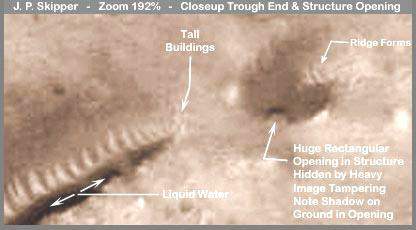 Természetesen ezek a őshonos, természetes marsi életformák nem az egyetlen életformák a Marson. A fenti, az előző képen látható vízfolyás-rendszer egyik végét közelebbről megmutató fotón, a völgy jobb oldali végén, pontosan a felbontás határán, karcsú, ám magas épületeket láthatunk; egyben annak felismeréséhez is hozzásegítenek, mekkora a kép valós léptéke. Még beszédesebb a tekintélyes méretű struktúra szögletes bejárata, melyet egy sötét pacával befedve igyekeztek meghamisítva a felvételt, elrejteni azt. Ám vegyük észre, miként világítja meg a Nap a felszínt, és a bejárat BELSEJÉT, valamint azt is, a bejárat teteje miként emelkedik ki, szögletes árnyékot vetve a bejárat térségére és a talajra is. Nyilvánvaló, ez a fajta nyom egyértelműen civilizációs jellegű, és intelligens életre utal. Arra gyanakszunk, hatalmas ipari létesítményre tekintünk alá, amit igyekeztek elrejteni szemünk elől ezzel a képhamisítási alkalmazással, közvetlenül az említett objektumon és térségében, a vízgyűjtő területen ugyancsak. Közvetlenül a tekintélyes méretű bejárati nyílás előtt igencsak bőkezűen bántak a képhamisítási technikákkal, köztük a szín-manipulációval, a ködösítéssel/maszatolással, magát a vízgyűjtő völgyet is teljes mértékben keresztezve, azt az illúziót keltve, hogy a völgy egy bizonyos pontnál véget ér. Ha valaki azonban közelről megnézi a kép jobb felső sarkában a sötét fedőréteg jobb oldalát, tisztán kivehet két bordavonalat, melyeket kifelejtettek. Ez a két bordavonal sokkal tisztábban látható jelen sorozat második felvételén. A két kifelejtett bordavonal jelenléte és természete egyértelműen alátámasztja a ködös, jellegtelen, elmaszatolt képhamisítási alkalmazások jelenlétét, és azt is, miként képeznek hamis látványt ezáltal, nemcsak azáltal, hogy nem létező, hamis dolgokat jelenítenek meg a felvételen, és rejtenek el valós alakzatokat, de összezavarják és megváltoztatják a perspektívát is. nagyon finoman, nagyon jól és nagyon hatékonyan.