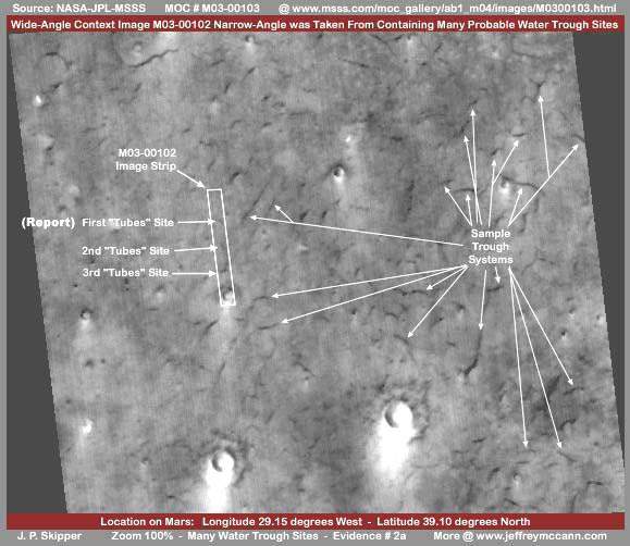 Viszont nem ezek jelentik az egyetlen figyelemre méltó nyomokat a felvételen. Vessünk egy pillantást a nagylátószögű felvételre, az M03-00102 katalógusszámú fotócsíkra alant. A nagylátószögű képen kontextusában láthatjuk az M03-00103 felvételhez képest a kislátószögű M03-00102 fotócsík elhelyezkedését. Jól láthatóak az M03-00102 képcsík szélei, mellette az MSSS hivatkozásaival; ezek alapján könnyűszerrel lehetett azonosítani három, bordavonalakból álló alakzatot. A három közül az első az, amelyiket jelen beszámolóban felhasználtuk. Az ok, amiért az alábbi képet mellékeltük jelen beszámolóban, annak alátámasztása, hogy ilyen vízgyűjtők igen nagy számban fordulnak elő, meglehetősen kiterjedt területen, jól szétszórva. A nyilak mindössze néhányat jelölnek csak ezek közül. Jegyezzük meg, hogy közülük nem kevés jóval hosszabb és nagyobb, mint az, amit jelen fejezetben bemutattunk. Ha feltesszük, hogy a legtöbb vagy esetleg az összes hasonlatos az itt bemutatotthoz, miközben nem szabad elfeledkezni arról sem, hogy civilizációs nyomok kötődnek hozzá, akkor meggyőződhetünk annak potenciális lehetőségéről, milyen mértékű lehet a civilizációs nyomok kiterjedése, már pusztán ezen az egyetlen marsi felvételen is. Miként arról kutatótársunk Jeffrey McCann véleményt mondott - aki szintén felfedezte ezt a felvételt (az elsőbbség azonban Skippert illeti), saját kutatásai során -, szerint százak, hanem ezrek is lehetnek akár ilyen és ehhez hasonlatos létesítményekből, akár messze a mellékelt fotócsík által behatárolt területnél jóval nagyobb térségre kiterjedően. Ha minden egyes hely lakott, miként a most bemutatott annak tűnik, még a hangsúlyos képhamisítási technikák alkalmazása ellenére is megállapítható mindez, akkor lehet igazán fogalmunk, valójában milyen hatalmas népsűrűséggel van dolgunk. Azt is érdemes megjegyezni, valamennyi ilyen terület a talajszint kisebb kiemelkedésénél található, ezek árnyéka is egész jól kivehető. Mindez alátámasztja az itt felvonultatott elképzelést, hogy az árkokat mesterségesen ásták ki, e során pedig a kiásott anyagot az árok egyik felén feltornyozták, feldúrták a természetes talajszint alkotta felszín fölé, valamikor a távoli múltban.