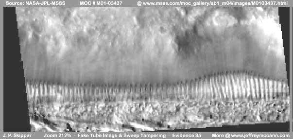 Durva példa az „alagút” illúzió keltésére A következő képet oktatási célokkal helyeztük el itt, szépen látható rajta a szegényes képhamisítási technika és a művészi jellegű illúziókeltés, a képhamisítás révén, miszerint „alagutat” látunk. Amit páracsíkoknak látunk, végig az „alagút” mentén, teljes hosszában megfigyelhetjük itt, a hamisítási szakmában „söprési” technikának nevezik, célja az alatta lévő képi információ teljes elrejtése. Ezt a fajta technikát sűrűn megtalálhatjuk a pamacsolások környékén, távoli síkvidékeken éppúgy, mint nagy kráterek közelében. Az alkalmazások legtöbbjét elég nehéz felismerni, ezen a képen viszont túlságosan is nyilvánvaló. Teljesen felfoghatatlan számunkra, a Mars kutatásával foglalkozó tudósok miért nem emelnek szót ilyen nyilvánvalóan hamisított felvételek kapcsán, és gondolják azt, hogy ez a drasztikus beavatkozás természetes eredetű lehet?