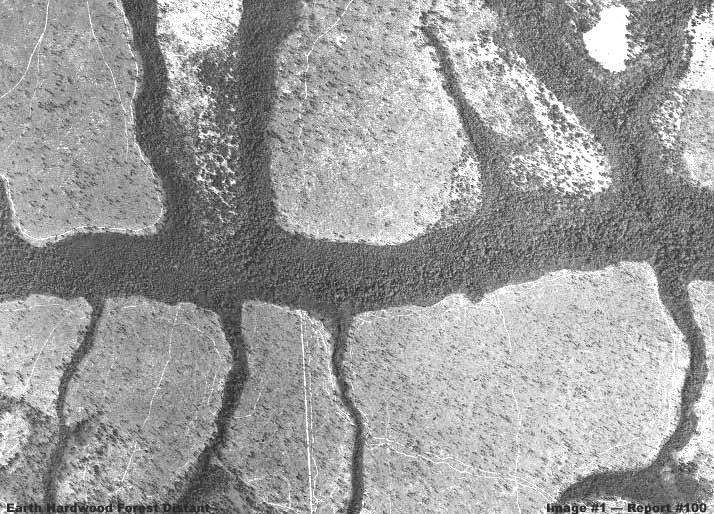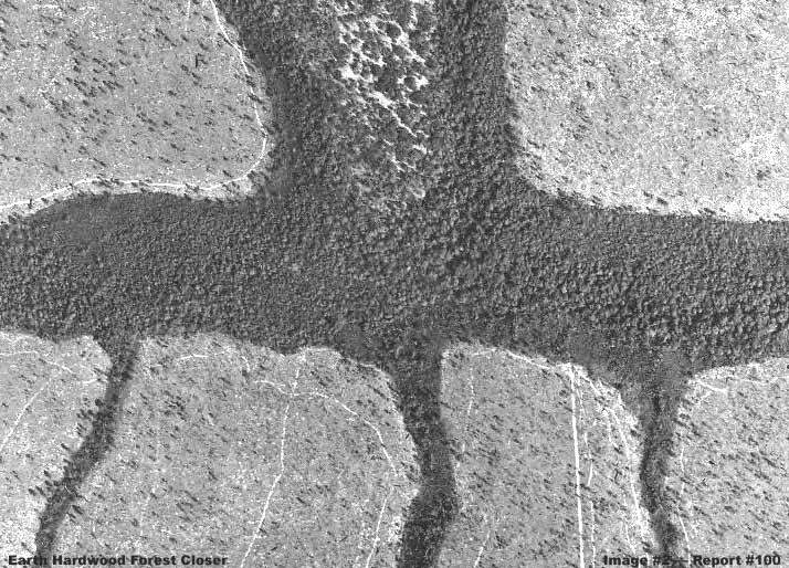 Nos, ezek után nézzük a sorozat első fekete-fehér felvételét, egy távoli képet, hagyományos, fákból álló erdőségről, itt a Földön. Az erdő természetesen sötét színű, a világos színű részek emberek által letisztított mezők, vagy legelők. Azért választottuk ezt az 1940-es években készült felvételt, mert a fák túlnyomó többsége meglehetősen élemedett korú, az erdőség megjelenése más, mint a kiirtott-újratelepített területeké, a maguk sokkal fiatalabb fáival, ezért az előbbiek sokkal jobban összehasonlíthatók a marsi erdőkkel, azok ugyanis szintén idős egyedekből állnak, terebélyesebb méretekkel rendelkeznek, következésképpen beazonosításuk is egy kicsit könnyebb, még ezen a szerény felbontáson is, miként a marsi űrszondás felvételeket a számunkra elérhetővé teszik. Továbbá, azért választottuk ezt az egyedi párosítást a Földről, egymást mellett a nyílt mezőt a nagy sűrűségű erdőséggel, ugyanarról a területről, hogy demonstráljuk azt az egyszerű tényt, miszerint és rávilágítsunk arra, hogy a minél csupaszabb a természetes vagy mesterségesen kialakított felszínnek (mezők, legelők, koszos utak, stb.), jóval nagyobb a fényvisszaverő-képessége, összevetve az élő erdőséggel, ez utóbbi messze sötétebb; a pusztulófélben lévő, vagy lombhullató vadon viszont megváltozhat színében, világosabb lehet, a sötétebb szín a túléléshez és fennmaradáshoz szükséges napfény nagyobb arányú elnyeléséből fakad. Gyakran éppen itt rejlik a megértés kulcsa, miszerint erdőséget látunk, vagy természetes geológiai felszínt. Amikor az erősebben fényvisszaverő felszíni részletek hiányoznak, fontos a közelebbi vizsgálat, nem állunk-e esetleg növénytakaróval szembe – már persze ahol ez lehetséges -, és az rejti el előlünk a felszíni részleteket. A földi erdőséget ábrázoló felvétel különös és drámaian izgalmas is egyben, mivel az sűrű erdőség egy ősrégi, vízfolyás-rendszer által kivájt völgyhálózatban található, nemcsak egyszerűen valahol, egy széles, nyitott térségben, folyamatos takarót alkotva. A kép közepén áthúzódó szélesebb vízfolyás-rendszert kisebb oldalágak táplálják, csatlakozva hozzá, kialakítva a rendszert. Emberi beavatkozás révén, valamikor a távoli múltban, letisztultak a magasabban fekvő területek többségben, ehhez bizonyára valamiféle kezdetleges technikát használtak, mezők-legelők kialakítására, mára azonban a folyamat megfordult, a világosabb területek kezdenek visszaalakulni eredeti, erdőségekkel fedett formájukra, már megjelentek a nagyobb cserjék, elszórva a fák is feltűntek már, azonban elmondható, az erdőség ősi formája a maga durvább és nehezebben járható megjelenésével megmaradt a mélyebb területeken, a vízfolyások-rendszere mentén, miként az jól látható ezen az 1940-es években készült felvételen. A vékony, kacskaringózó és olykor viszonylag egyenes vonalak nagy fényvisszaverő-képességű, piszkos, keskeny, utak, különböző minőségben és más-más elhasználódási mértékben. Az említettek azt támasztják alá, hogy a csupasz geológiai felszín, a szilárd összetevőkből felépülő talaj, rendelkezik a legerősebb fényvisszaverő-képességekkel valamennyi dolog közül. A természetes geológiai felszínre vonatkozó ezen tényező rendkívüli fontossággal bír, igazságtartalma általános, legyünk akár a Földön, akár a Marson, mindez különösképpen igaz a fekete-fehér felvételekre. Feltétlen tartsa szem előtt ezt az észrevételt, amikor a marsi műholdas felvételeken egyhangú, kicsiny fényvisszaverő-képességű, tintafolt jellegű, részleteket nem tartalmazó füstpamacs-szerű vagy ködszerű foltokat látunk, melyek „bizonyítottan” geológiai alakzatok. Pontosan ez a tényező a megértés kulcsa, amikor az igen elterjedt képhamisítási alkalmazások kerülnek elénk, ezek egy része geológiai formákat próbál utánozni, ahelyett, hogy valós felszíni részleteket másolnának. Bár ez utóbbi lehetőséggel is élnek. Szeretnénk felhívni a figyelmet arra, hogy az első felvételen látható, a Földön készült felvételeken, a sötét terület minden esetben rendkívül sűrű, idős fákból álló erdőséget mutat, nem keverendő össze a szintén sötét színű, vízfelületeket ábrázoló részekkel, habár e vízfelületek területén is nőhetnek fák, sőt, előszeretettel fordulnak elő vízfolyások területén, ezzel éppenséggel megerősítve magának a vízfolyásnak a létét; a tömött erdők igen nagy magasságból hasonló képet mutatnak, mint a vízfolyási-rendszerek. Ha továbbra is jelen van víz ezekben a lefolyási rendszerekben, azt teljességgel lehetetlen észrevenni, hiszen tökéletes mértékben lefedi a tekintet számára áthatolhatatlanul sűrű erdőtakaró; tipikus jelenség a földi öreg fák alkotta dzsungelekre, de a Marsiakra is, miként az kiderült. Továbbá, ugyanez a helyzet minden olyan esetben, ahol a természetes geológiai felszín nem látható, ahol a láthatóságot a szem számára áthatolhatatlanul sűrű erdőtakaró akadályozza. E megjelenés tipikus a nagyon idős, sötét színű erdőtakaró esetén, ahol a legagresszívabban növekvő fa-típusok hajlamosak mindent elfedni és minden mást kiszorítani, beleértve egymást is, a napfényért folytatott versengésük során, minél hosszabb ideig fürödhessenek életet adó energiájában. Ez a bizonyos erdőtakaró, befedvén a természetes szilárd geológiai felszín mintázatát, egyben eltakarván az erősebben fényvisszaverő altalajt; éppen az erősebben fényelnyelő tulajdonságai miatt megkönnyíti azonosításukat a marsi hagyományos erdők vonatkozásában. Ezt mindig szem előtt kell tartani.