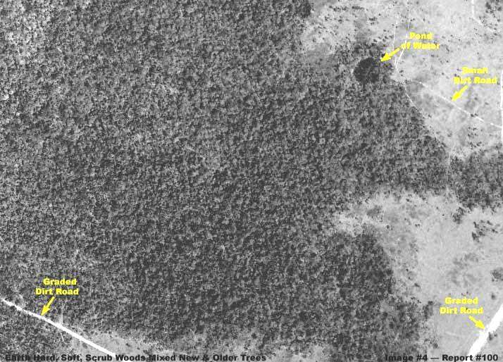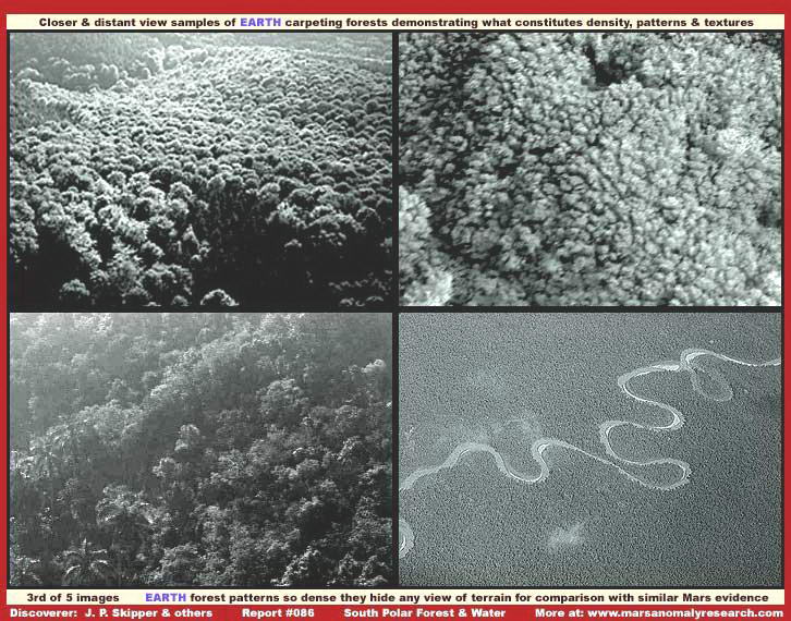 A fenti negyedik felvétel kissé különböző erdőséget mutat, az alatta húzódó felszín kissé egyenletesebb, simább. A növényzet keveréket alkot, néhány öreg, és számos fiatal példány elegyét. A helyszín fenyőfák kereskedelmi forgalmazásával foglalkozó országot ábrázol, ezen a helyszínen pedig kemény fákat, valamint puha fákat, mint például fenyő, bozótos, és talán a hidegebb idő ellenére is néhány pálma található, valamint megfigyelhetők még a korábbi fakitermelések miatt kiírtott területek is. vegyük észre, az erdőség textúrája kissé különbözik az első három felvételen látható textúrától. Azt is vegyük észre, ott ahol az erdőség a legsűrűbb, jelentősen különbözik látványa a fényt sokkal jobban visszaverő természetes felszíntől, ráadásul, ahol az erdőséget látjuk, a felszín nem bukkan elő, lefedvén és eltakarván a növénytakaró által - elrejtőzik előlünk. Az első, és a legfontosabb felismerés az, hogy az erőség felismerhetőségi tényezői közül alapvető fontosságú az a faktor, mely szerint sötét, tintaszerű, a fényt kevéssé visszaverő megjelenést mutat - minél idősebb a növényzet kora, annál sötétebb a megjelenése -, a növénytakaró lefedi és eltakarja előlünk az eredeti, jóval nagyobb fényvisszaverő-képességű természetes felszínt, emiatt pedig az nem látható. Amennyiben a felvételeken megjelenő felszín inkább fényelnyelő, mint fény visszaverő tulajdonságokat mutat, azonnal és jogosan növénytakaró jelenlétére gondolhatunk, főleg akkor, ha a földi erdőségeknél megjelenő pacás jellegű mintázatot szintén megtaláljuk. Ha pedig így van, ez egyben a felszíni alakzatok kontúrjának és elmosódásával, illetve a felszíni alakzatok teljes hiányával jár. Emlékezünk rá, ha a feltételek kedvezőek, régen kialakult és hosszú ideje sikeresen fennmaradó erdőség egyedei régóta versenyeznek a minél több napfény megszerzéséért, ennek köszönhetően a kevésbé agresszív növényzet tömegeit szoríthatják háttérbe, mintegy szőnyeget képezve fölöttük, rájuk nőve, bekerítve azokat, egyúttal mindent, még a kisebb krátereket is képesek teljesen eltüntetni, valamint az összes, vagy legalábbis majdnem az összes, felszíni részletet. Emlékezzünk csak vissza az igen magas templom épületekre Közép- és Dél-Amerikában, az emberek pusztító tevékenységének megjelenése előtt tökéletesen rejtve maradtak a dzsungelben. Erre képes az erdőség, amennyiben háborítatlanul fejlődik és tenyészik. Egyszóval, a fenti, negyedik felvétel, egyfajta összehasonlító tényezőként szolgál az első faktor figyelembe vételére. Most pedig tekintsünk át néhány marsi helyszínű erdőségre utaló nyomot az alábbiakban. Jobbnak látszott egyetlen beszámolóba összekapcsolni a teljes elemzést, mint felosztani a témát, így a szöveg elemzése közben bármikor vissza lehet térni a földi megfelelők áttekintéséhez, könnyebbé válik az összehasonlítás.