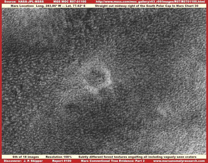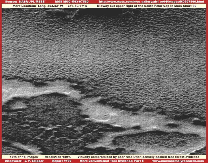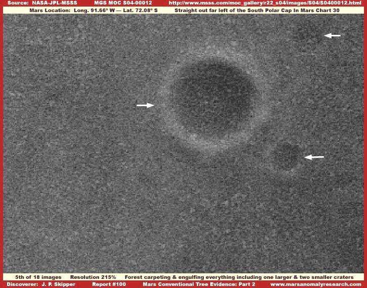 A fenti, ötödik felvétel, a Mars hagyományos, fákból álló, erdőségei közül mutat be példát, összehasonlításképpen a földi erdőségekkel. Mint valamennyi, marsi erdőségre vonatkozó felvétel, ez is a Déli Pólus térségének közeléből származik. Az eredeti 804-00012 hivatalosan kiadott fotócsík számos felbontási problémával rendelkezik, emellett a szokásosnál is keskenyebb, ezért kissé fel kellett nagyítani, hogy az itt megszokott szélességben egyáltalán be tudjuk mutatni. Elég szegényes a felbontása, ezért a nagyítás során pixelezettségi problémák jelentkeztek, a kép teljes területén. Ez teljességgel nyilvánvaló. Egy oka van, hogy ezt a szerényebb felbontású felvételt elhelyeztük itt, mégpedig annak bemutatása, mennyire szerény az az anyag, amivel kezdenünk kell dolgozni, milyen hatékonyan alkalmazza rajta a képhamisítási módszereket, mindenekelőtt a felbontás szándékos lerontását, az egyes egyedeket tekintve kicsiny, ám tömeges megjelenésüket figyelembe véve kiterjedt nyomok estében. A felbontási problémák ellenére a számos egyedi objektum jelenléte mégis lehetővé teszi finomabb részletek felismerését, biztosak lehetünk benne, hogy a legtöbb olvasó el tudja végezni az összehasonlítást a korábbi fotókkal, és fel tudja ismerni, valójában mi is az, amit lát, a képhamisítás ellenére is. Vegyük észre, a felvételen nyoma sincs a fényt erősebben visszaverő természetes felszíni alakzatoknak a fotócsík alsó részén, annak ellenére, hogy a fotócsík – itt be nem mutatott - felső részén jól megfigyelhetően jelen vannak. Érdemes egy pillantást vetni az eredeti fotócsíkra, az itt mellékelt címen érhető el, http://www.msss.com/moc_gallery/r22_s04/images/S04/S0400012.html - jó megerősítést lehet kapni a fényvisszaverődési viszonyokról, a felső rész természetes geológiai felszínéről. Megjegyzendő, hogy e helyszínen viszonylagosan minden sötétebb, és jobban fényelnyelő. Figyeljük meg a csomós szerkezetű, de általánosságban egységes mintázatot; a felbontási korlátozások ellenére is jól átjön. A másik ok, ami miatt ezt a felvételt elhelyeztük itt a három kráter jelenléte; ezek viszonylagos törést okoznak az egyenletes, mindent lefedő mintázatban. Egy nagyobb és két kisebb kráter látható, fehér nyilak mutatnak rájuk. Jól figyeljük meg, mennyire pontosan ugyanaz a csomós mintázat látható a teljes képrészleten, mintegy átgördülve a kráterperemek felett, bármiféle megszakítás nélkül, majd tovább, kitöltve a kráterek belsejét. Nem másról van szó, mint a korábbról már megismert, ősöreg fákból álló növénytakaróról, mely alaptulajdonságából adódóan mindent befed és eltakar, beleértve a jóval magasabb fényvisszaverő-képességű természetes geológiai felszínt, oly mértékben, hogy abból semmi sem vehető ki; belepi még a viszonylagosan magasra kiemelkedő kráterfalakat is, ahol pedig azt várnánk, hogy az erdőség sűrűsége némileg kisebb. A megfigyelhető nyom egyenletessége, és mindent elfedő tulajdonsága, beleértve még a legnagyobb kráter magasra törő kráterfalait is, egyértelmű bizonyítékul szolgál arra nézvést, hogy öreg fákból álló, igen agresszíven növekedő, sűrű erdőséggel van dolgunk, melynek egyedei már igen régóta versengenek a minél több napfény elnyelése érdekében. Az itt bemutatott példa beszédesen szól arról, hogy a kiterjedt marsi erdőségek, miként ez is, továbbra is egyértelműen beazonosíthatók bizonyos esetekben a képhamisítási alkalmazások jelentős alkalmazása ellenére is, legalábbis azok típusától függően. A Kedves Olvasó talán arra is gondolhat, hogy az itt bemutatott felvétel a Mars hagyományos erdőségeiről, elszigetelt jelenséget képez, ritkaságszámba megy a Mars Déli Pólusának környezetében, ha viszont meglátogatja az eredeti S04-00012 kislátószögű hivatalos fotócsíkot a fentebb található linken, érdemes összehasonlítást tenni a széles látószögű S04-00013-as számú felvétellel, ahol az előző, kislátószögű kép szélesebb kontextusban tekinthető meg, az előző kép jobb oldalán. Alaposan vegyük szemügyre a szélesebb környezetet a nagylátószögű fotón, ezen jól látható a napfényt erősebben elnyelő terület kiterjedt foltja, körben, a sarkvidék körül. Az ebből levonható következtetés, miszerint kiterjedt növénytakaróról van szó - teljességgel egyértelmű.