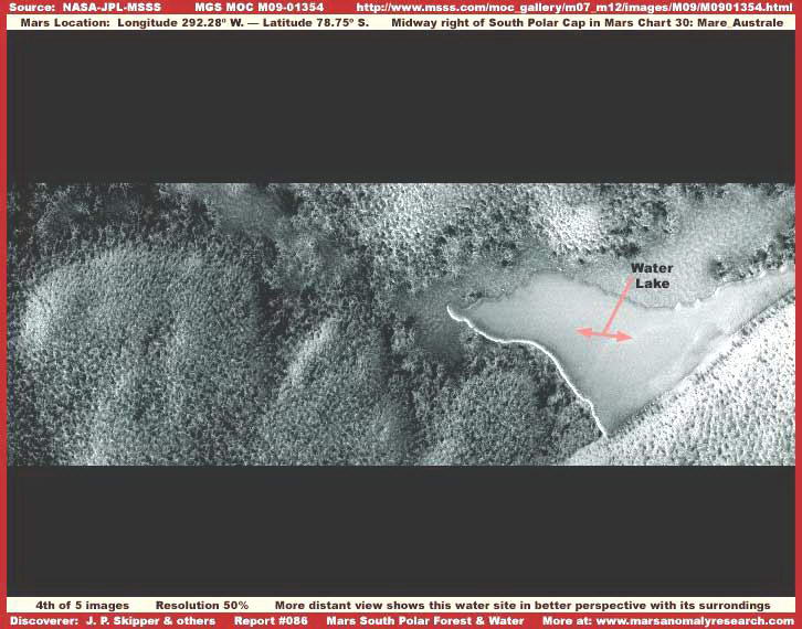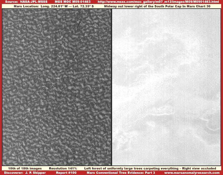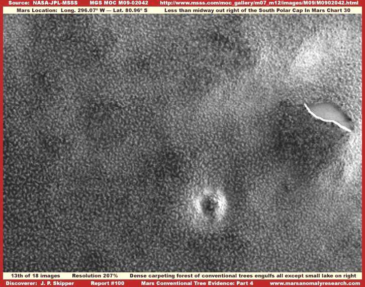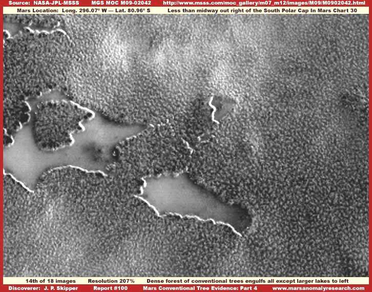 40. A Mars Déli Pólusának erdőségei és víz jelenléte Hosszú ideig várakoztunk ennek a nyomnak a nyilvánosságra hozatalával, mert nem számít a legegyértelműbbnek ezen a területen, nem lehet nagy biztonsággal eldönteni, a levezetés helyes vagy sem, hiszen a marsfotók kutatásának kezdetén az elemzők még tapasztalatlanok voltak, nem tudták pontosan felismerni a képi információk jelentését és jelentőségét. Azonban jó néhány év gyakorlatot követően meglehetős rutinra lehet szert tenni az elemző munkában, általánosságban, ezért nagy bizonyossággal jelenthetjük ki, az itt olvasható beszámolók többsége helyes úton jár.