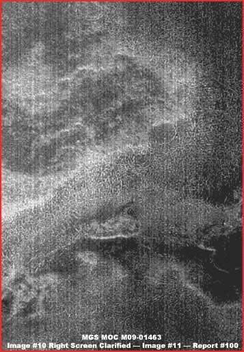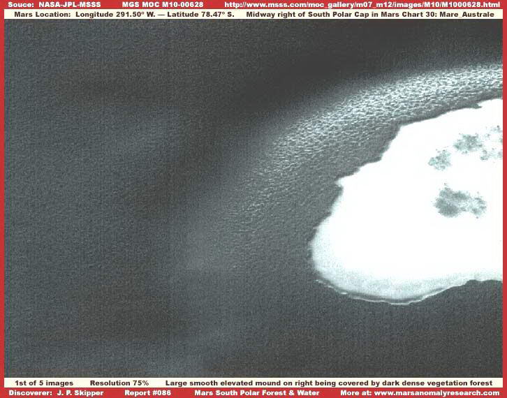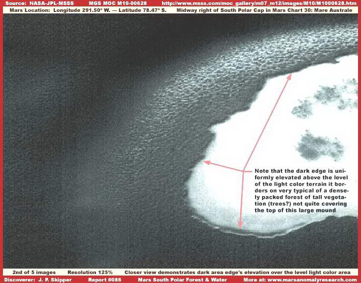 A fenti, első kép az MGS MOC M10-00628 archívumszámú fotócsíkból való, a Déli Sarki jégsapkától nem túl nagy távolságra, ahol sűrű sötét erdőség takarója fedi be a felszínt, egészen a felvételen látható domb tetejéig. Távolról pillanthatunk a tájra, az erdőség takarója pedig túl sűrű ahhoz, hogy egyedi példányokat vagy fákat megpillanthassunk, nem érdemes tehát keresni ilyen részleteket. A nagy távolság és a hivatalos felvétel alacsony felbontása megakadályoz bennünket a sötét takaró mindenféle részletnek megvizsgálásában, s joggal feltételezhetjük, éppen ez a szándék. A napfény visszaverődése az emelkedő felszín egy részén a sötét háttér mellett, szintén arra utal, hogy igen nagy sűrűségű növényzet adhatja ki ezt a sötét masszát. Talán így is lehetne, azonban a file viszonylag kis méretéből arra következtethetünk, egyfajta illúzióval állunk szemben, amit valószínűleg a kis felbontás okoz, és egyáltalán nem tűnik geológiainak (sziklák) vagy mesterséges eredetűnek. Majdnem biztosak lehetünk tehát abban, hogy erősen fényelnyelő erdőséget látunk, sűrű növényzetet (fákat), azaz valamiféle biológiai életnyomokat. Mindenféleképpen figyelemreméltó a sötét tömeg egyenletesen csomós mintázata, valamint az is, milyen agresszíven maga alá temet mindent, miként követi szorosan a talaj domborzatát. Tipikus példáját láthatjuk a vadon burjánzó erdőségnek, ahol a napsugárzás minden egyes négyzetcentiméterének megszerzéséért kiéletezett harc folyik már igen hosszú idő óta, mindennek eredményeként csak a lombsátor tetejét láthatjuk. A világos színű, erősen fényvisszaverő terület az alacsony hegy tetején mintegy szakadást jelent a sűrű és egységes növénytakaró szőnyegében; minden valószínűség szerint sekély tavacskát láthatunk, mely azért elegendően mély ahhoz, hogy az erdőség ne legyen képes elfoglalni azt. A felszínét azonban igen erősen kivilágosított, igen sűrűn szemcsézett hamisítási réteg tagkarja, mindenféle részletet kimosva a képből. Ez a fajta képhamisítás, mely a megfigyelhető sima felszínt eredményezi, igen gyakran megfigyelhető a nagyszámú marsfelszíni vizes térségekben. Arra gyanakszunk, hogy az eredeti felvételen tisztán, a fényt igen erősen visszaverő vízfelszínt láthatunk, mely könnyen azonosítható a viszonylagos sekély mivolta, és a területén látható szigetek miatt, ezeken bizonnyal fák növekednek, jól azonosíthatóan bárki számára. A képhamisítás alkalmazása meggátol minket a részletek felismerésében, szinte tökéletesen elrejtve a szigeteket és rajtuk a fákat. Ez a távoli, kis felbontású és hamisítási technikákat bőven tartalmazó felvétel meggátol bennünket abban, hogy kellően közeli pillantást vethessünk a tájra, hogy beazonosítsuk a növényzetet magát, azonban nem elegendő a hepe-hupás, sötét felszíni mintázat eltüntetéséhez, mely kifejezetten jellemző a sűrű erdőség lombkoronáinak tetejére, jelen esetben pedig kellő annak eldöntésére, mit is látunk itt valójában. Továbbá, a szabálytalan körvonal a sötét tömeg és a világos terület között alátámasztja, a sötét tömeg egységesen kiemelkedik az általános magasság fölé, emiatt a fényes területet könnyedén beazonosíthatjuk, mint partvonalat. Úgy gondoljuk, a titkosítási hivatal szemszögéből vizsgálva a dolgot, ezt a látványt egy előre programozott, képhamisítást végző számítógépes program hozta létre. Sokkal gyorsabb és alaposabb, mint amire egy ember valaha is képes lesz, az ilyen jellegű tudományos adatok átnézésében - viszonylagosan rövid idő alatt. A program végigfut a felvételen, minden létező dolgot megvizsgál rajta (sokkal jobb felbontás mellett, mnt amire nekünk lehetőségünk van), aztán felviszi a maga fedőrétegeit, ennek a feltárómunkának az eredményeként - beleértve a színek megváltoztatását is. Az egész technológia természetesen nagyszerűen működik, ám bizonyos esetekben, mint például itt is, mégsem elegendő teljes mértékben. Mivel sokkal jobb felbontáson dolgozik, mint ami a nyilvánosság számára elérhető, a program külön kezeli a sötét és a világos területeket, ezért különböző hamisítási eljárást alkalmaz, ennek eredményét láthatjuk. Ez a közeli térképezési technika megőrzi általában a színárnyalatokat, az egységesen csomós felszíni mintázatát az erdőség tetejének, a természetes, ám szabálytalan, de élesen kirajzolódó partvonalat, és a magassági síkokat, valamint a felszíni víz fényes területeinek színárnyalatait. Bármiféle felismerhető részlet rejtve marad előttünk, de nem így a főbb árnyalatok, a mintázat és a textúra.