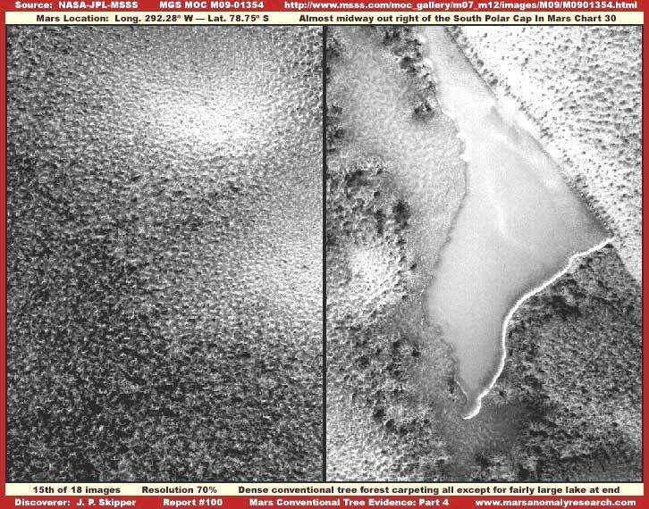 A fenti, tizenötödik felvételen ismét osztott képet láthatunk, a bal oldalon a már jól ismert hagyományos erdőséget, jobbról pedig egy további, nyíltvizű tavat magába foglaló területet; ugyancsak az eddig már felhasznált fotócsíkból kivéve, az eddig alkalmazott felbontáson. Az erdőtakaró lombozata a bal oldalon mostanra már egyértelműen meggyőző erővel kell hogy hasson, a maga mindent elrejtő és betakaró, a felszíni geometriai formákat tökéletesen elrejtő megjelenésével. A kép jobb oldalán a tó kissé ki van simítva a lerontott felbontás és képhamisítási technikák alkalmazása által. A tó jobb oldalán látható világos színű terepvonal, valamint a tó felső végénél, egyaránt súlyos képhamisítási alkalmazásokon átesett területek, sokkal jelentősebb mértékben, mint a nevezett területektől balra eső részek. Habár ez a bizonyos tó a hivatalos fotócsík legvégén található, és a szárazföldből csak kicsiny rész látható itt, a képből kiolvasható egyéb jelek egyértelműen utalnak arra, hogy hosszú, éles határvonalakkal rendelkező, széles átmeneti zóna található a tó mindkét végén, a tó felső részén pedig tisztán kivehető, hogy két felvételt illesztettek össze, viszont az egyes részeken alkalmazott képhamisítási eljárások nagyban különböznek egymástól, az átmeneti zóna két végét illetően. Miközben az átmeneti zóna, fent a jobb oldalán a partvidéknek, kapta a legnagyobb arányú képhamisítást, szinte pontosan ezen a részen, a tó vize láthatóan nem reagált különösebben erre a beavatkozásra, látványa meggyőző, a képfelbontás lerontása ellenére is. Mint jól látható, a tóban lévő víz ismét csak folyékony halmazállapotúnak tűnik, mindazokkal az egyedi jelekkel, melyeket fentebb leírtunk, összevetve a hivatalosan kiadott ismeretekkel, beleértve a gazdagon burjánzó erdőséget is. Erről a helyről olvashatunk még „A Mars Déli Pólusának erdőségei és víz jelenléte” – című beszámolóban is, mindez leellenőrizhető ott a negyedik és az ötödik felvételen. Ezenkívül, a harmadik képen ott négy további földi példát láthatunk, a lombkorona megjelenése igencsak beszédes, pláne, ha összevetjük a jelen beszámoló földi erdőségeket bemutató felvételeivel, és jól összehasonlítható a jelen beszámoló további marsfelvételeivel. Nos lépjünk ismét tovább. Az elkövetkező igazolások nem olyan erősek, mint a korábbiak, nem oly tökéletesen mérhetők össze földi megfelelőikkel, ám továbbra is igen erős bizonyítékokkal szolgálnak, mély betekintést nyújtanak, és a saját módjukon tovább fényesítik a marsi erdőségek mellett szóló bizonyítékokat, legalábbis azt a fajtáját illetően, melyik fákből áll, s ezért mindenki számára ez jelenti a „hagyományos” erdőség fogalmát.