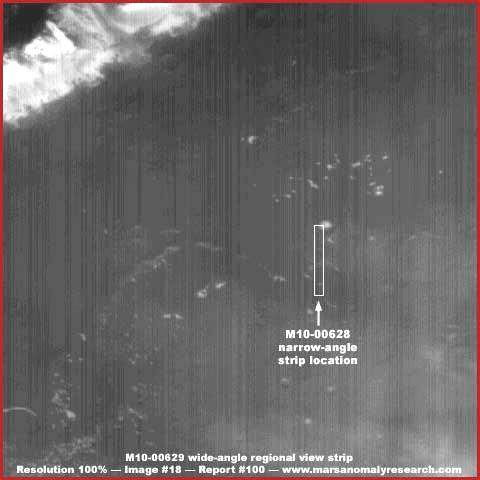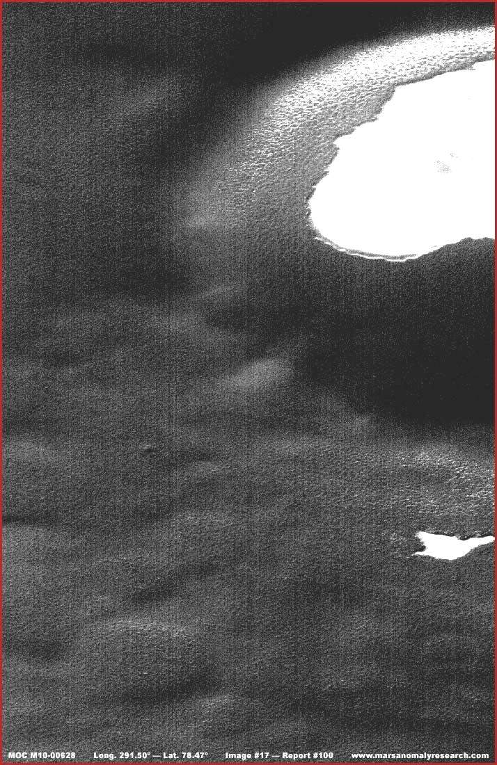 A fenti, második felvétel kissé közelebbi rálátást ad a helyszínre, és egyben kissé rosszabb felbontású is. Az eredetileg is gyenge felbontás miatt, nem sokkal ad több információt, mint a távoli kép. Azonban, ami mégis látható, az a sötét terület széle, ahol találkozik a világos színű, a fényt jelentősen visszaverő, egységesen alacsonyabban fekvő területtel. A látvány meglehetősen tipikus mindazokban az esetekben, ahol az erdőség közvetlenül eléri a partvonalát egy víztömegnek, melyre nem tud ránőni. Azok számára, akik esetleg mindezt átgondolják, talán lehetségesnek tartják, de nem teljes valószínűséggel, hogy a világos színű terület esetleg képhamisítás, valamilyen sokkal inkább mesterséges, mint természetes dolog elrejtésére. Azonban a szemcsés, ám egyenletes felületű mintázata a képhamisítási technika megjelenésében a világos színű felületen arra enged következtetni, hogy ezt a réteget egy sima felszíni területre vitték fel, mely ugye tipikusnak mondható sekély bemélyedésben összegyűlt vízfelület esetében, mintsem kiemelkedő formáknál. Továbbá, a szabálytalan, ám határozott körvonal a sötét és a világos részek között, sokkal tipikusabb erdőség és vízfelület partvonalának természetes határán, sokkal inkább, mint mesterséges struktúrákból kialakított, szervezett rendszer esetén. A legfőbb döfés az M10-00628 fotócsík bemutatásával annak hangsúlyozása, hogy valóban élő, biológiai eredetű erdőség található a Marson, mely közrefog egy tavat, ez pedig nem spekuláció a színek játékával, hanem kőkemény tény. Mindezt csak azért említjük e helyszín kapcsán, hogy némiképp valóságosabb rálátást adjunk rá, és lehetőleg csökkentsük a képhamisítás által okozott, a vízfelszín felismerhetőségét befolyásoló, illúziókeltő hatást. Ne felejtkezzünk el róla, a képhamisítási eljárásnak a nyomai igen szembeötlőek, jelen esetben felszíni vízfelületről van szó, amit jobbnak láttak elrejteni. Mindeközben, miközben e felett a bizonyos helyszín és a víz felett érvelünk, akik jobban érdeklődnek a helyszín iránt, megvizsgálhatják az eredeti fotócsíkot a következő címen: http://www.msss.com/moc_gallery/m07_m12/images/M10/M1000628.html, itt bárki ellenőrizheti és alaposabban elemezheti az elmondottakat, hogy valóban erdei élet nyomait láthatjuk; fontos még azzal is tisztában lenni, amint a hivatalosan kiadott fotócsíkot lefelé görgetjük egészen az aljáig, felbukkan egy, súlyos képhamisítási eljáráson átesett, s ezért nehezen felismerhető folyórendszer. Nem nevezhető éppen a világ legjelentősebb bizonyítékának, részben azért, mert a felvétel megdolgozáson esett át, emellett igen szegényes felbontású is, azonban ott van a képen, s az érdeklődők megpillanthatják.